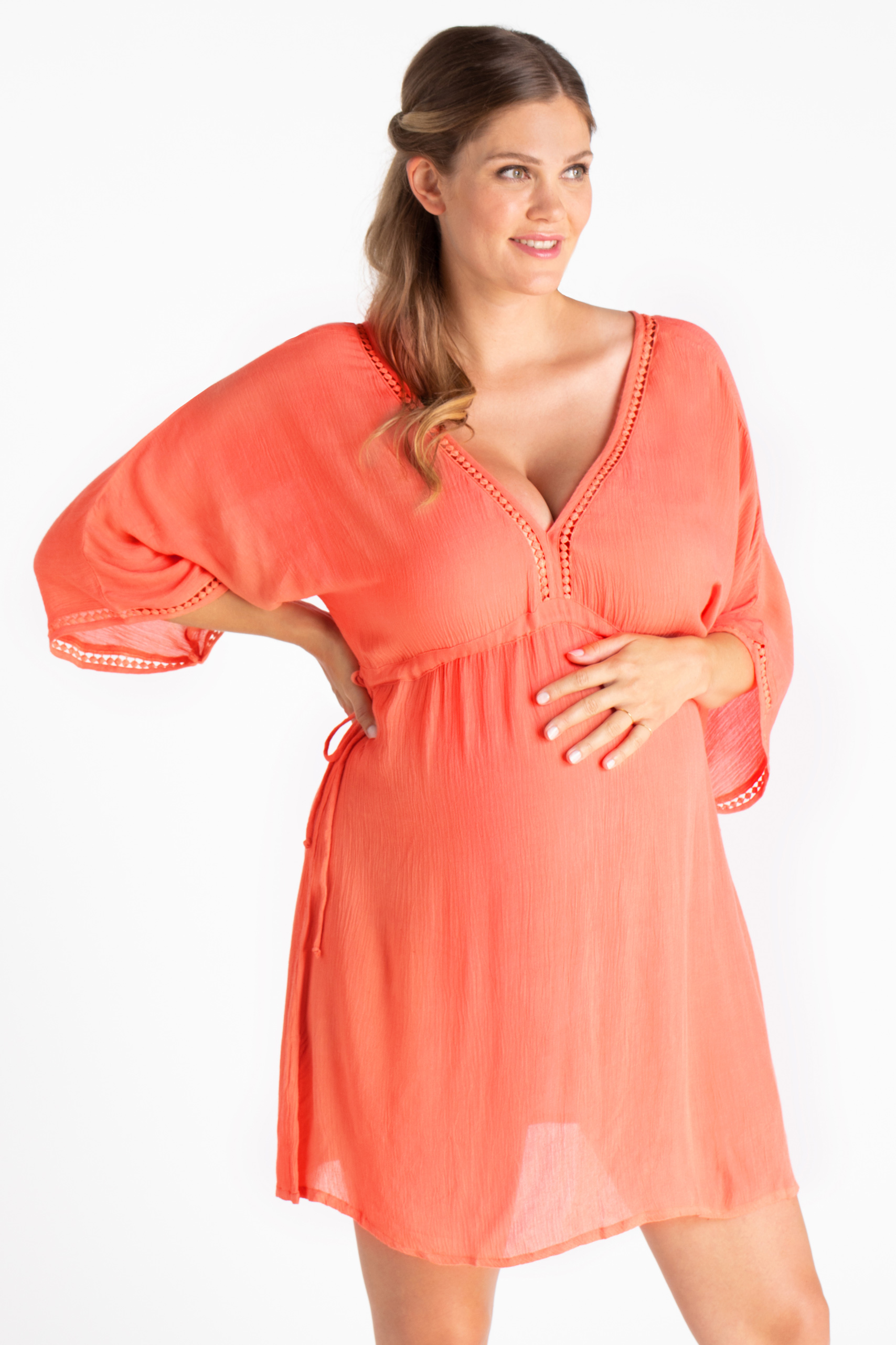 Kurzer Umstands-Kaftan aus softer Crepe Viskose mit Pompomborte am beidseitigen V-Ausschnitt und an den Ärmelbündchen. Eine Bindung unterhalb der Brust sorgt dafür, dass die sommerliche Tunika immer perfekt sitzt und dir eine vorteilhafte Silhouette verleiht, egal in welchem Trimester du sie trägst. Das leichte Material ist atmungsaktiv und besonders weich. Der Kaftan eignet sich perfekt, um ihn am Strand oder Pool über deine Bademode zu ziehen. Ein Must Have in deinem Reisekoffer, nicht nur während sondern auch noch lange nach der Schwangerschaft. Farbe: koralle
