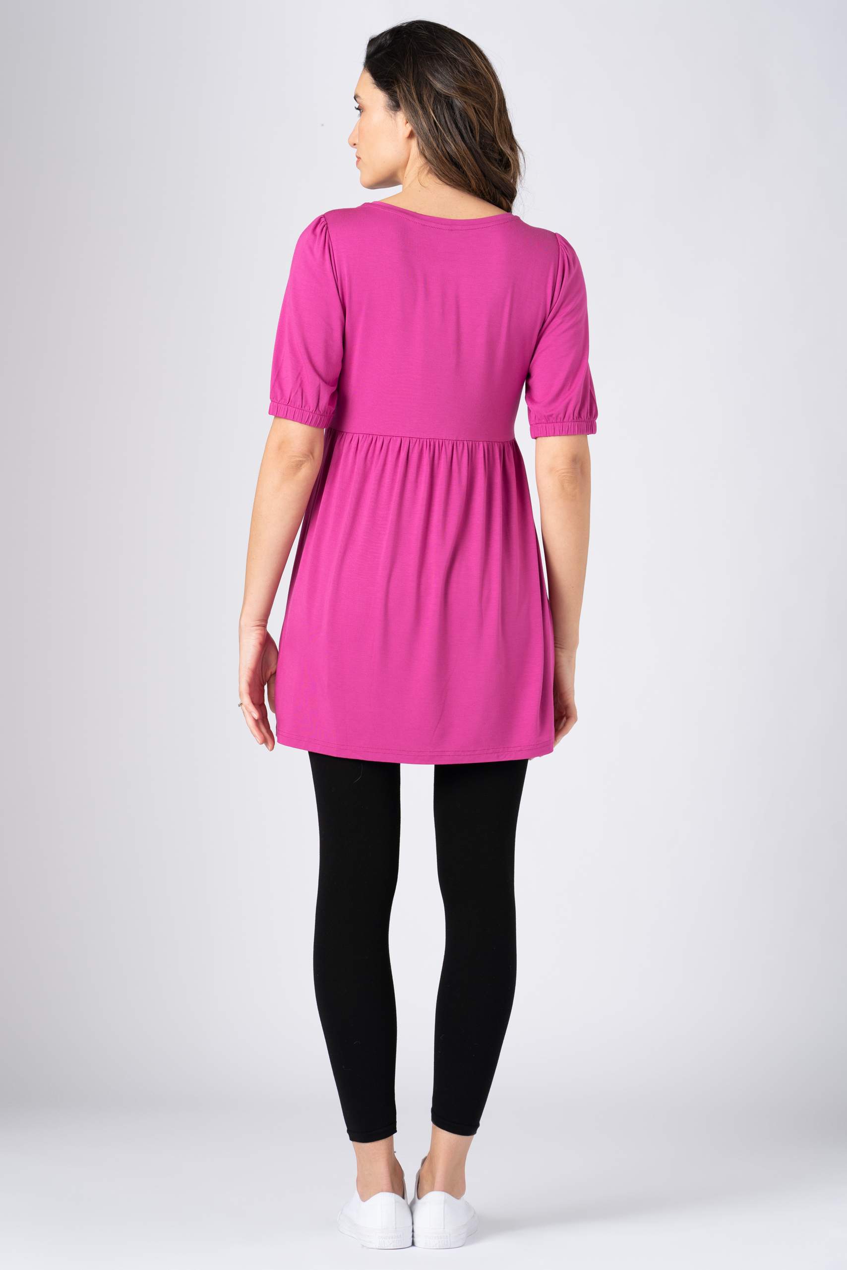 Umstands- und Stilltunika aus softem, dehnbarem Material mit V-Ausschnitt und kurzen Puffärmeln. Der Schnitt und Raffungen unter der Brust sorgen dafür, dass dein Babybauch bis zur Geburt darin wachsen kann. Zum Stillen später schiebst du einfach das Oberteil hoch, darunter befinden sich versteckte Stillöffnungen. Auch nach der Stillzeit kannst du die Tunika noch prima weitertragen. Farbe: fuchsia