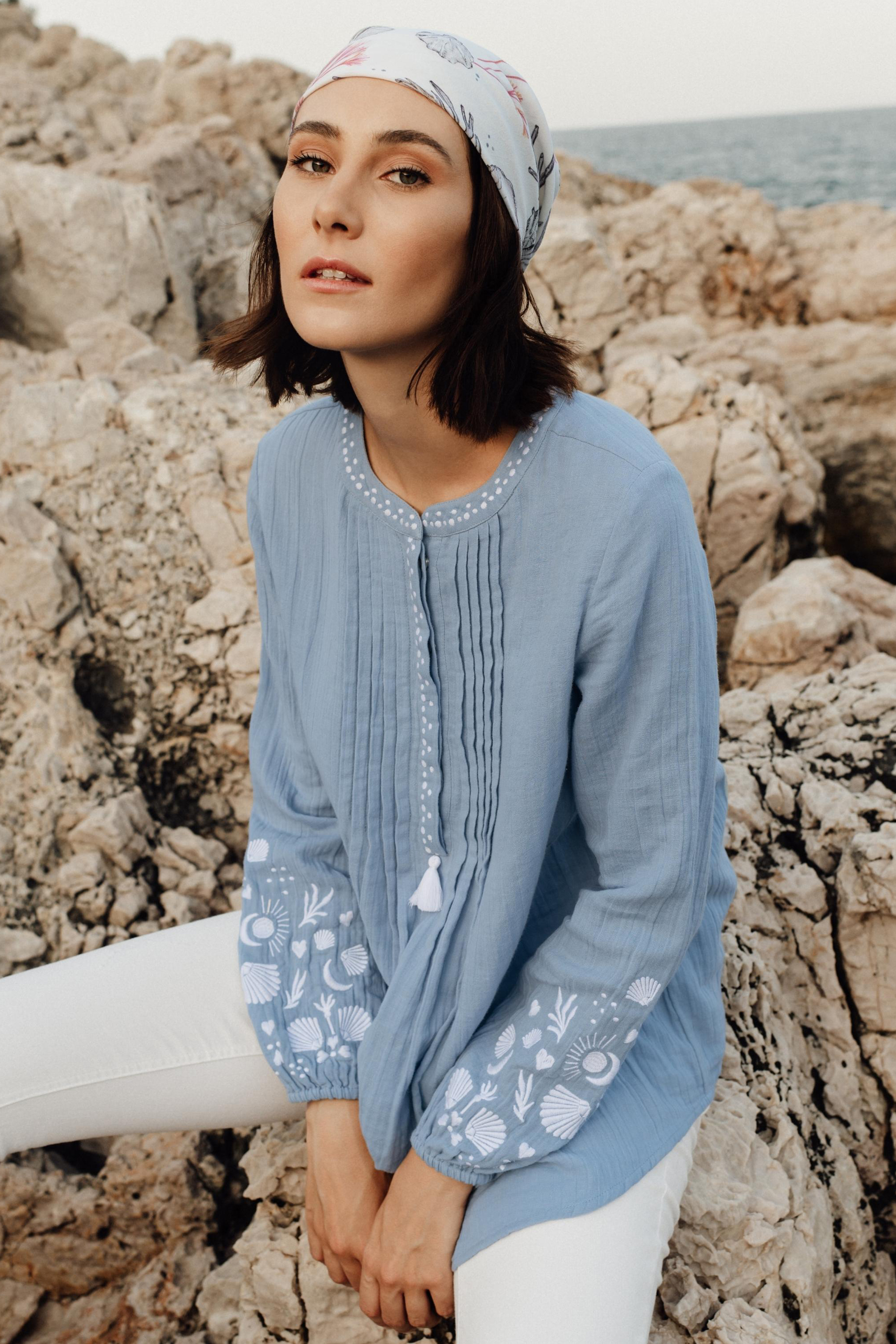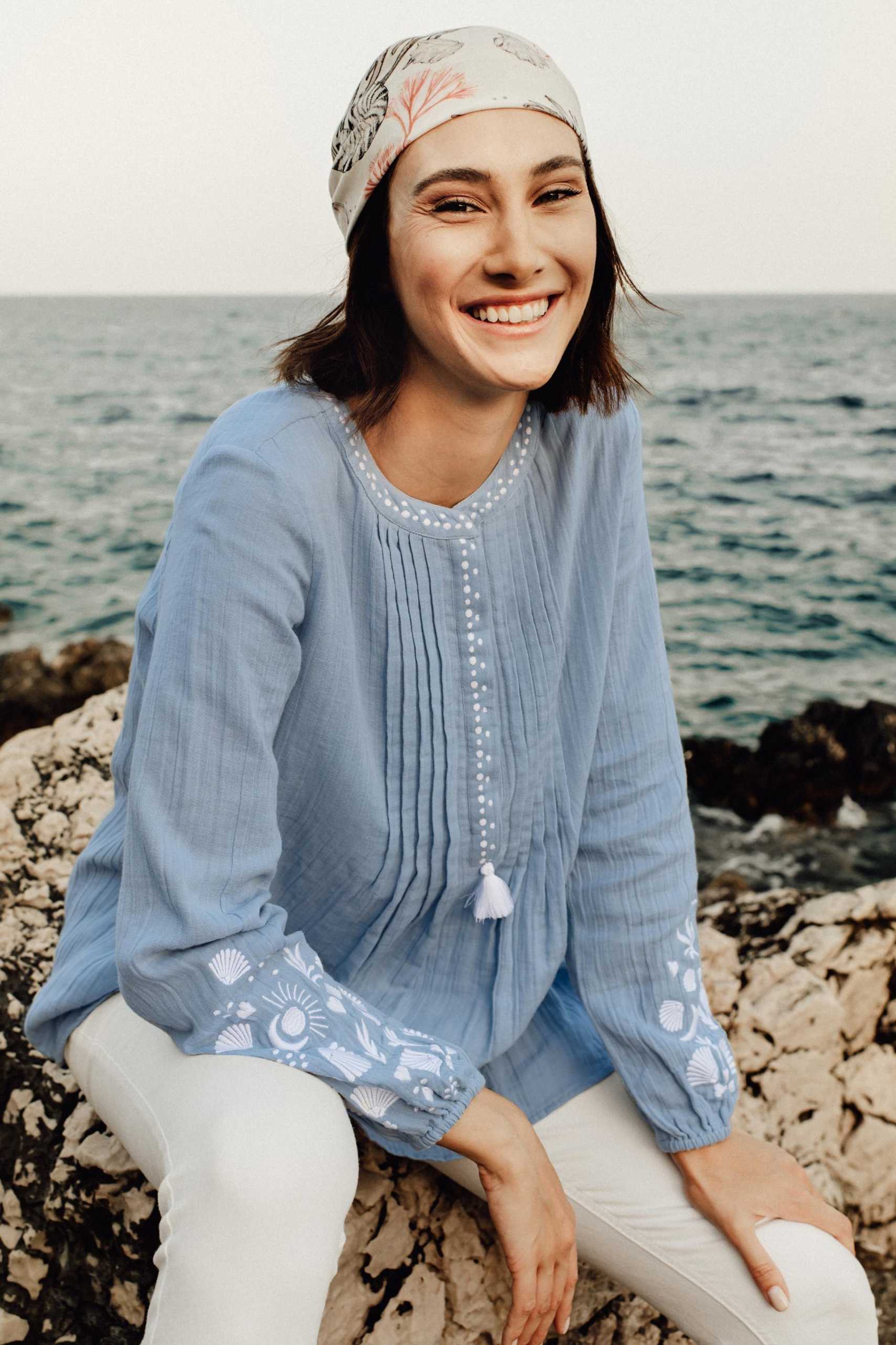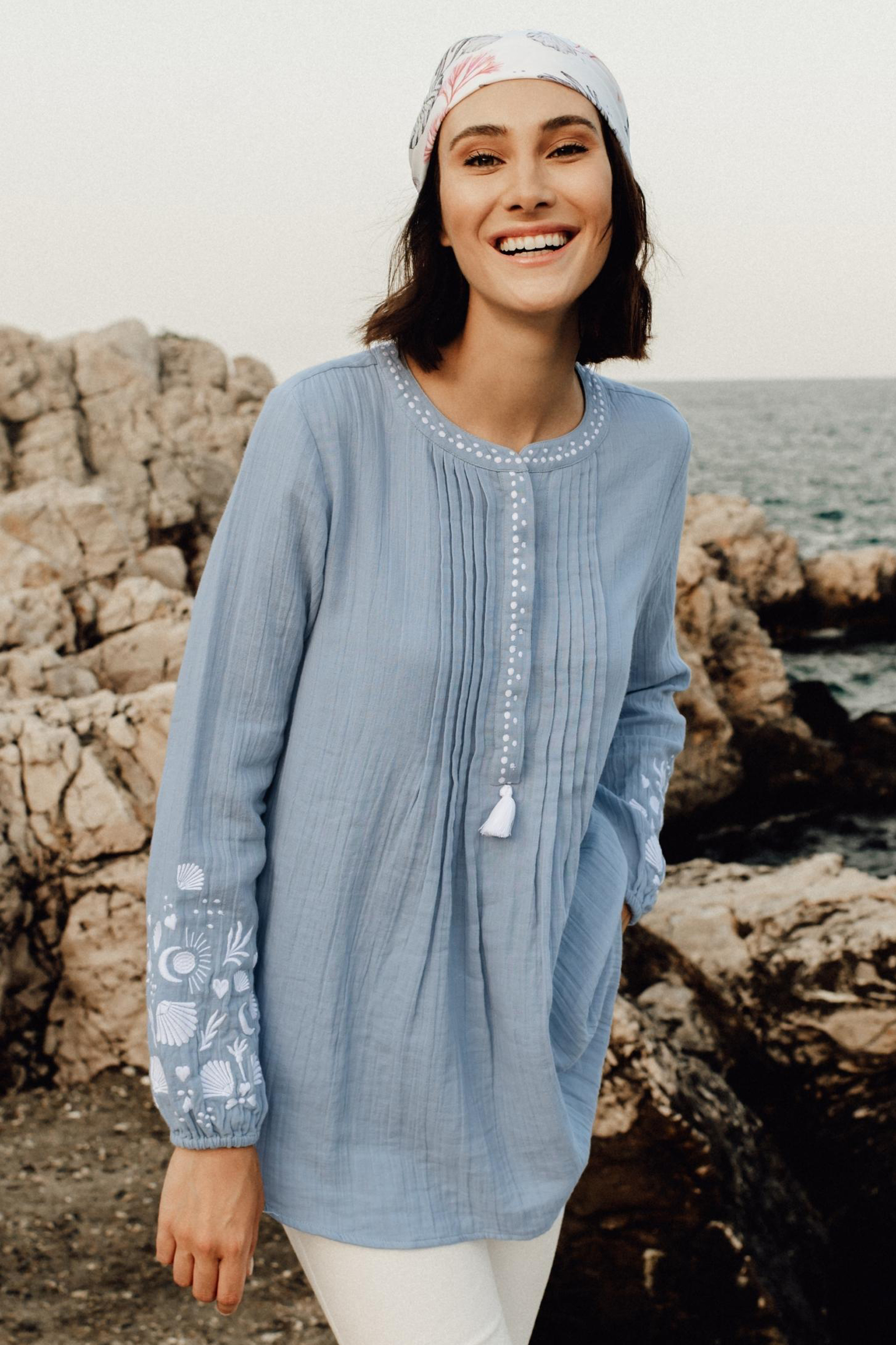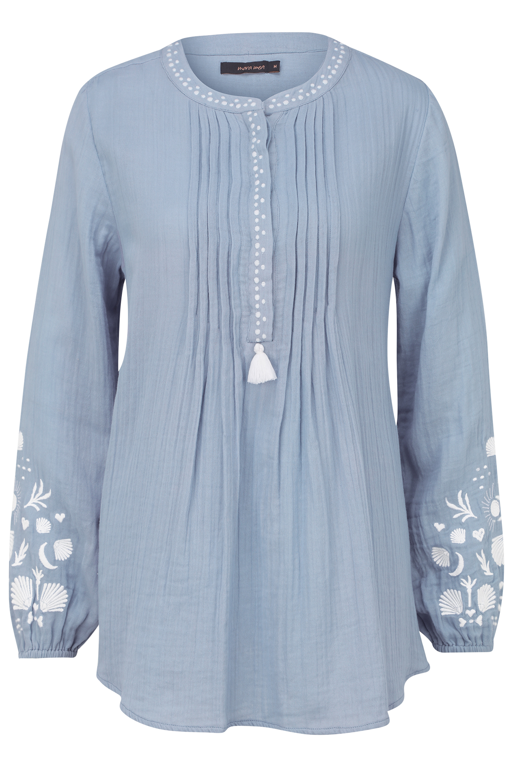 Umstands- und Stilltunika mit Biesenfalten und Stickereien, die der Tunika einen besonders sommerlichen Look verleihen. Der luftige Schnitt lässt deinem Babybauch jede Menge Platz zum Wachsen. Nach der Geburt erhältst du über die verdeckte Knopfleiste einen einfachen Zugang zur Brust, um dein Baby bequem und diskret stillen zu können. Farbe: blau