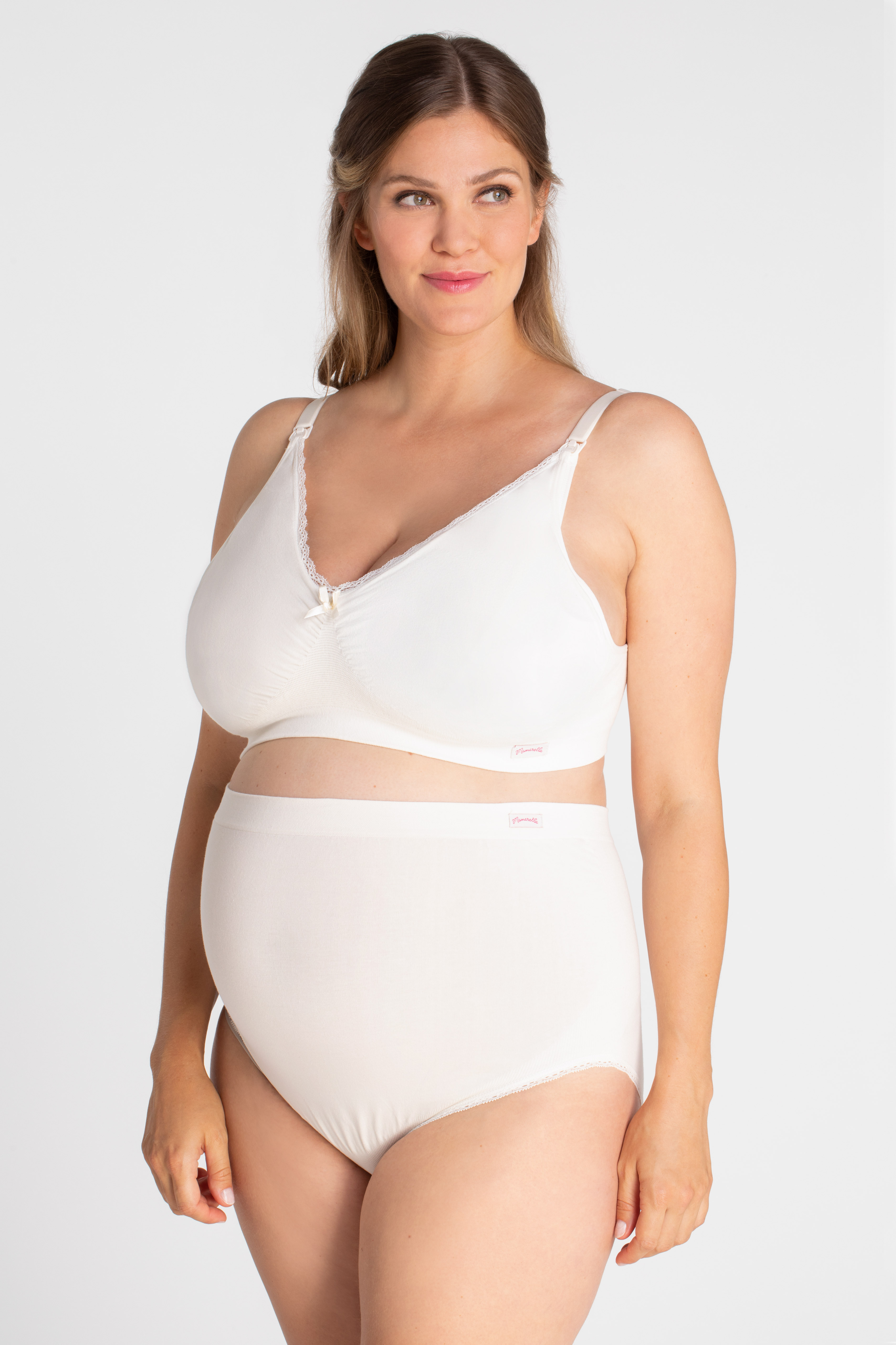 Umstandsslip aus herrlich weicher Bio-Baumwolle. Der bequeme Slip ist ohne störende Nähte gearbeitet und wächst dank des elastischen Überbauchbundes mit deinem Babybauch mit. Farben: off-white, schwarz