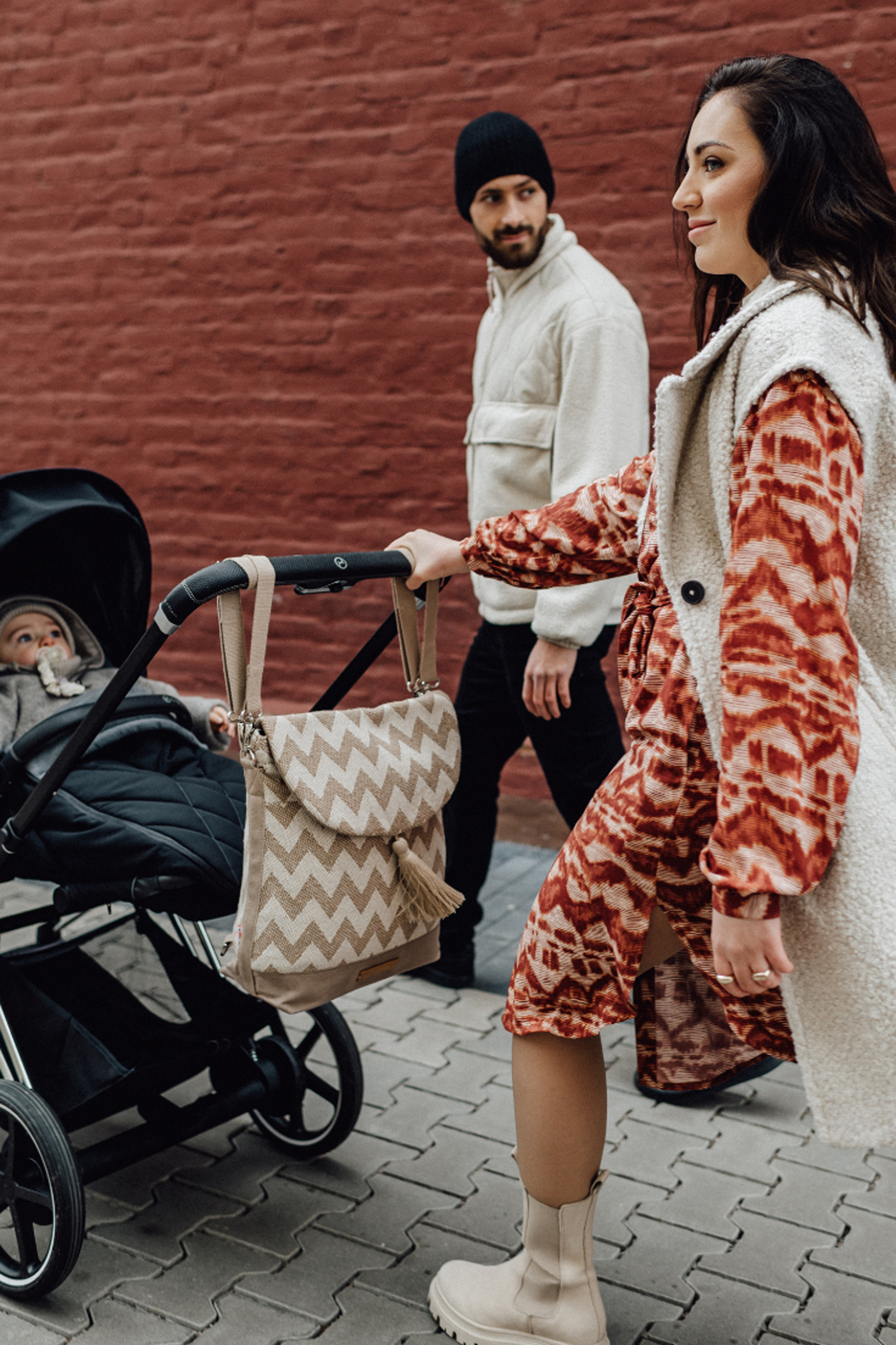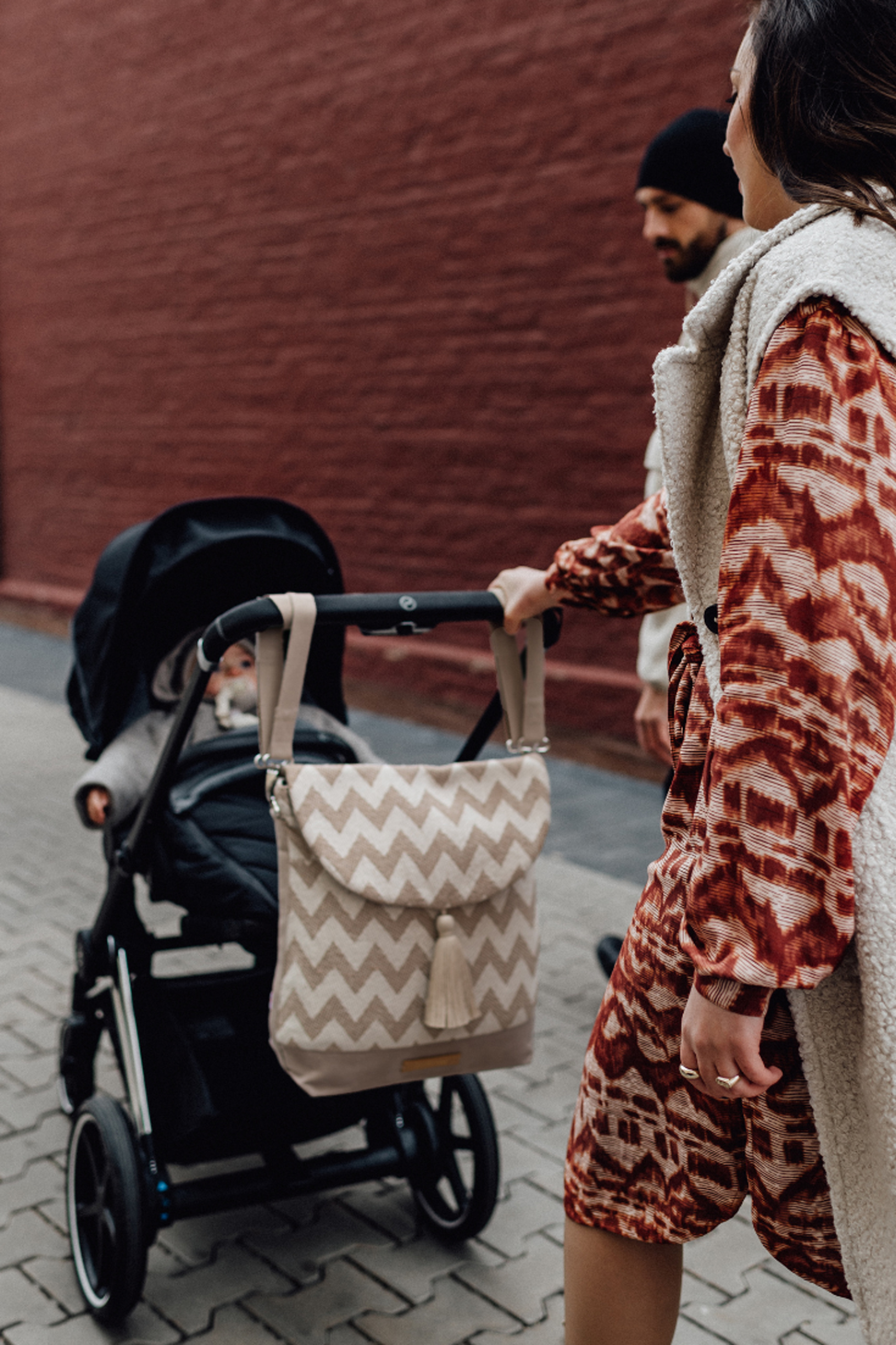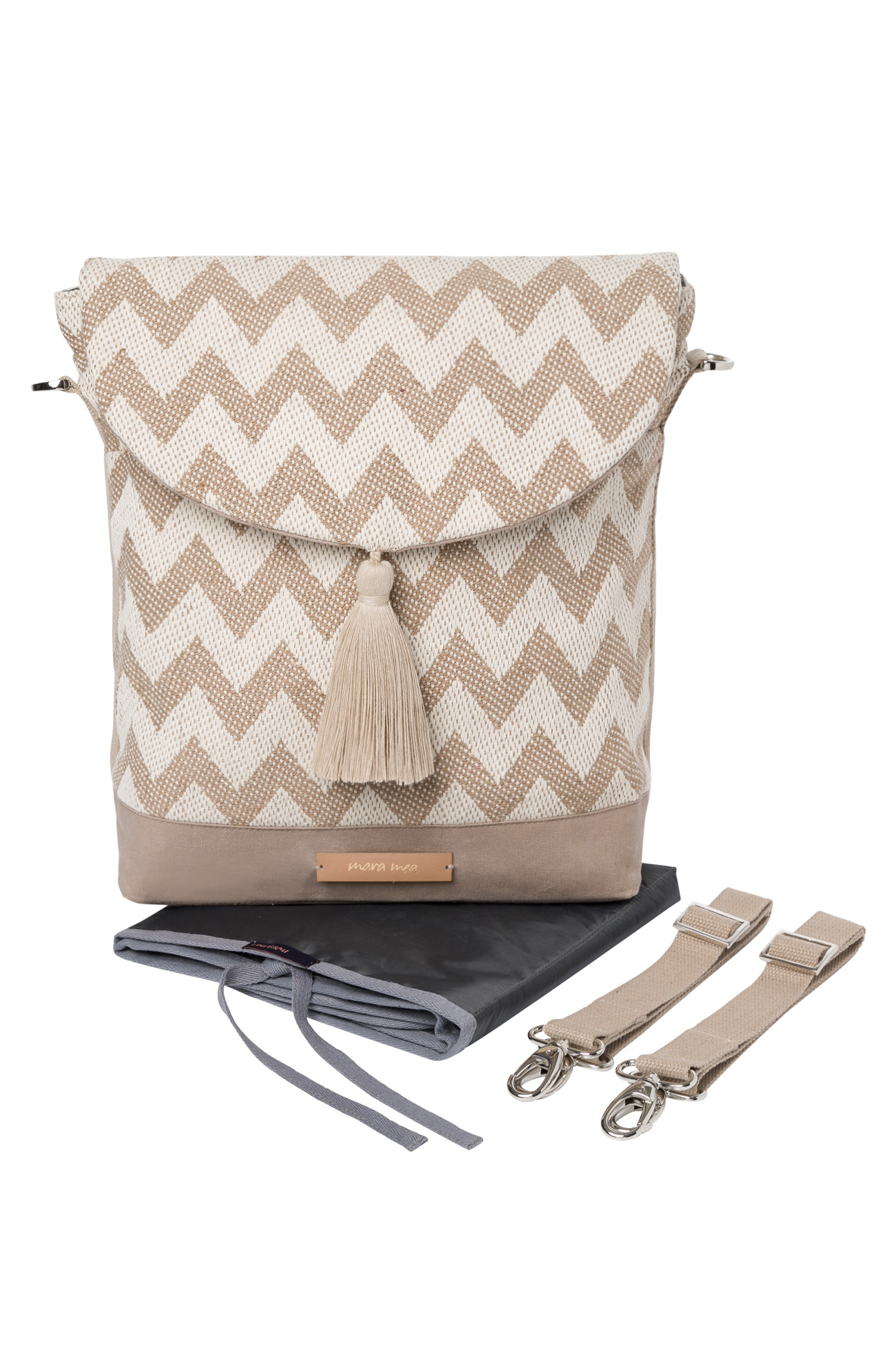 2 in 1 Wickelrucksack higher vision aus Baumwolle mit gezacktem Muster und großer Quaste. Du kannst ihn als Shopper und Rucksack verwenden oder am Kinderwagen mit den größenverstellbaren Tragegurten befestigen. Dank der zahlreichen Innentaschen ist genug Platz für Windeln, Fläschchen und Feuchttücher. Die Wickeltasche wurde unter fairen Arbeitsbedingungen hergestellt. Farbe: beige