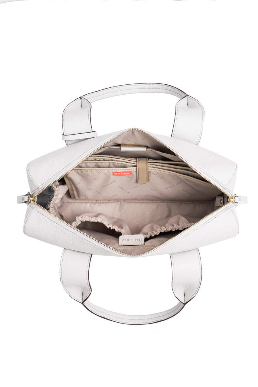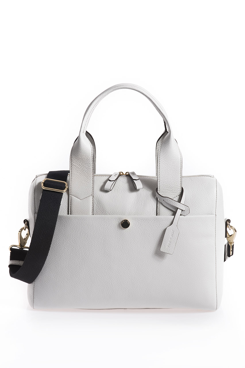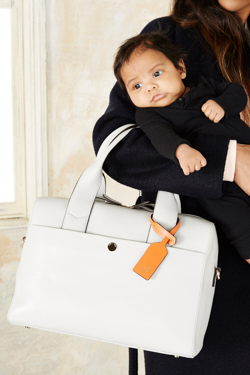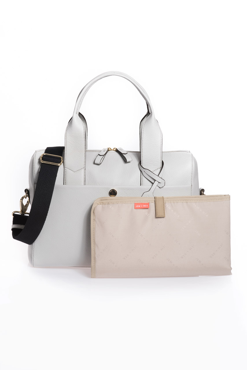 Minimalistische Wickeltasche aus weichem Kalbsleder mit goldenen Details und abnehmbarem Schulterriemen. Im Inneren findest du 5 Fächer, die genug Platz für Windeln, Feuchttücher & Co bieten, außerdem 2 zusätzliche Einsteckfächer außen. Im Lieferumfang ist eine passende Wickelunterlage enthalten, die Tasche lässt sich auch mit passenden Clips am Kinderwagen anbringen. Am Boden sind goldene Stopper zur Schonung angebracht. Farbe: grau