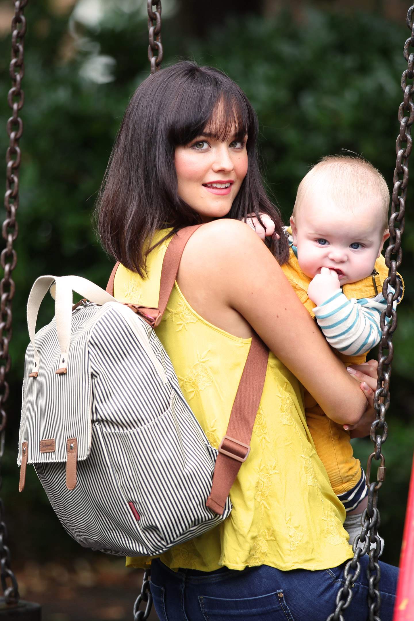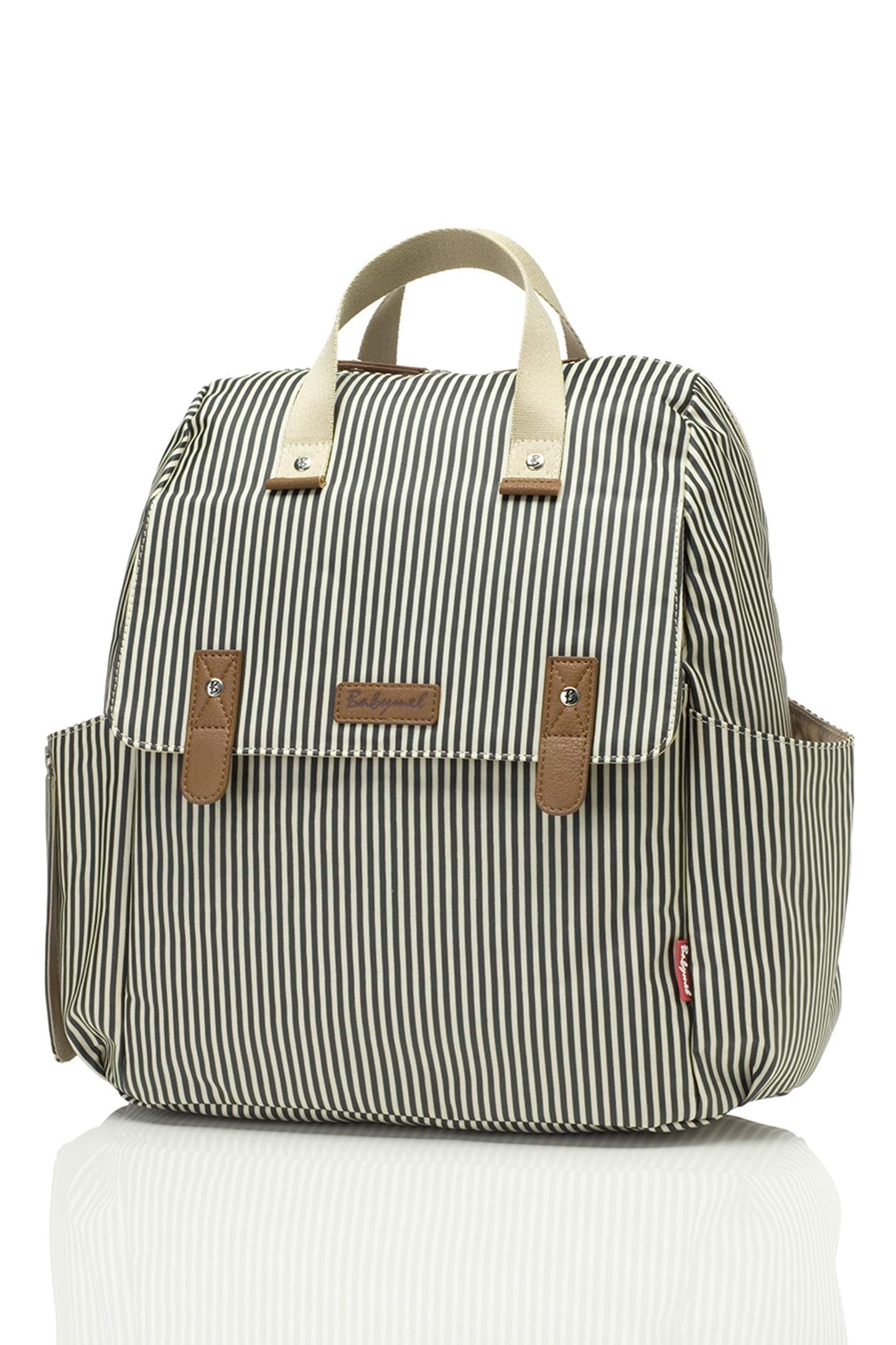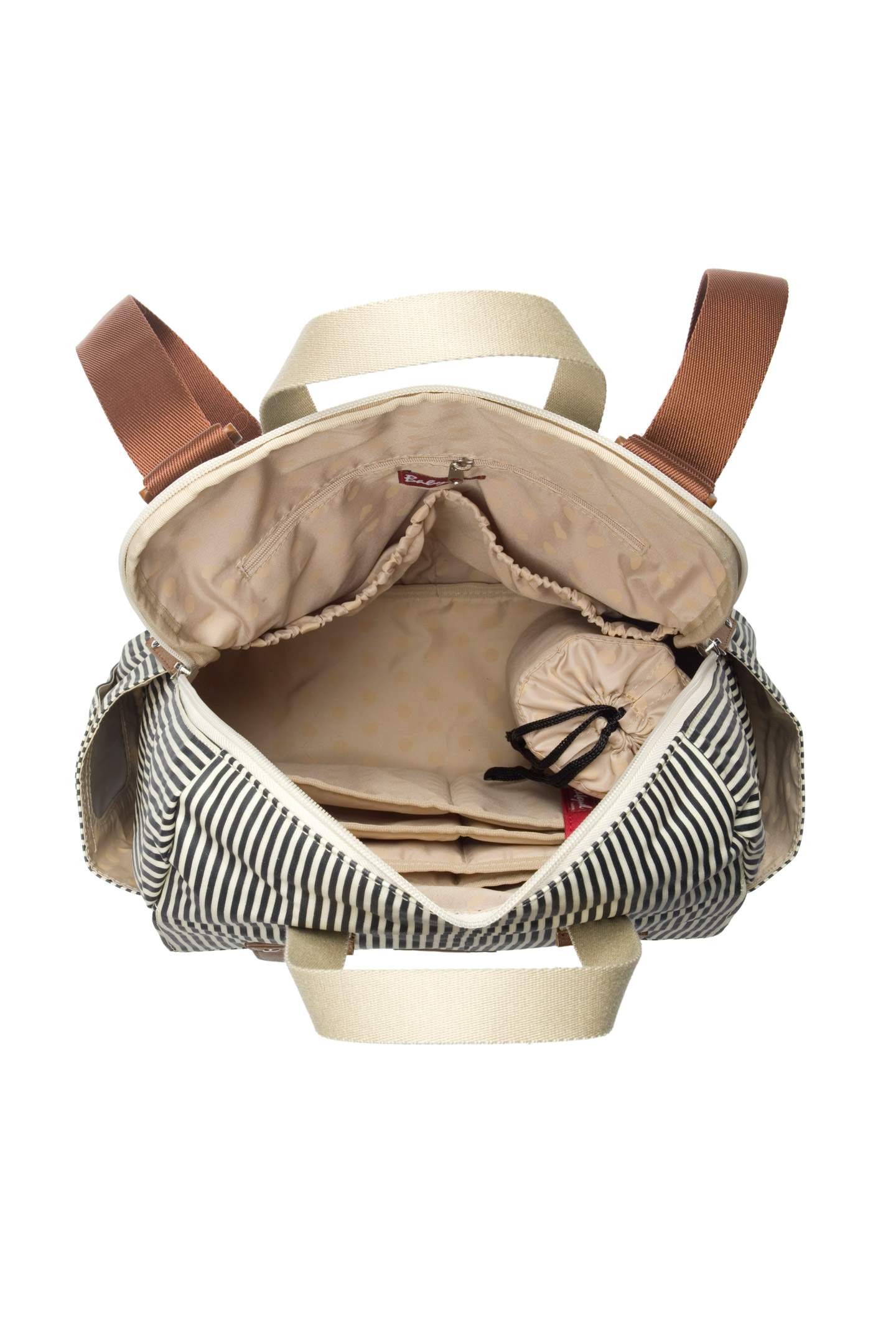 An den Seiten befindet sich je ein Einsteckfach, eins davon mit spezieller Klappe zum einfachen Entnehmen von Feuchttüchern, und vorne ein großes, aufgesetztes Fach mit Magnetverschluss. Das Hauptfach verfügt über mehrere Innenfächer und einen Reißverschluss. Der Rucksack kommt inklusive eines herausnehmbaren Fläschchenwärmers und einer weichen Wickelunterlage. Der Rucksack kann durch die verstellbaren Träger auch als Umhängetasche oder Schultertasche getragen werden. Durch spezielle Klettverschluss-Schlaufen kann der Rucksack einfach am Kinderwagen befestigt werden. Farbe: gestreift