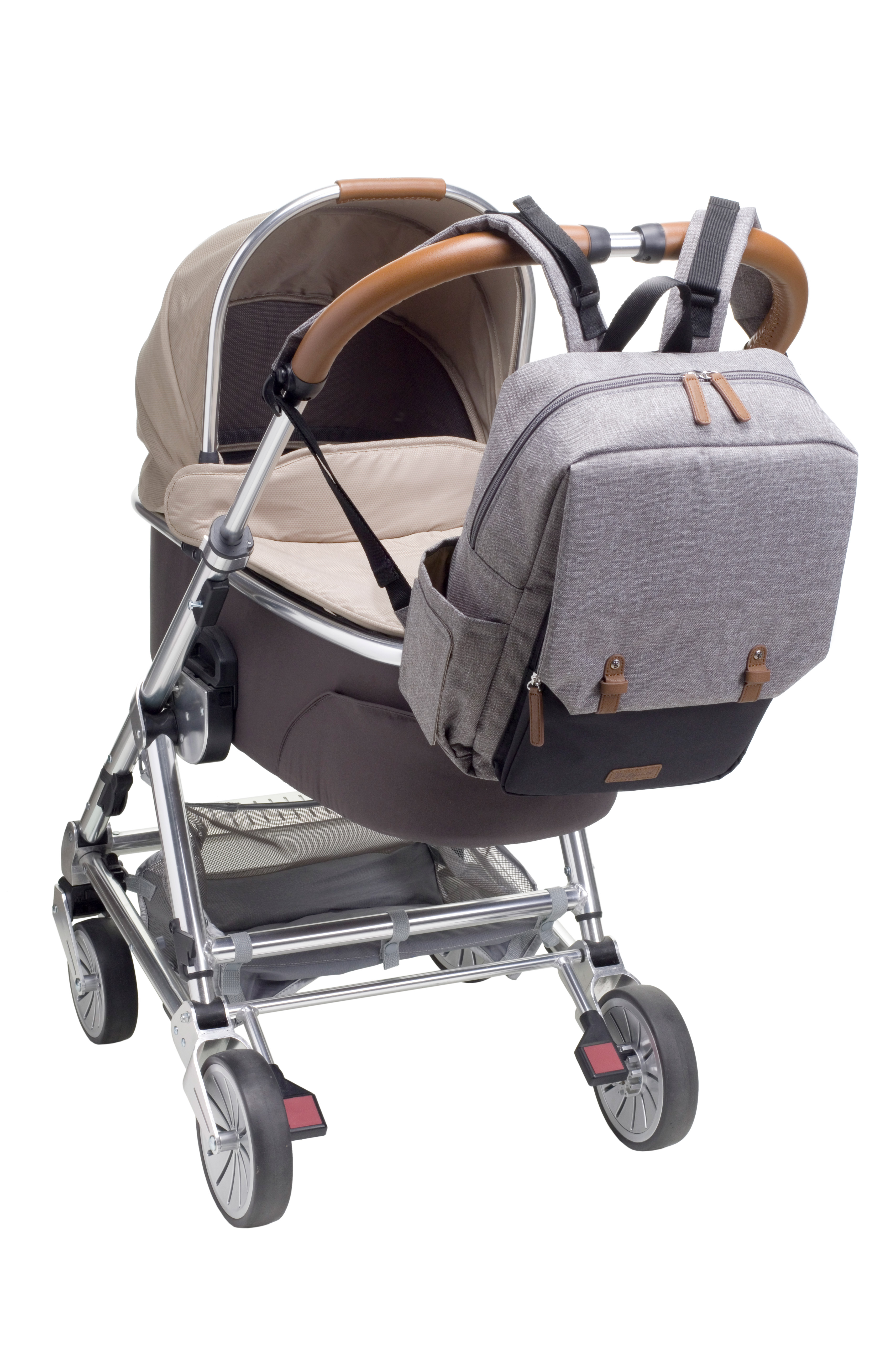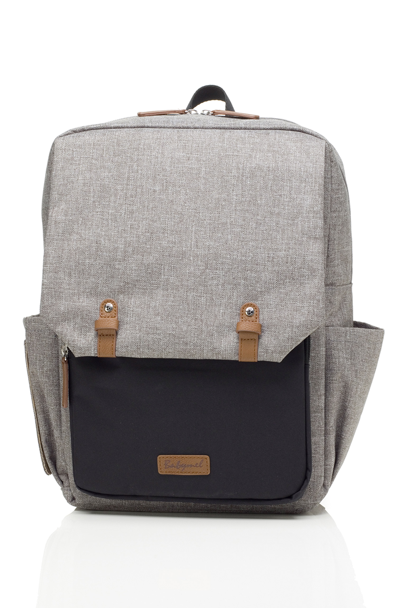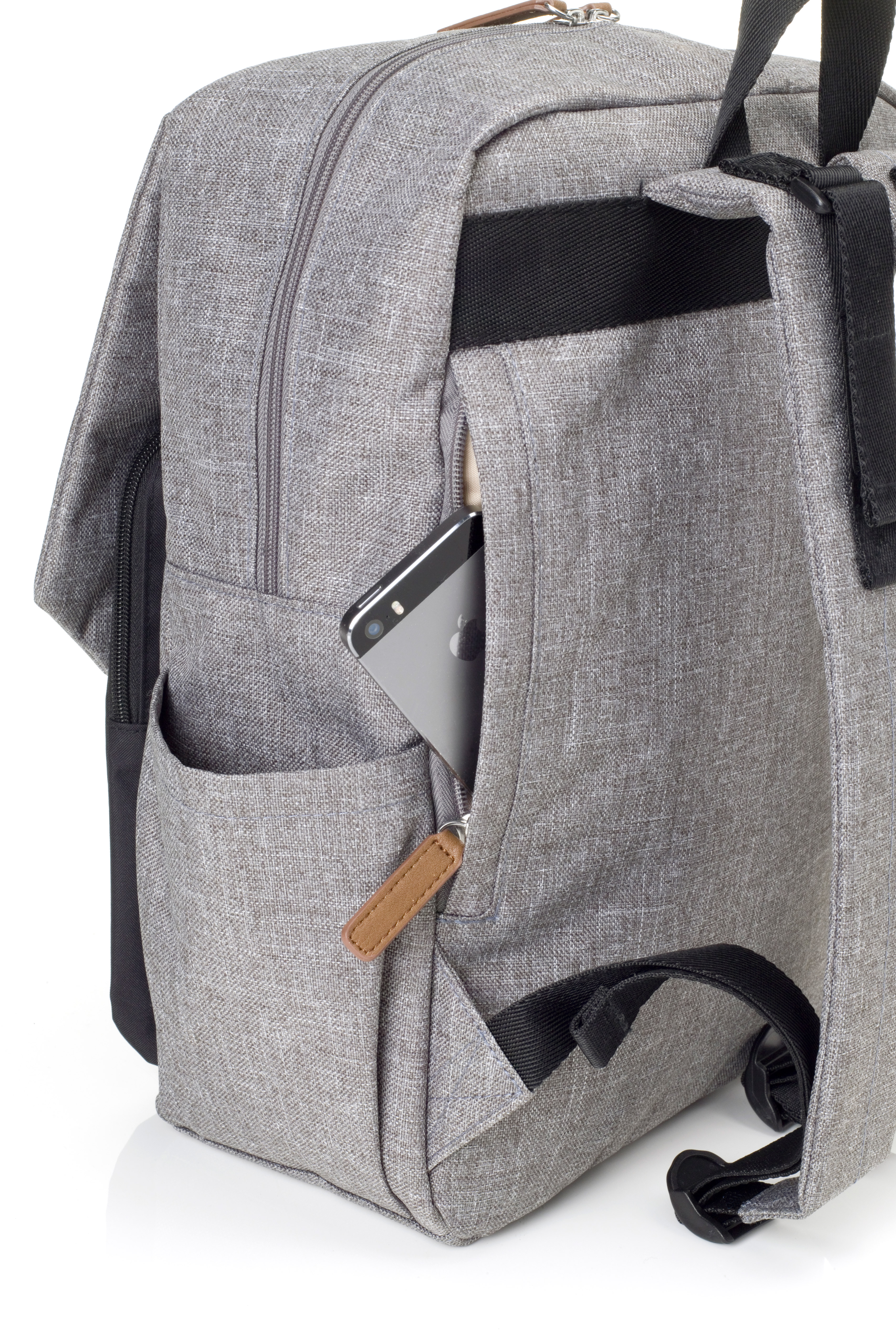 Vielseitiger Unisex Laptop-Wickelrucksack aus robustem, beschichtetem Canvas mit veganem Lederbesatz. Vorne befindet sich ein großes Fach mit Wickelauflage und an der Rückseite ein kleines Fach mit Reißverschluss. An den Seiten sind ein normales Einsteckfach und eins mit spezieller Öffnung zur einfachen Entnahme von Feuchttüchern sowie zwei Flaschenwärmfächer. Das Hauptfach verfügt über einen Reißverschluss, ein gepolstertes Laptopfach und mehrere Innenfächer. Mit den praktischen Schlaufen kann der Rucksack einfach am Kinderwagen befestigt werden. Das Design ist auch perfekt für Väter. Farbe: grau