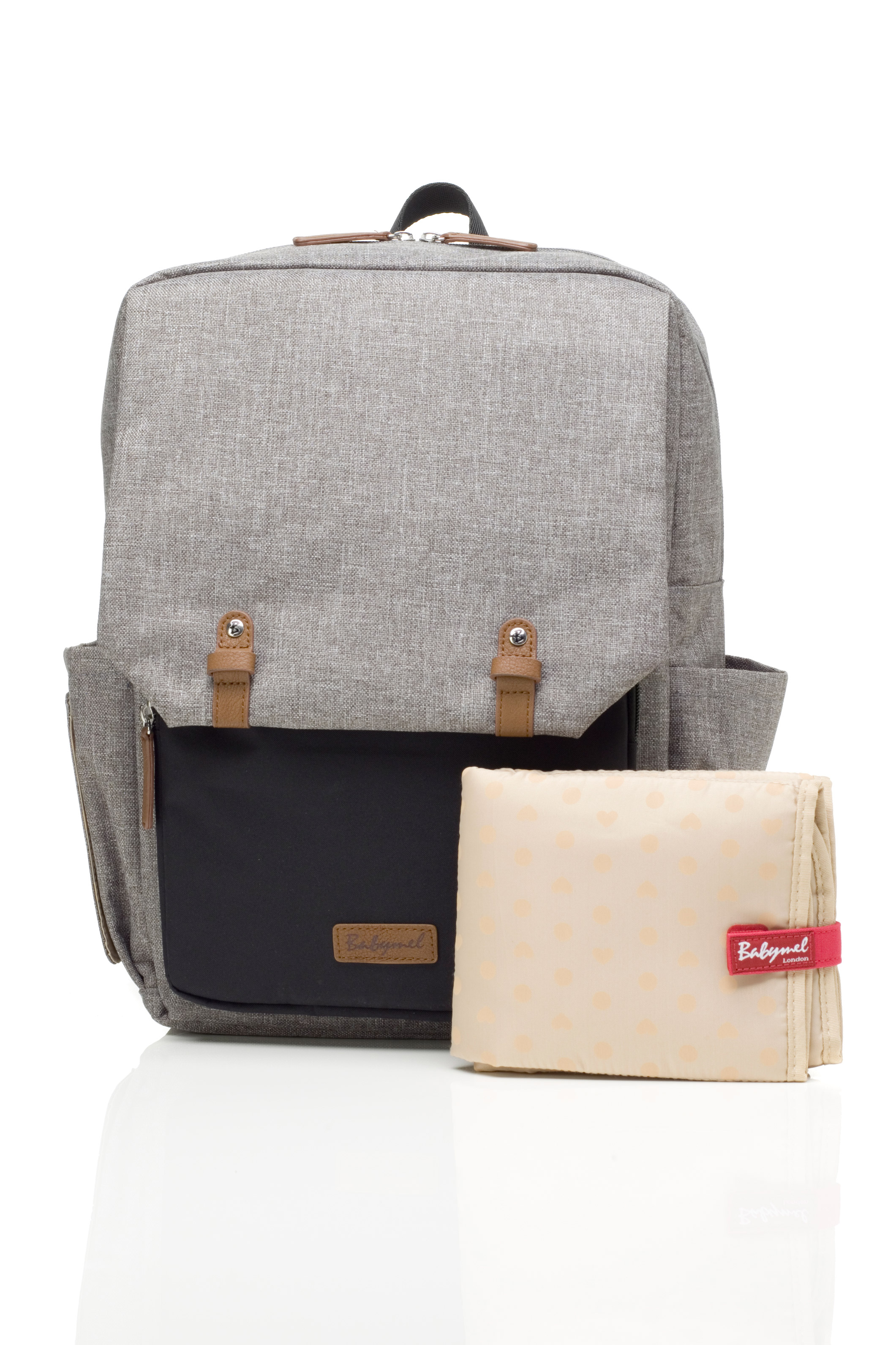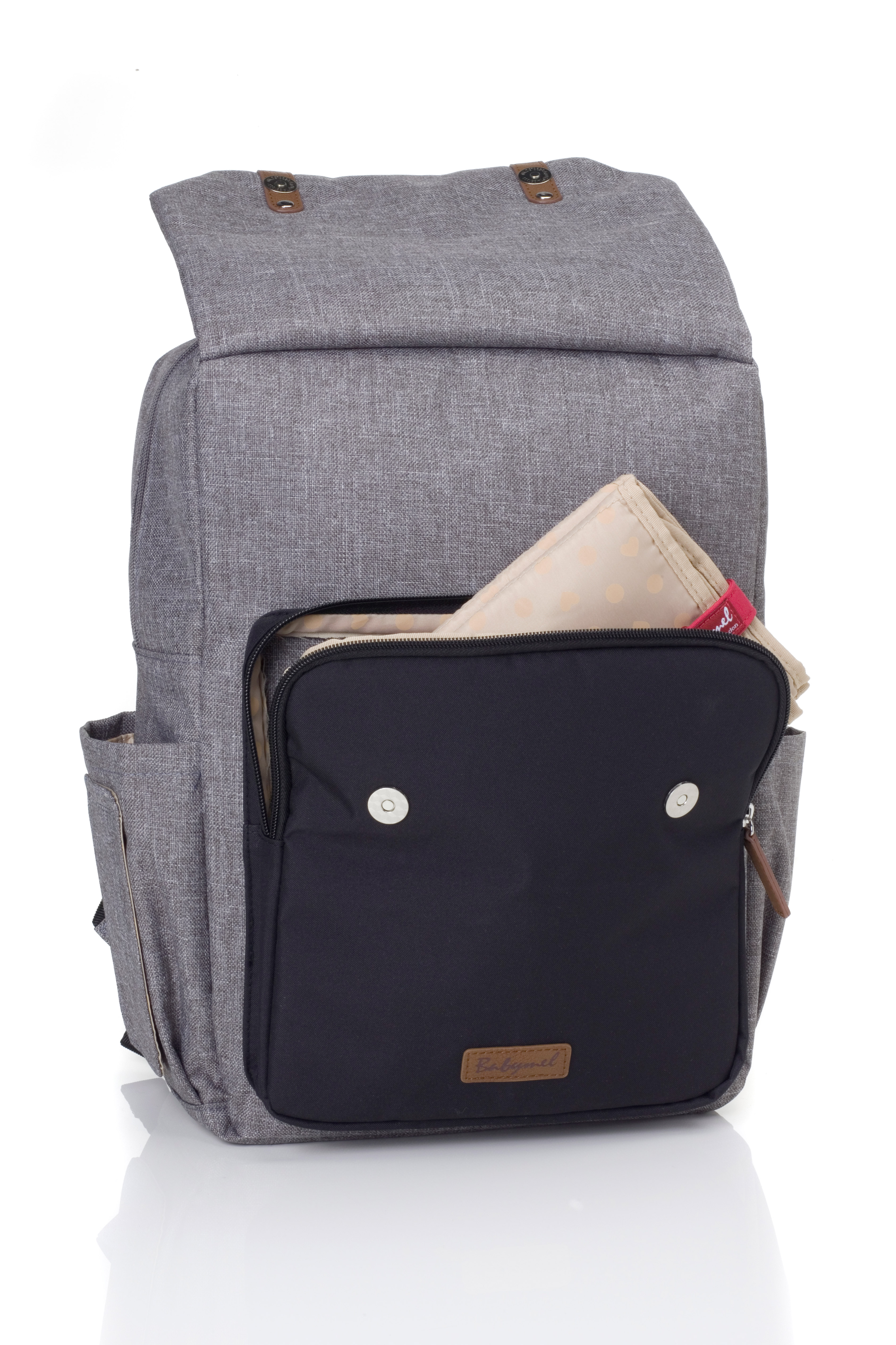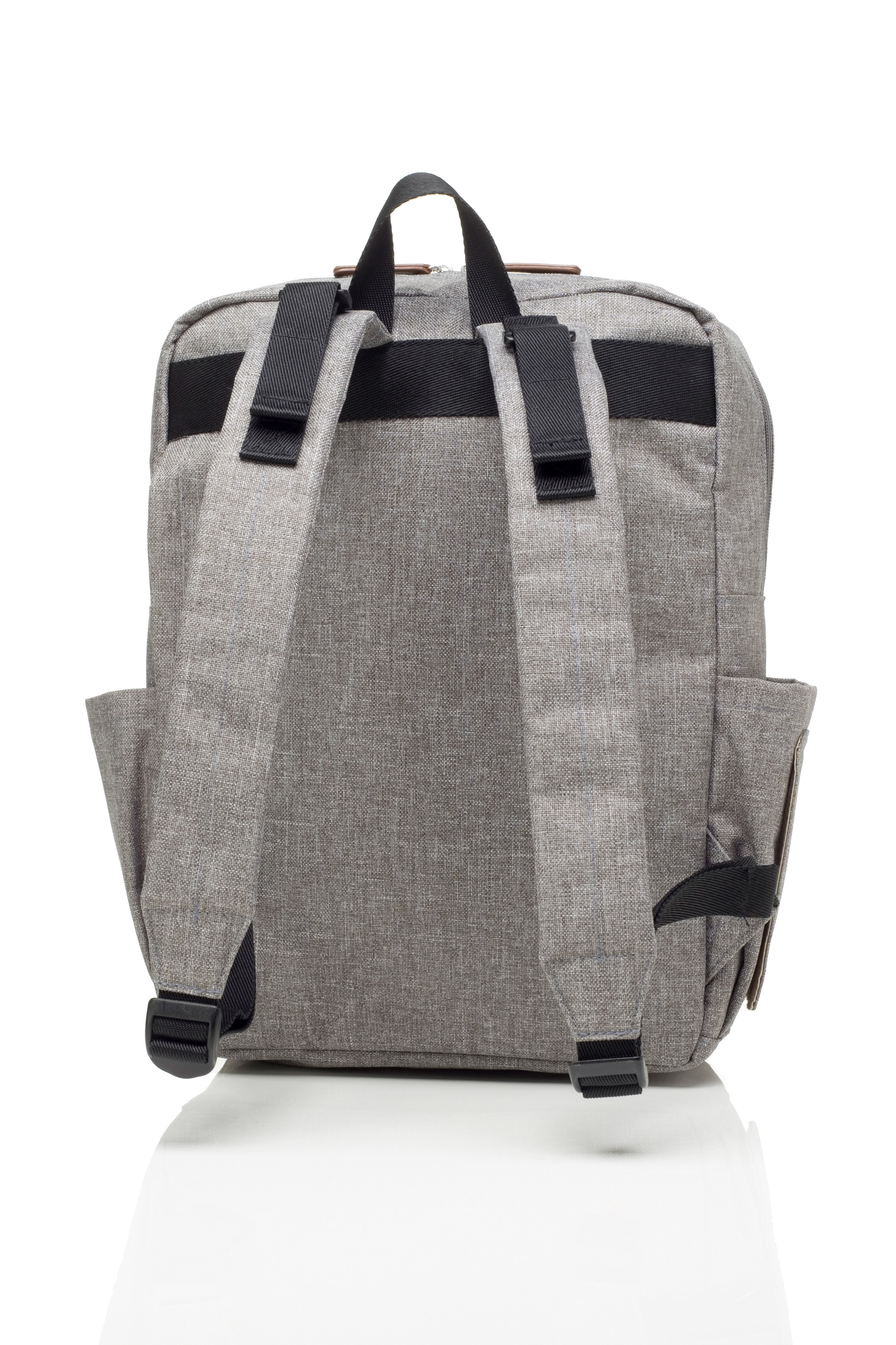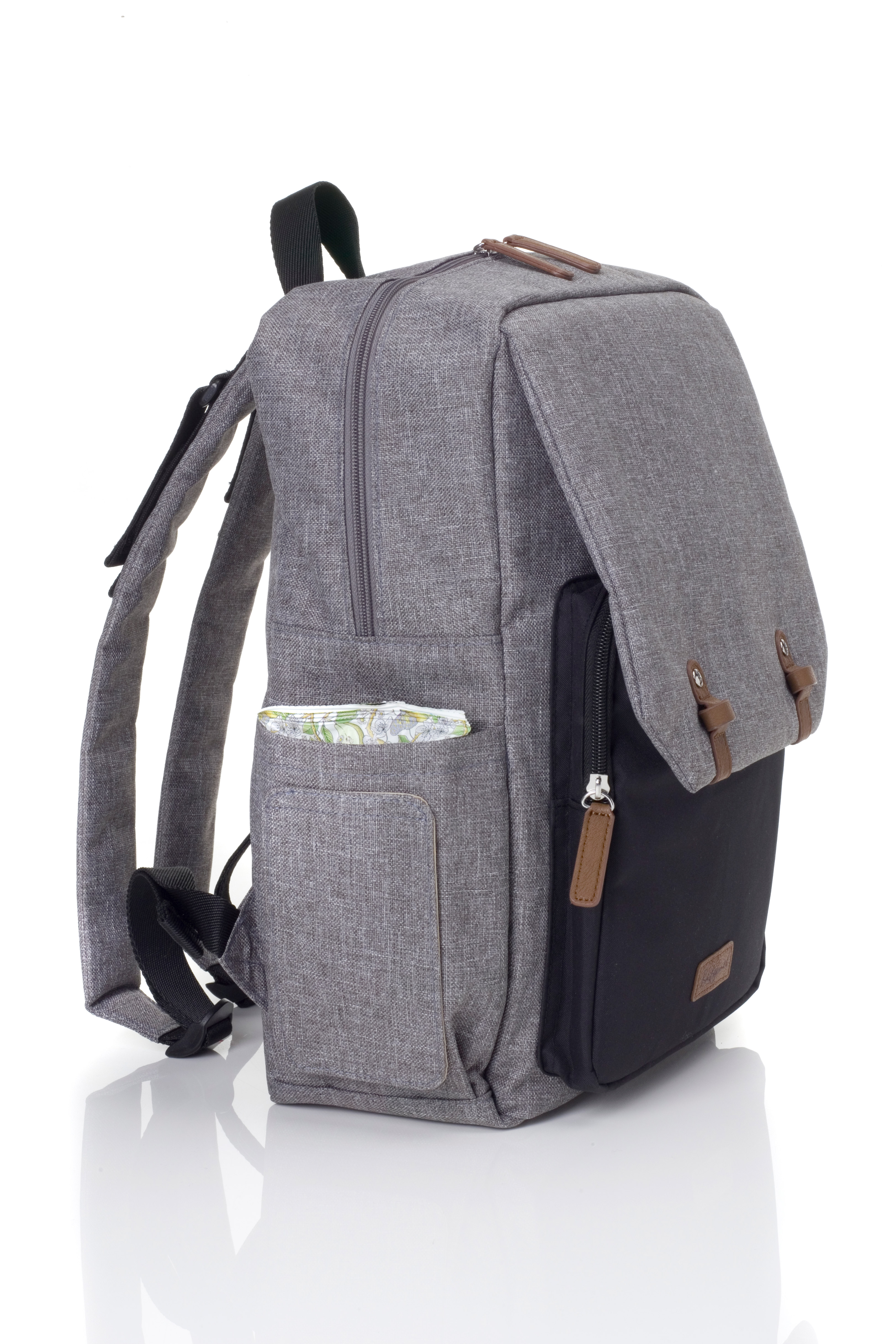 Vielseitiger Unisex Laptop-Wickelrucksack aus robustem, beschichtetem Canvas mit veganem Lederbesatz. Vorne befindet sich ein großes Fach mit Wickelauflage und an der Rückseite ein kleines Fach mit Reißverschluss. An den Seiten sind ein normales Einsteckfach und eins mit spezieller Öffnung zur einfachen Entnahme von Feuchttüchern sowie zwei Flaschenwärmfächer. Das Hauptfach verfügt über einen Reißverschluss, ein gepolstertes Laptopfach und mehrere Innenfächer. Mit den praktischen Schlaufen kann der Rucksack einfach am Kinderwagen befestigt werden. Das Design ist auch perfekt für Väter. Farbe: grau
