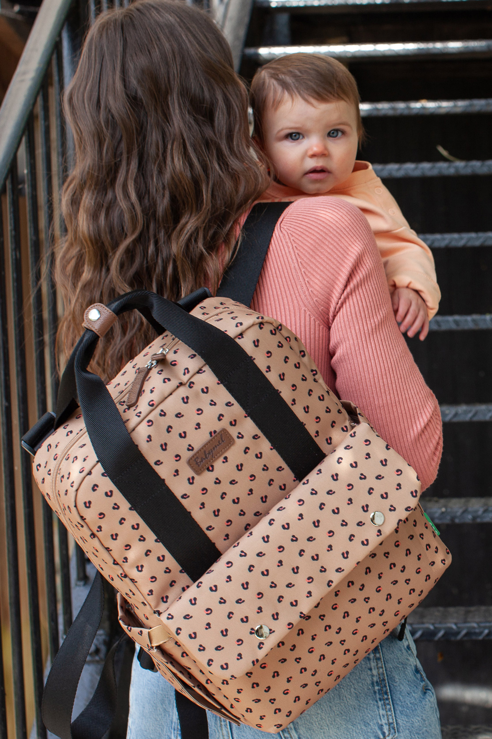 Stylischer Wickelrucksack aus recycelten Kunststoffflaschen mit Leopardenprint aus leichtem und wasserdichtem Außenmaterial. Besonders vielseitig für unterwegs dank der kurzen Tragehenkel, verstellbaren und gepolsterten Schulterriemen sowie integrierten Riemen zum Anbringen an den Kinderwagen. Ein praktisches Fach für Feuchttücher mit Spenderschlitz zum einfachen Herausziehen und Klettverschluss verhindert das Austrocknen. Das Hauptfach mit Doppelreißverschluss sowie insgesamt 7 Innen- und Außentaschen bieten Platz für alles Nötige. Deine Wertsachen finden im versteckten Reißverschlussfach auf der Rückseite Platz. Der Wickelrucksack wird inklusive einer gepolsterten Wickelauflage und Isoliertem Fach, das Flüssigkeiten bis zu 4 Stunden warm oder kalt hält, geliefert. Farbe: braun