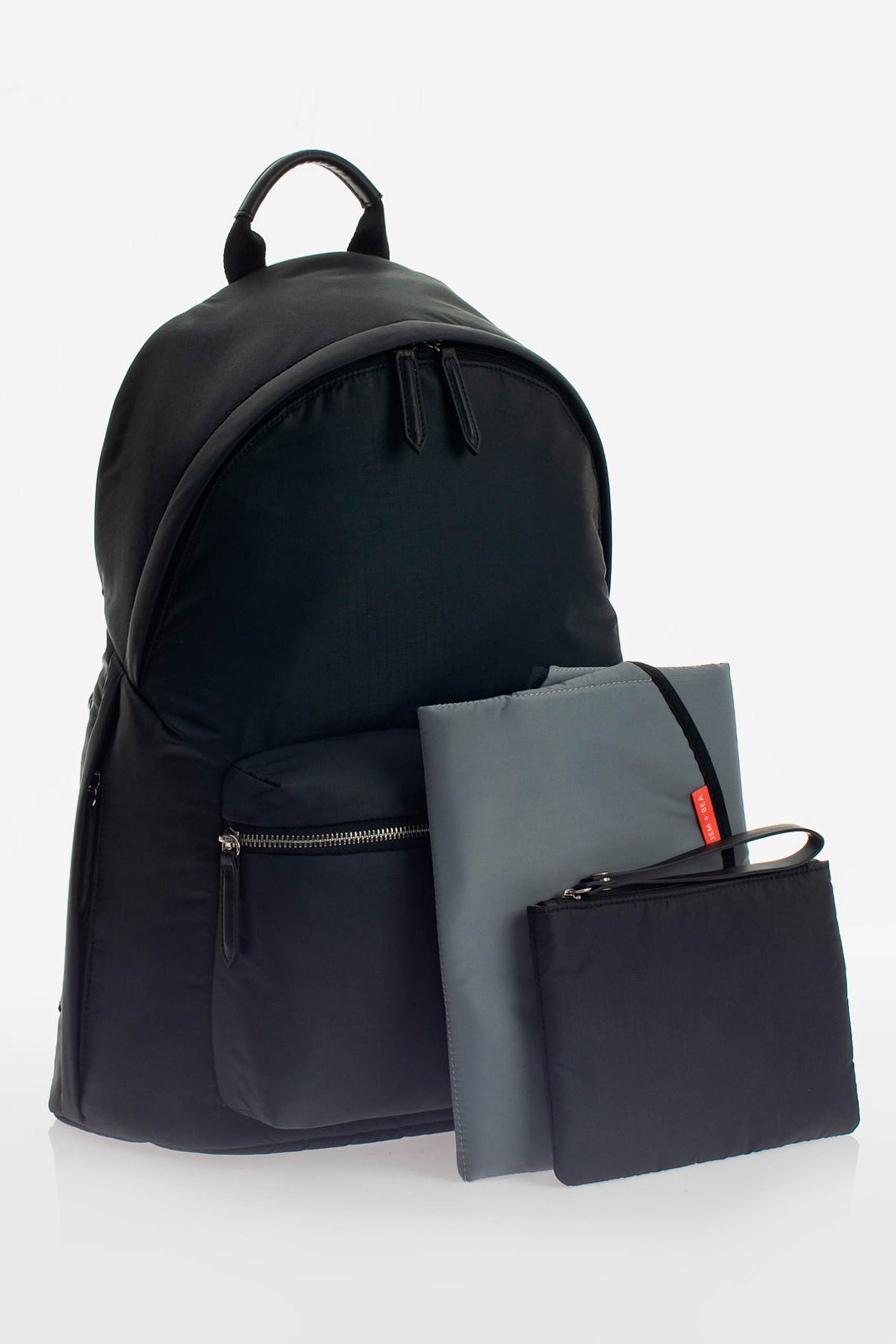 Wickelrucksack aus recyceltem Nylon, hergestellt aus ausgedienten Fischernetzen, besonders robust, nachhaltig und stylisch zugleich. Der elegante minimalistische Look des Wickelrucksack sieht sowohl an Mama als auch an Papa gut aus. Die Tasche bietet intelligent aufgeteilten Stauram für alles, was man auf Ausflügen mit Baby oder Kleinkind braucht. Im Lieferumfang enthalten sind eine Wickel-Clutch und Clips, um den Rucksack am Kinderwagen zu befestigen. Farbe: schwarz