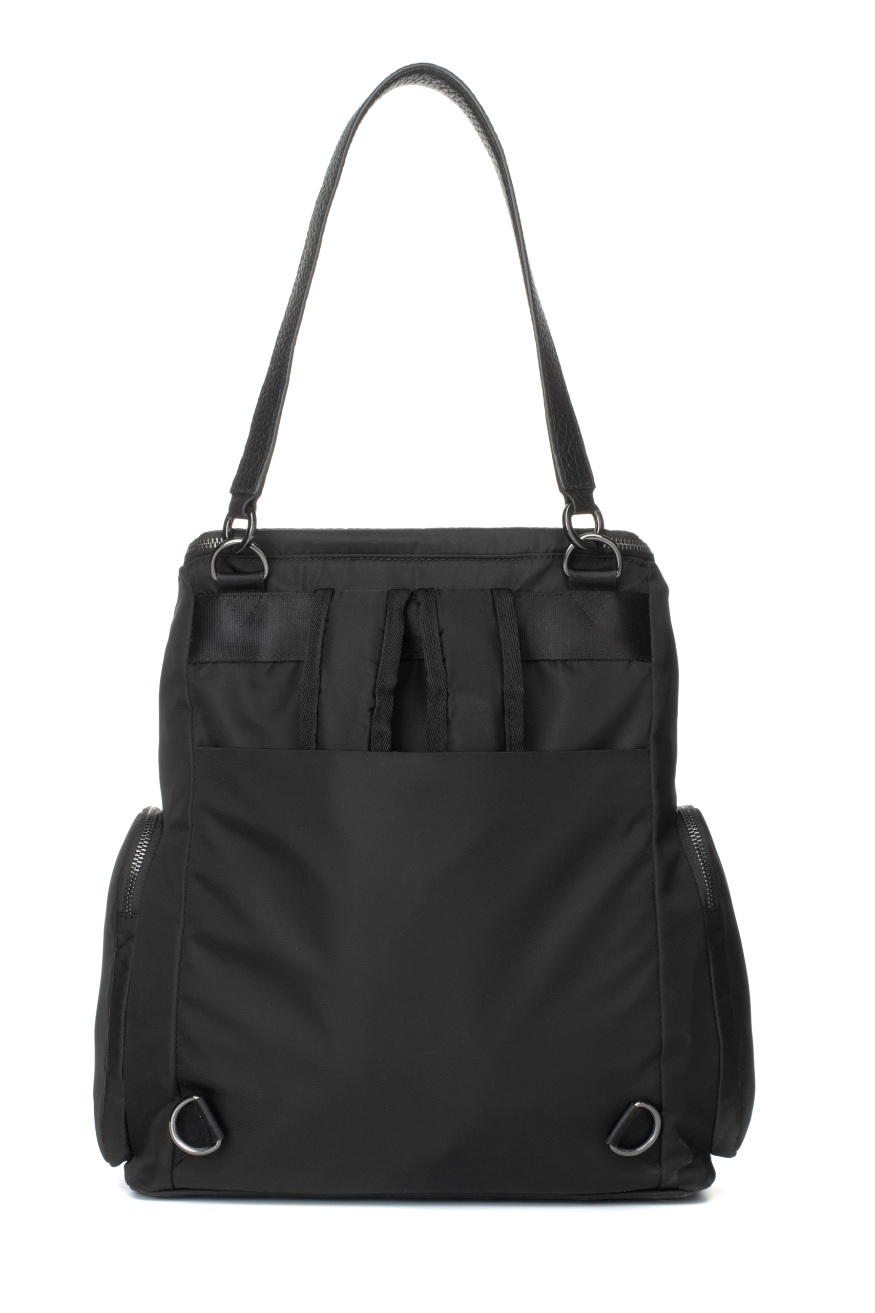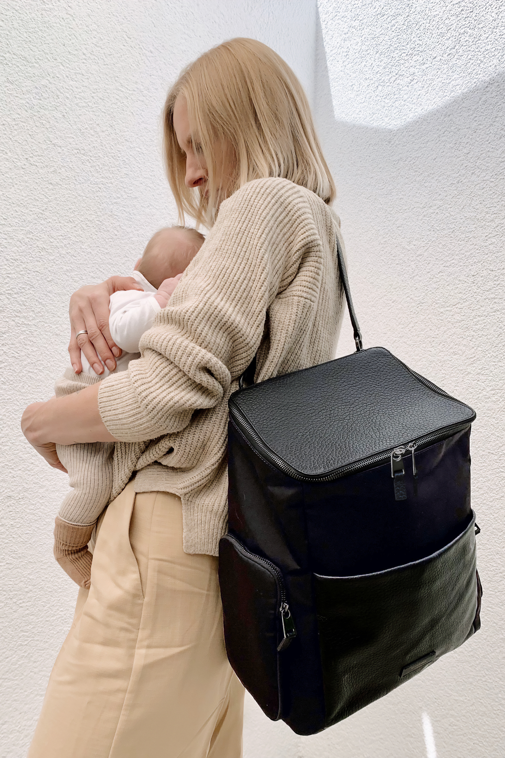 Hochwertiger 2-1 Wickelrucksack und Tasche aus strukturiertem Leder, robustem Nylon und Metall-Details in anthrazit. Die Kombination aus Leder und Nylon wirkt besonders elegant und macht die geräumige Tasche gleichzeitig robust und wasserabweisend. Trage sie bequem als Rucksack mit dem vollständig gepolsterten Rückenteil und den Rucksackriemen oder als elegante Schultertasche mit dem abnehmbaren, verstellbaren Lederriemen. Die quadratische Reißverschlussöffnung ermöglicht dir ein einfaches Packen und Entnehmen von Windeln, Feuchttüchern, Snacks und allem, was du unterwegs mit Baby sonst noch brauchst. Für Ordnung sorgen dabei insgesamt neun Innen- und Außenfächer. Im Set enthalten ist eine gepolsterte Wickelunterlage mit praktischen Fächern für Windeln und Feuchttücher, sowie eine kleine, isolierte Tasche für das Fläschchen oder Snacks. Maße: ca. 38x33x18 cm. Gewicht: ca. 0,9 kg. Farbe: schwarz