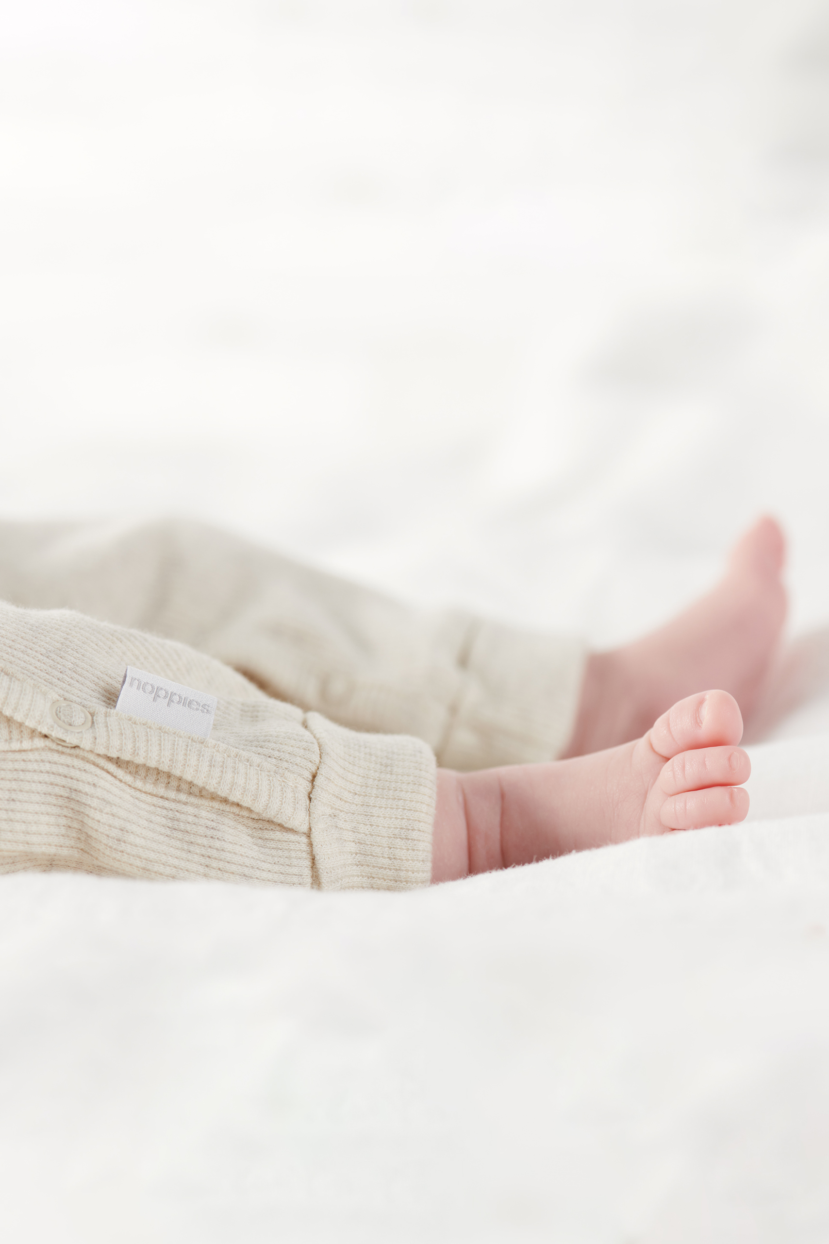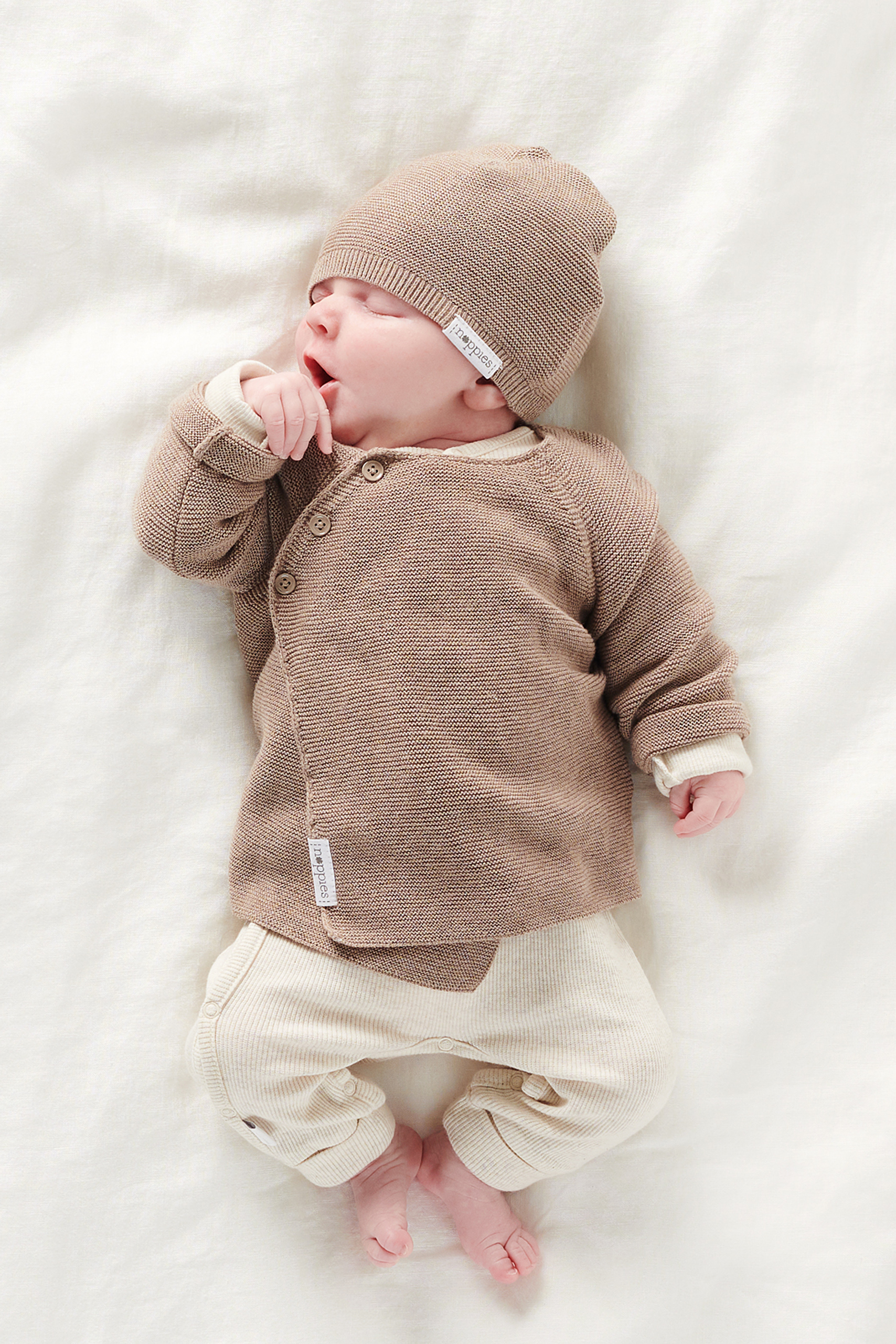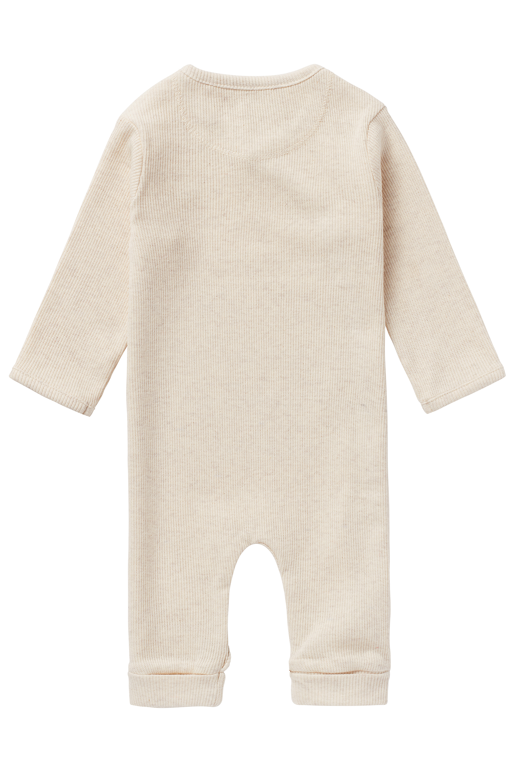 Ribbed romper made from GOTS certified organic cotton and recycled material. The soft unisex romper with folded legs has a press studs placket that makes it easy to put on, take off and change. Colour: beige