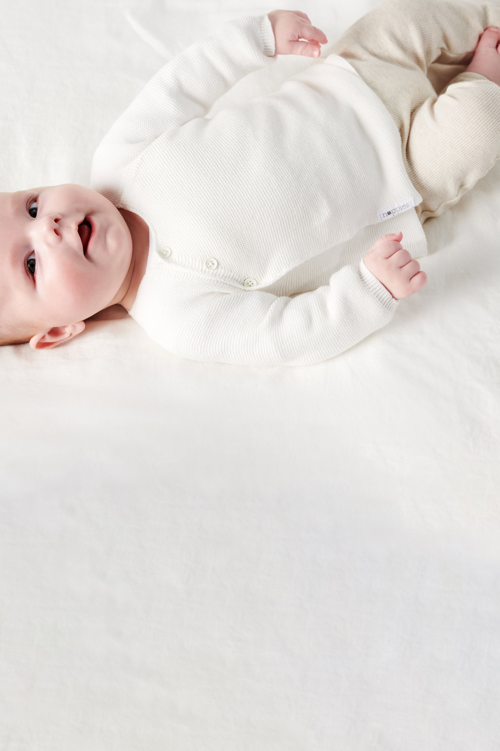 Soft baby trousers made of stretchy ribbed knit with elastic waistband that can also be folded up for extra comfort and warmth. The super cosy trousers are made from GOTS certified organic cotton and recycled material. Combine them for example with the matching Baby Wrap Shirt beige. Colour: beige