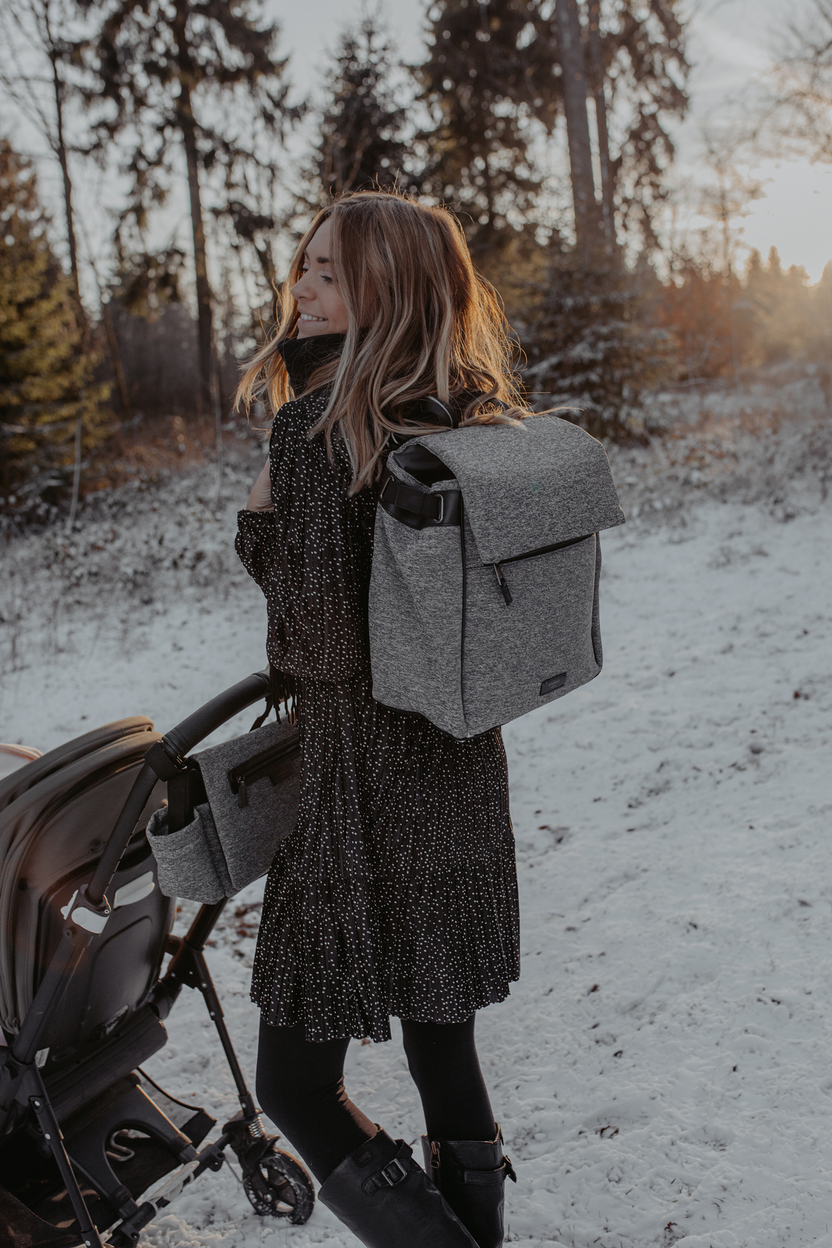 Storsak St. James 3 in 1 Scuba diaper bag with stroller clips, changing mat for on the go and bottle warmer. A special and practical feature at the same time is the durable Scuba material. This is water repellent on the outside and thus protects the contents in all wind and weather, in addition, the inner lining is wipeable. The padded back gives you an ultra soft and comfortable carrying comfort. In total, the bag has seven compartments for diapers, wet wipes or your iPad, for example. The adjustable straps allow a variety of variations and make the diaper bag particularly versatile: The bag can be worn as a backpack and as a shoulder bag or crossbody bag. Color: gray