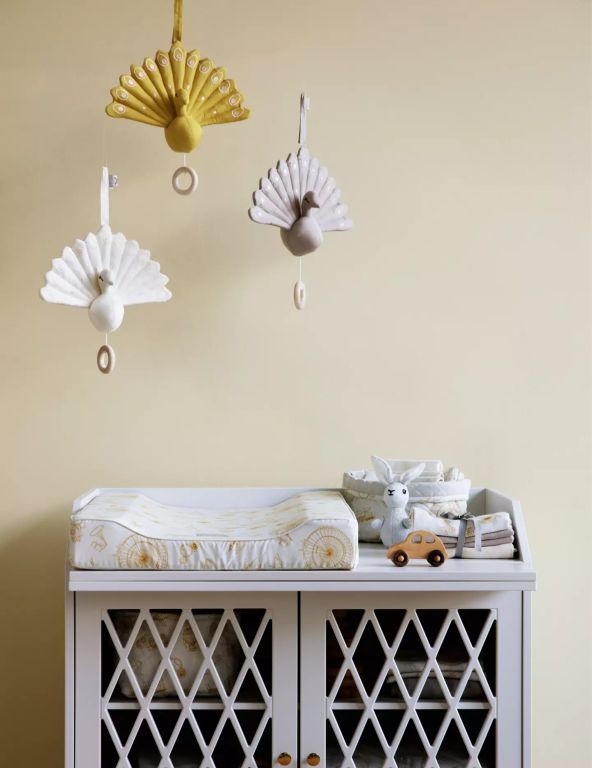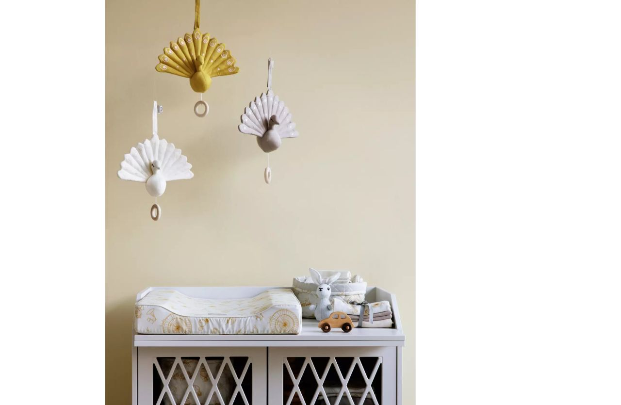 Using a mobile, you can create a little evening ritual for your baby. This beautiful musical mobile is made of organic cotton with fine embroidery. With a gentle lullaby, the cute peacock-shaped mobile takes your baby into the land of dreams.
