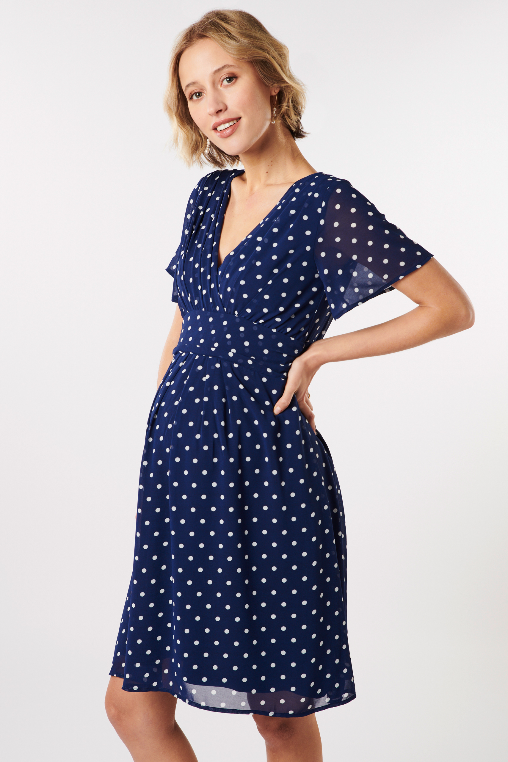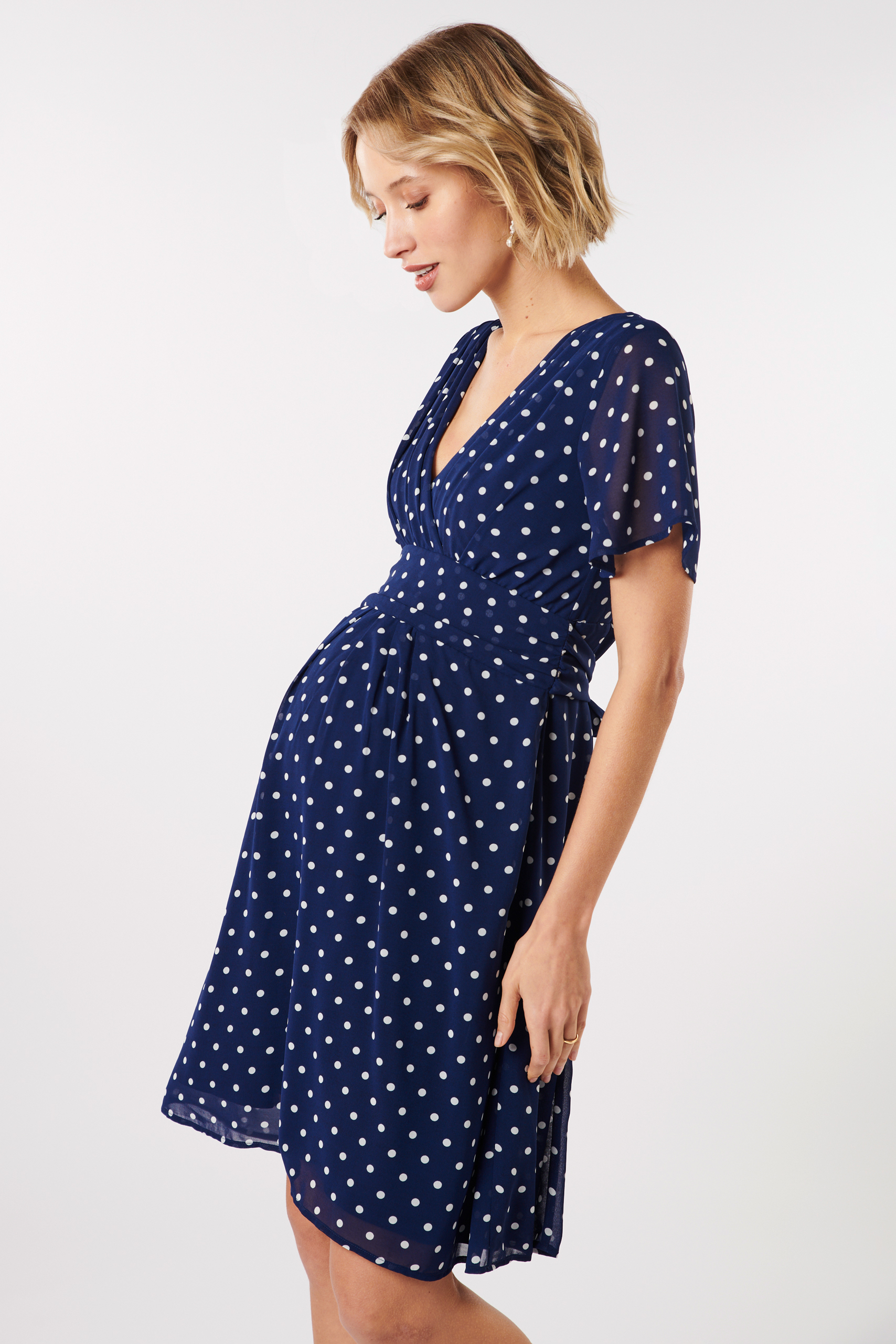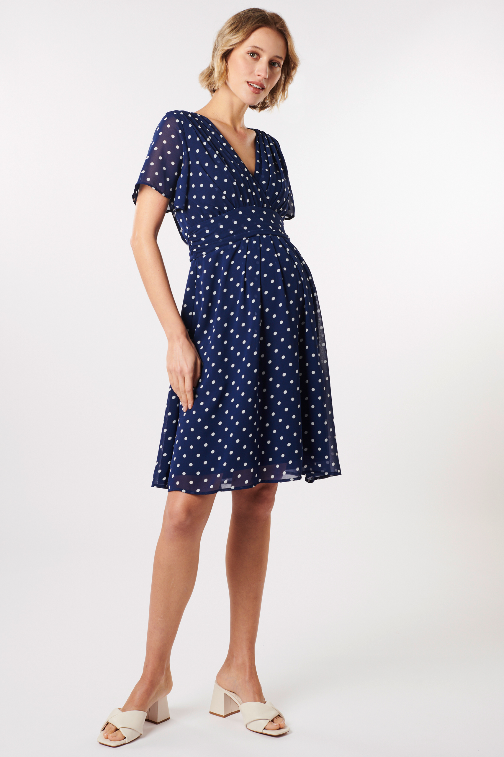 Maternity and nursing dress in A-line made of airy chiffon with dots print and transparent cap sleeves. The crossover V-neckline with special pleat detail provides for an advantageous décolleté. Smaller pleats in the center front ensure that the swinging skirt part falls loosely over your baby bump. The underdress is made of soft viscose for a comfortable feel. Thanks to the integrated tie belt you can adjust the dress flexibly to your silhouette, both with and without baby bump. Color: navy/print