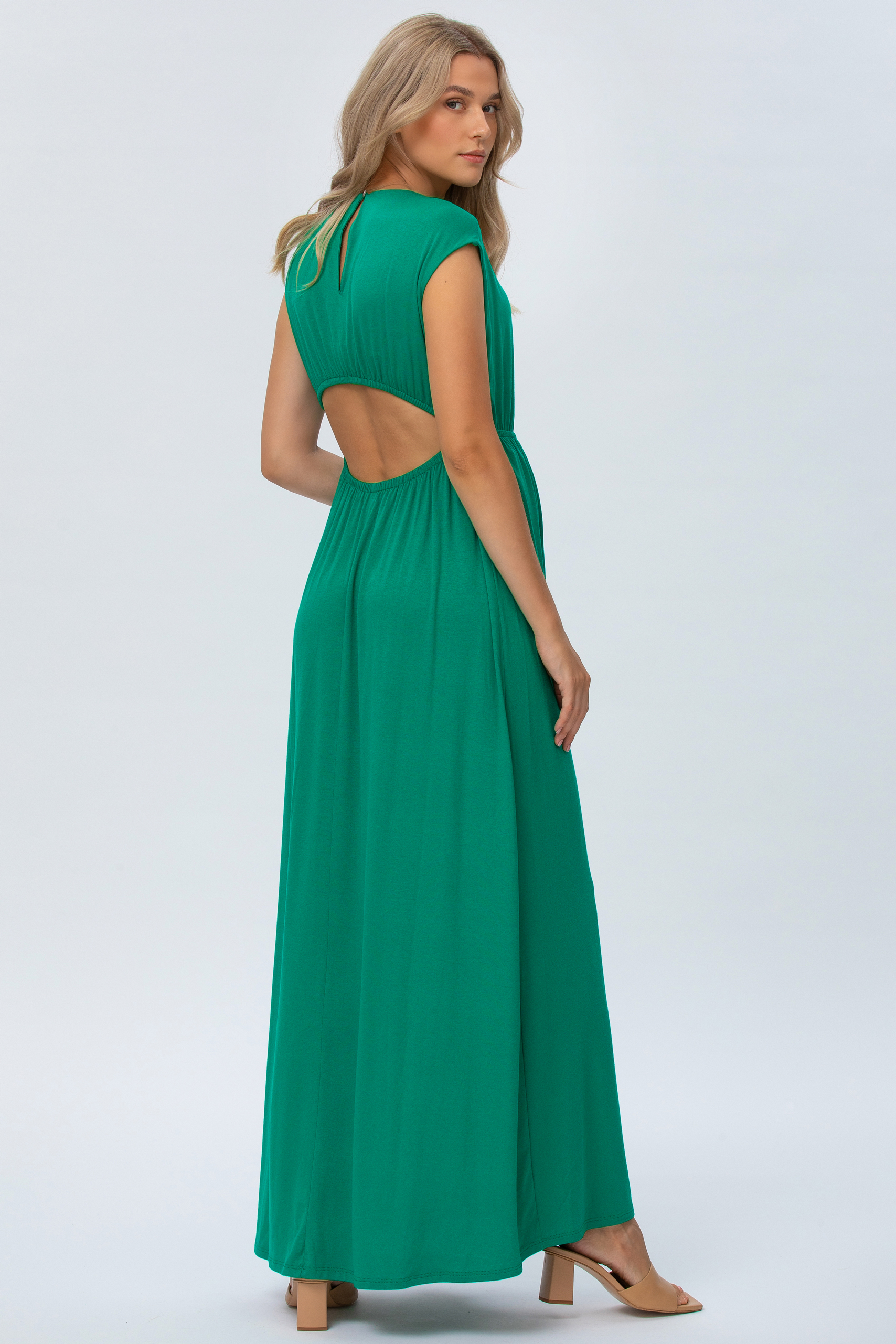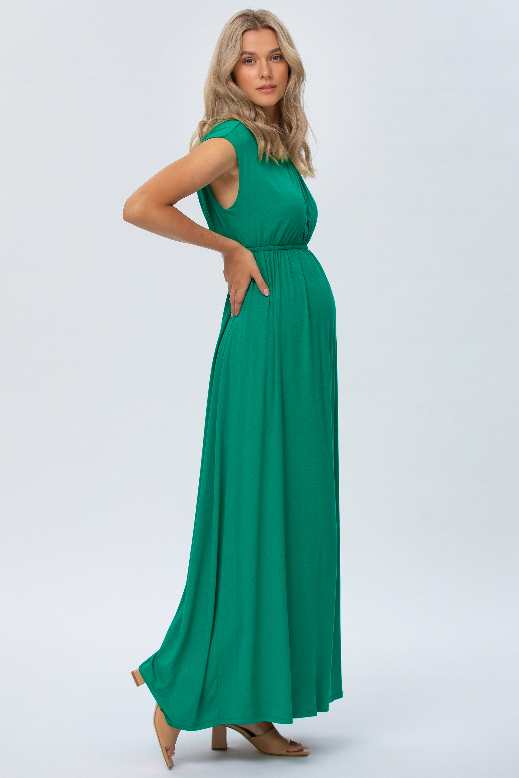 Sleeveless maxi maternity dress with back neckline and gathered waist. The long, flowing skirt and the back neckline give the dress a festive look. Thanks to the gathered waist, the dress fits perfectly to your silhouette. Color: green