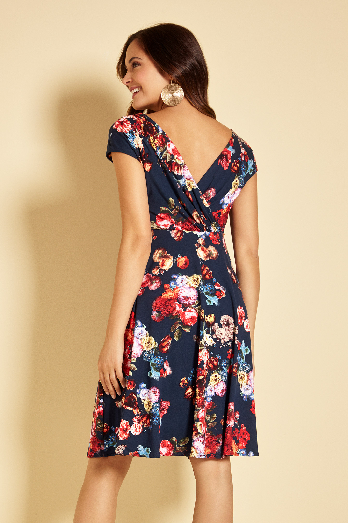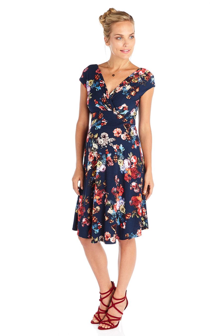 Knee length dress with slightly flouncy skirt, short sleeves and floral print. The Cache Coeur neckline provides perfect nursing access after pregnancy. Colour: midnight blue/print