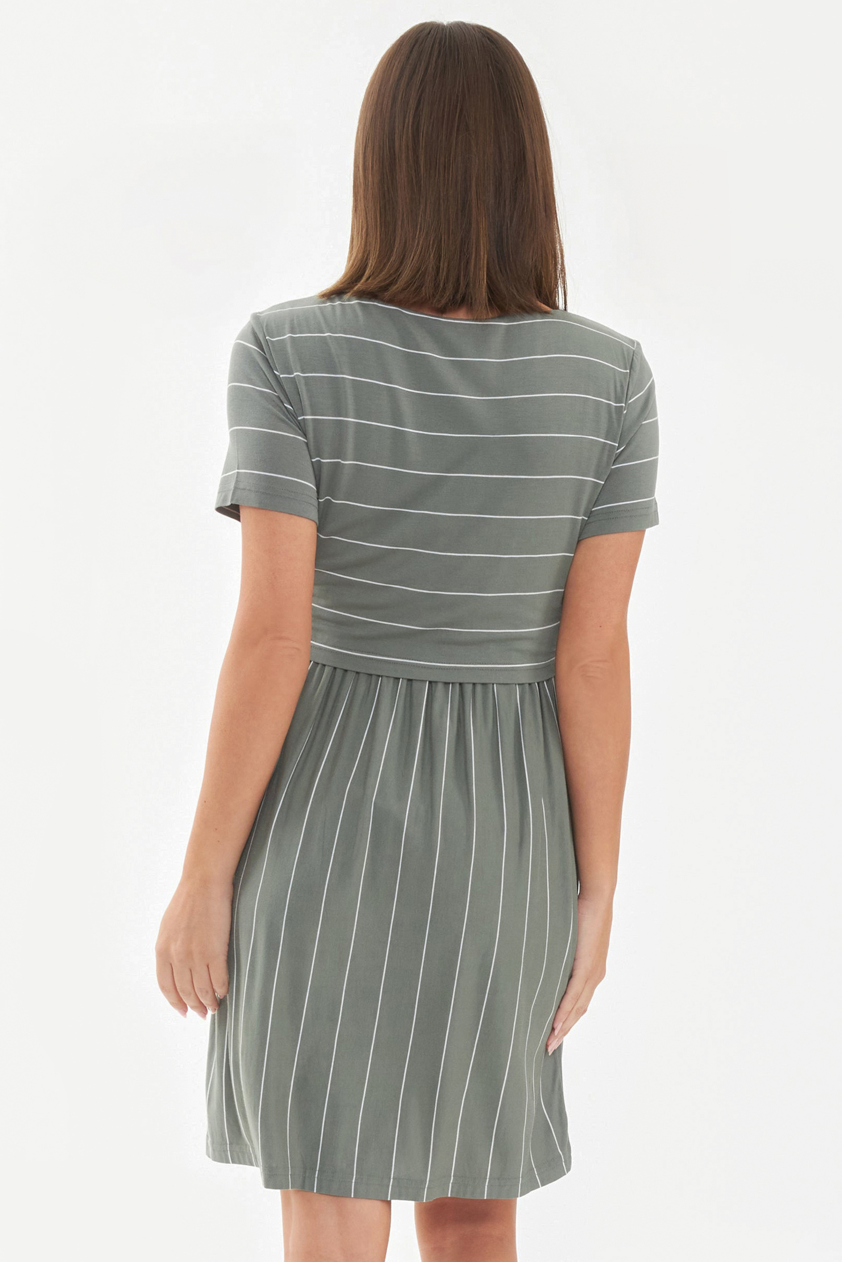 Maternity and nursing dress with advantageously placed horizontal and longitudinal stripes. Under the double-layered top is a discreet breastfeeding opening. By lifting the top layer you get a practical access to the breast. Color: olive/white