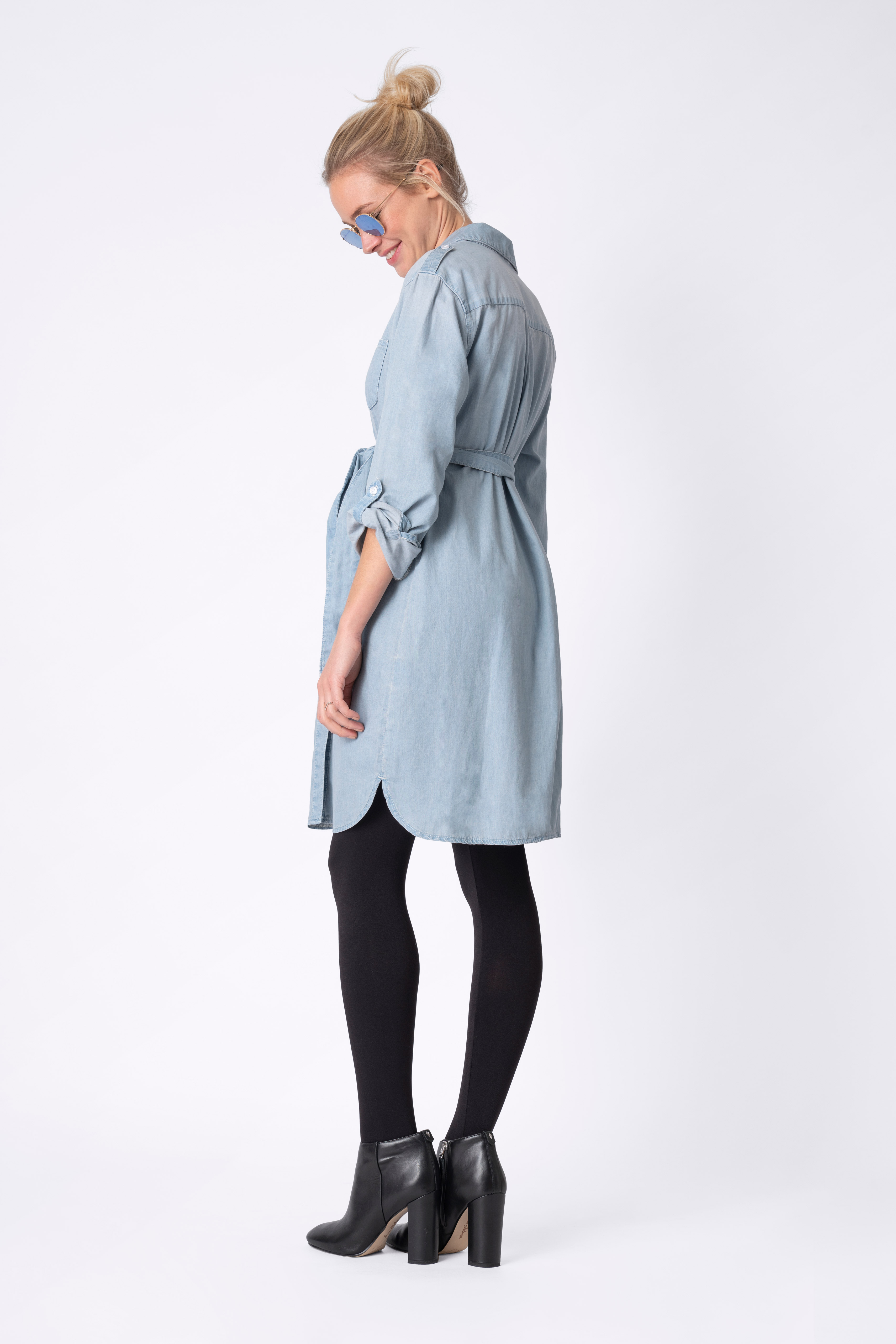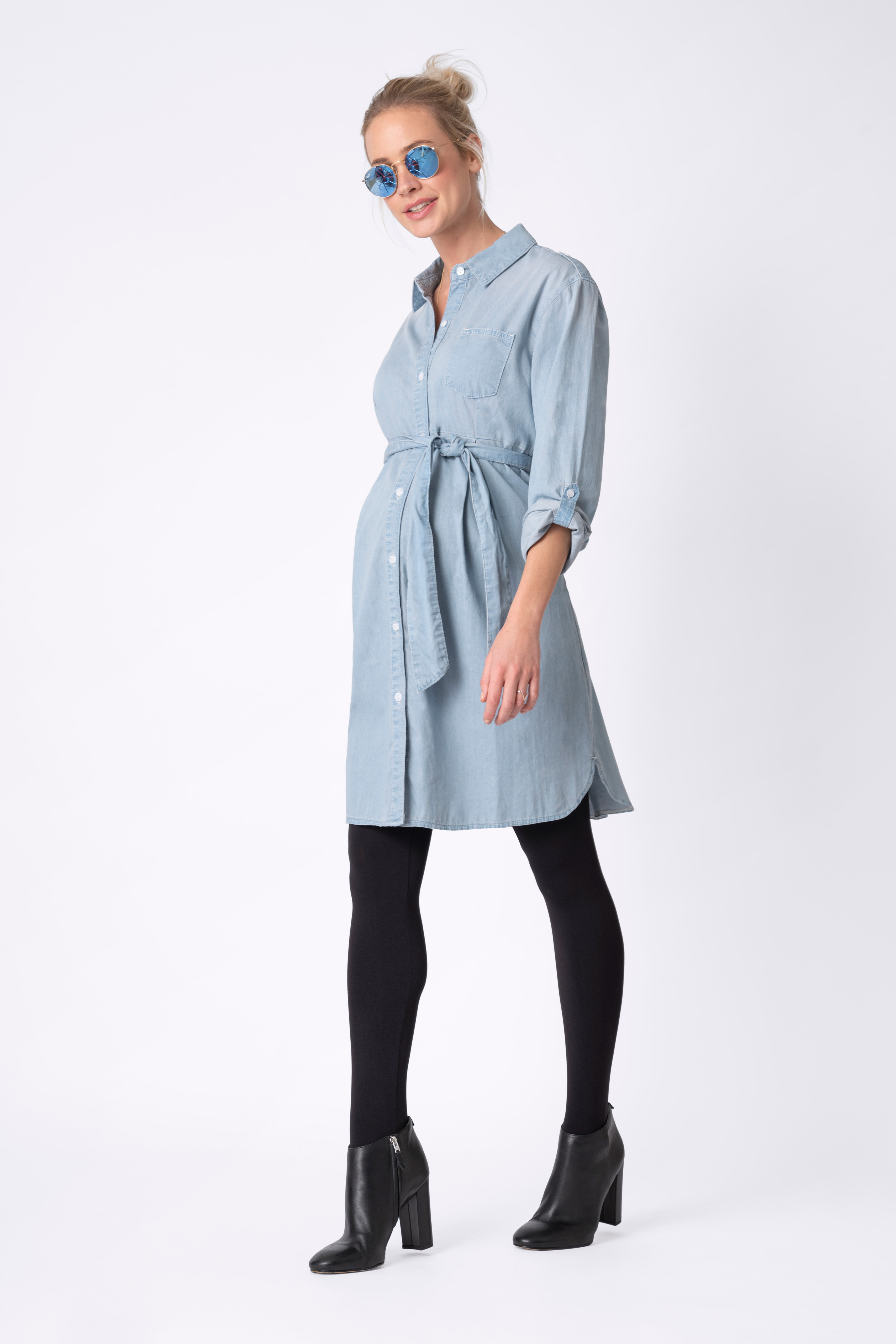 Maternity and Nursing dress made in 100% cotton and cut for a relaxed fit, the light chambray denim drapes beautifully over your curves, with a self-tie belt at the empire waist to define your figure. Featuring adjustable roll up sleeves and an easy popper down front, this dress is ideal before, during and after pregnancy. Colour: denim