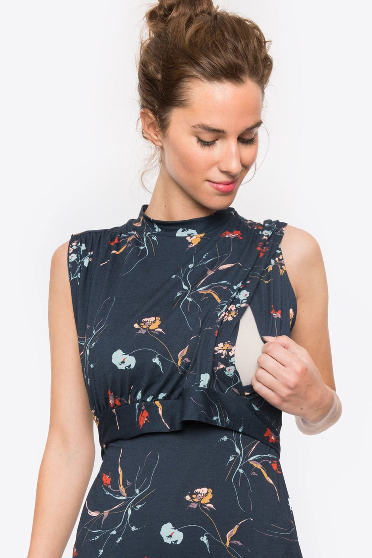 Sleeveless Maternity and Nursing Dress with Stand-Up Collar