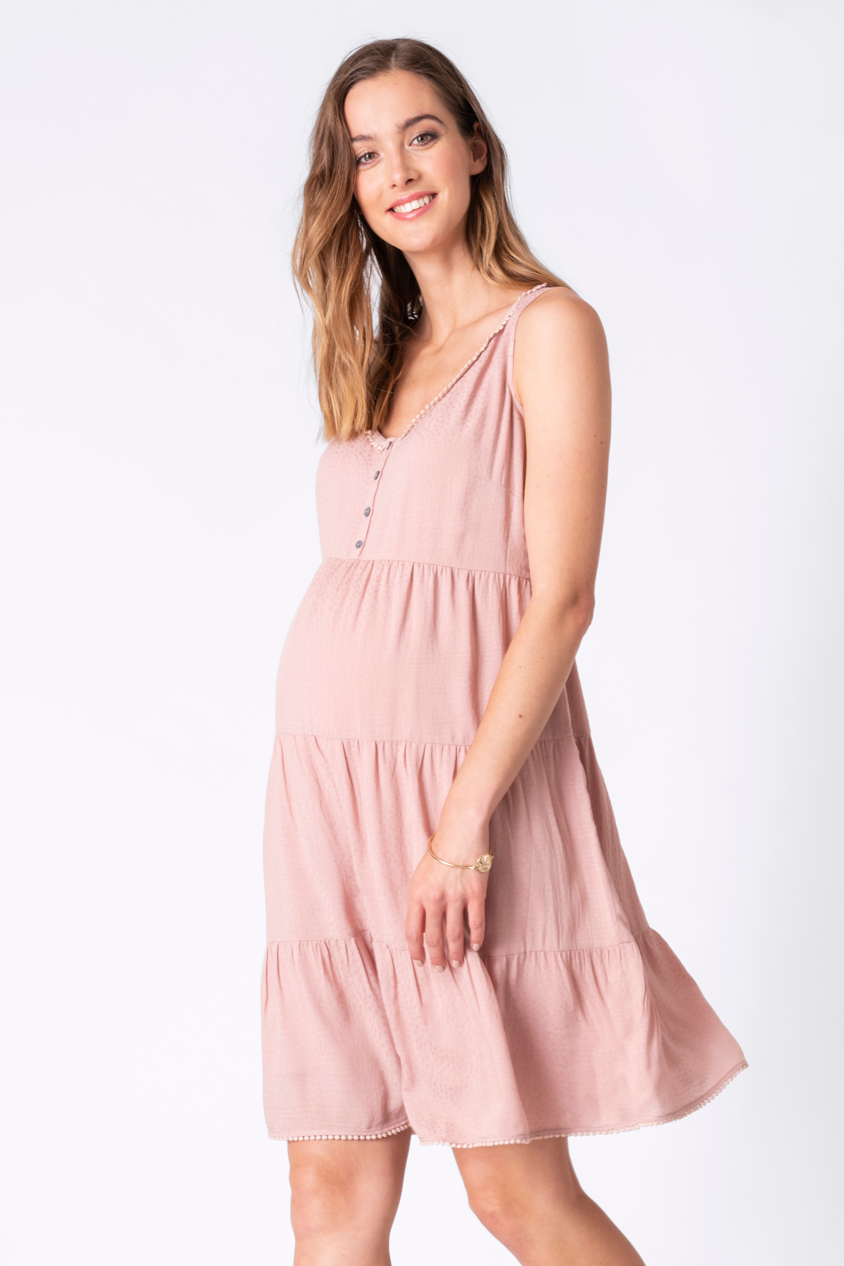 Tiered maternity and nursing dress with button placket and playful pompom trim at the hem and neckline. This light and airy dress made from soft, breathable viscose is the perfect summer dress for pregnant women and nursing mums. The wide cut leaves enough room for the baby bump to grow and after birth it conceals the belly. The short button placket in the top gives you easy access to the breast so you can nurse your baby comfortably and discreetly at any time. colour: pink