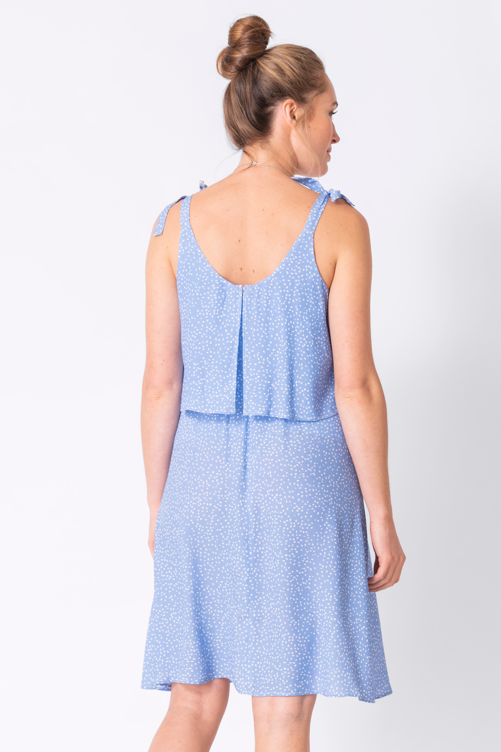 Summery maternity and nursing strap dress in a double layer design. The light dress made from soft, breathable viscose is super comfortable to wear. It falls loosely over your baby bump and leaves room for it to grow until birth. The straps are adjustable and the bows give the dress an extra playful look. After birth, you can comfortably nurse your baby in it by sliding the double layers of fabric on the top apart. You can also continue to wear the dress after nurding period. Colour: light blue