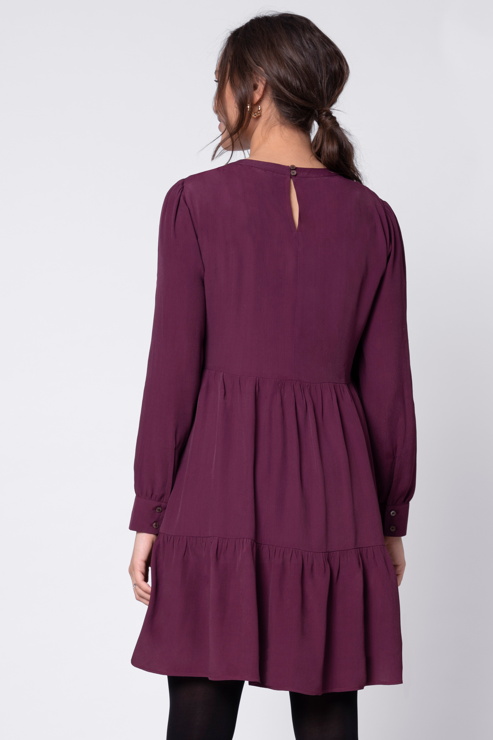 Maternity and nursing dress in super soft viscose with floral embroidery at the neckline. The flouncy skirt falls smoothly over your baby bump and swings as you walk. Hidden zips in the top allow you to nurse your baby discreetly and easily later. Colour: bordeaux