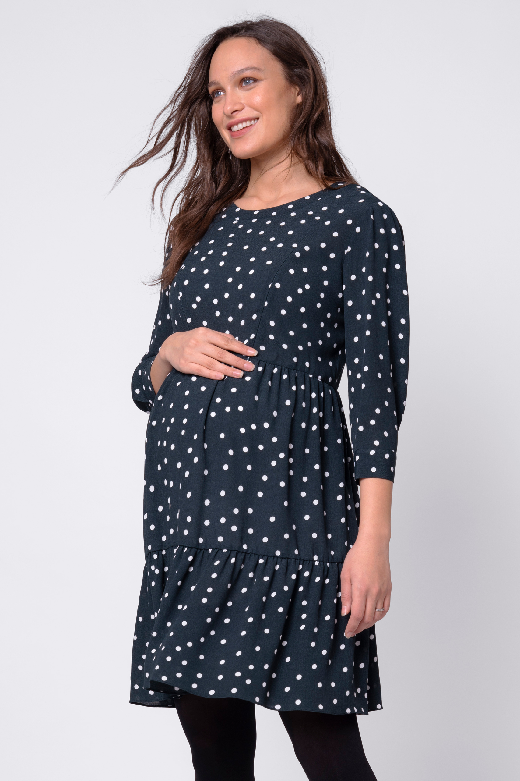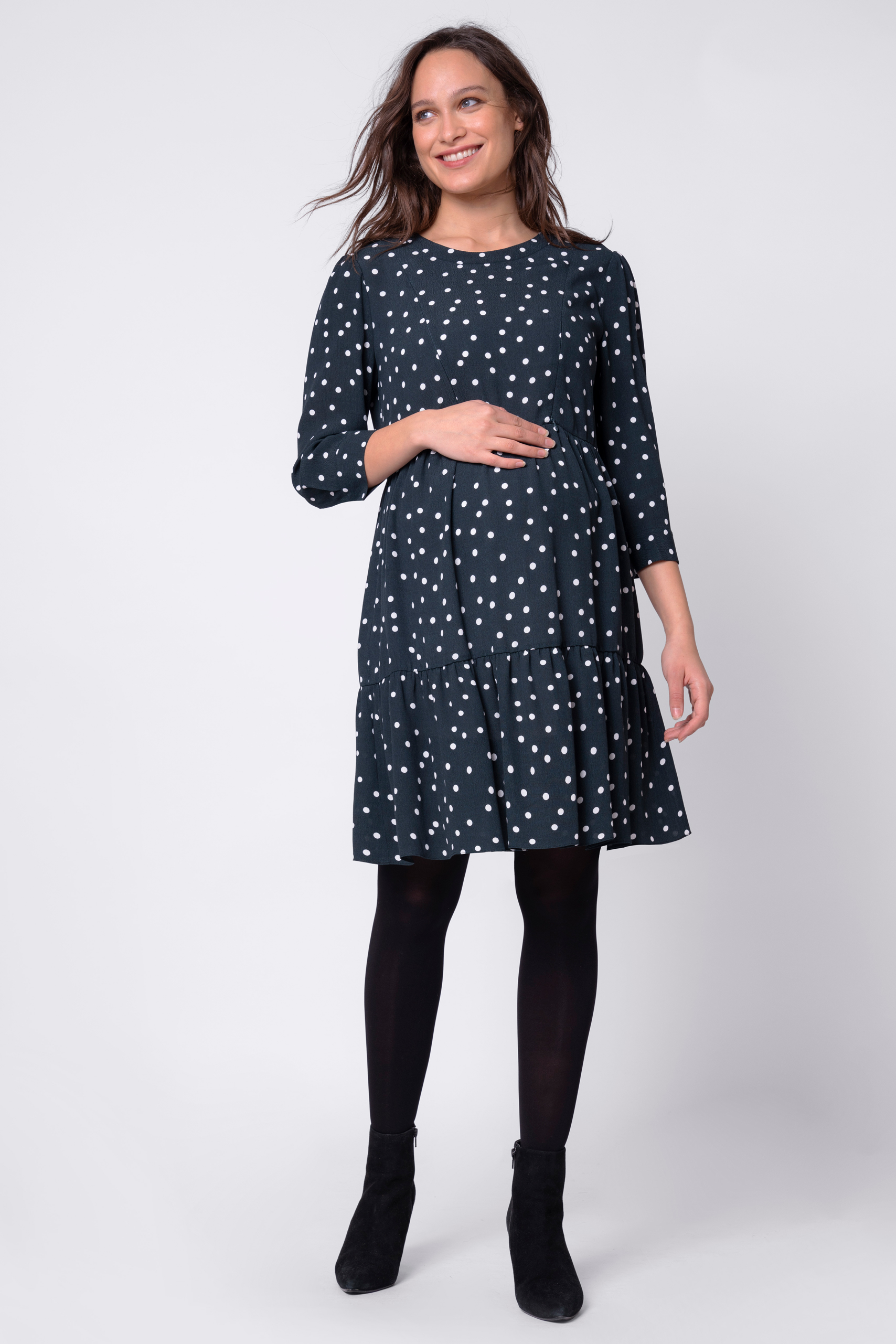 Maternity and nursing dress in super soft viscose with 3/4 sleeves and polka dot print. The flouncy skirt falls smoothly over your baby bump and swings as you walk. Hidden zips in the top allow you to nurse your baby discreetly and easily later. Colour: turquoise