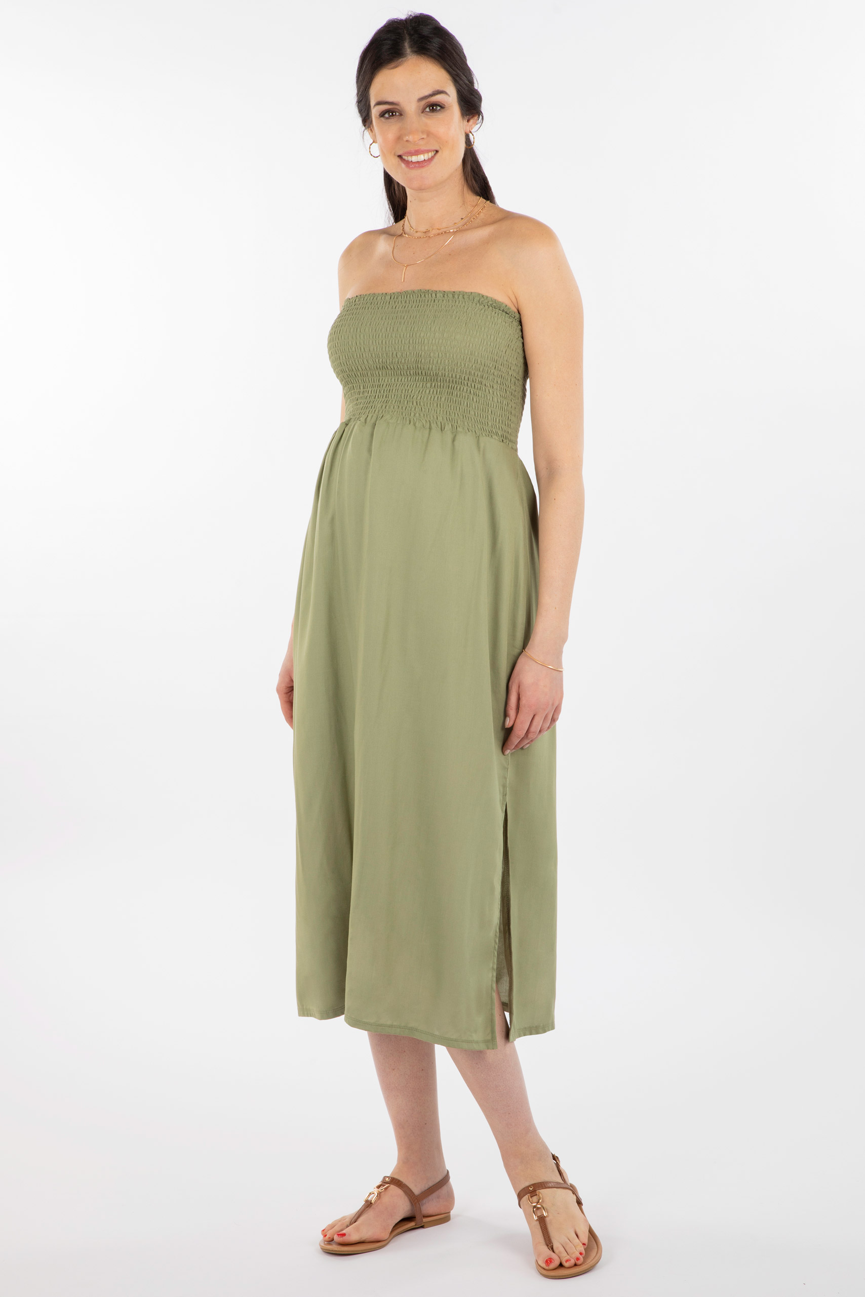 Our 2 in 1 maternity skirt and dress in light, airy viscose with a smocked waistband/bandeau is the perfect companion for trips to the beach or the city. The knee-length bandeau dress fits perfectly to your changing silhouette with a smocked bust area and falls loosely over your baby bump. As a skirt, you can wear the waistband over your belly or fold it down, just as you like. Pair it with your favorite nursing top and sandals and you've got a summer look. Thanks to the flexible, smocked insert, you can also wear the dress or skirt after the birth. Colour: khaki