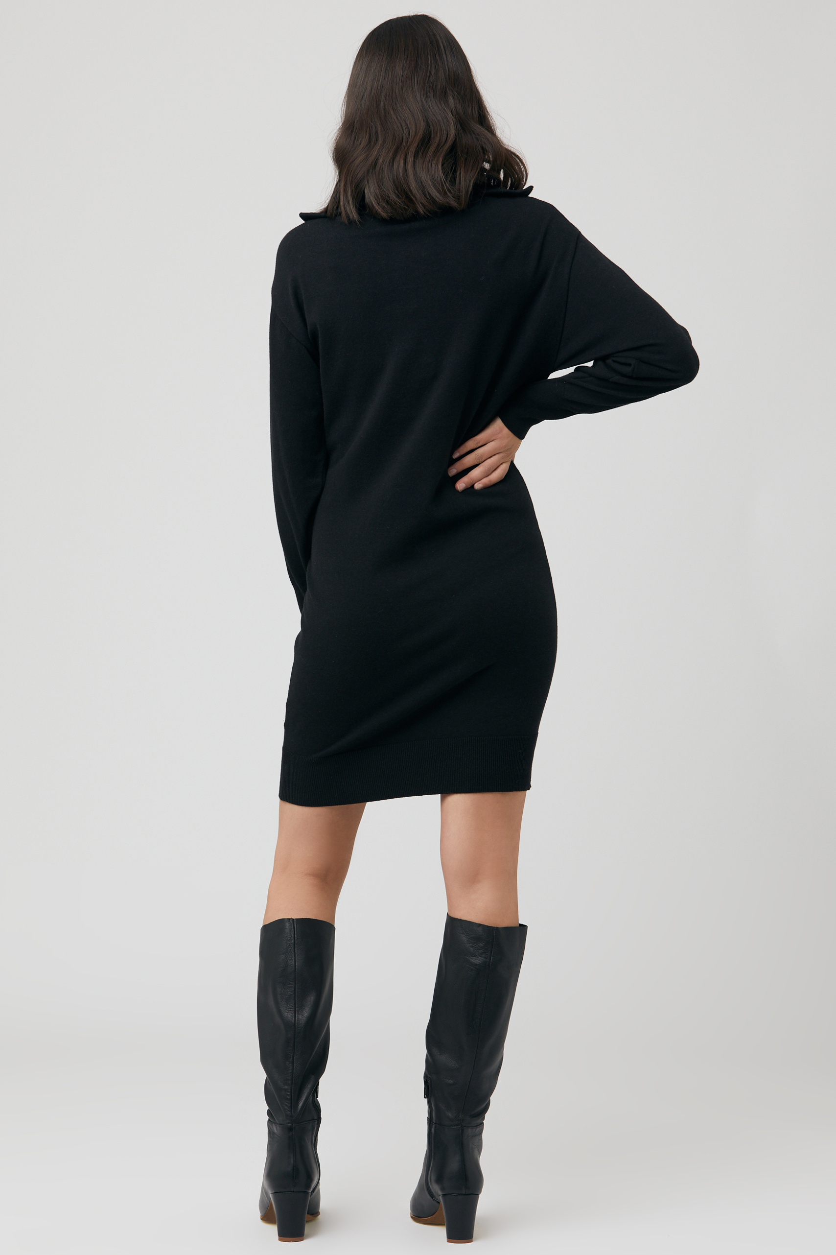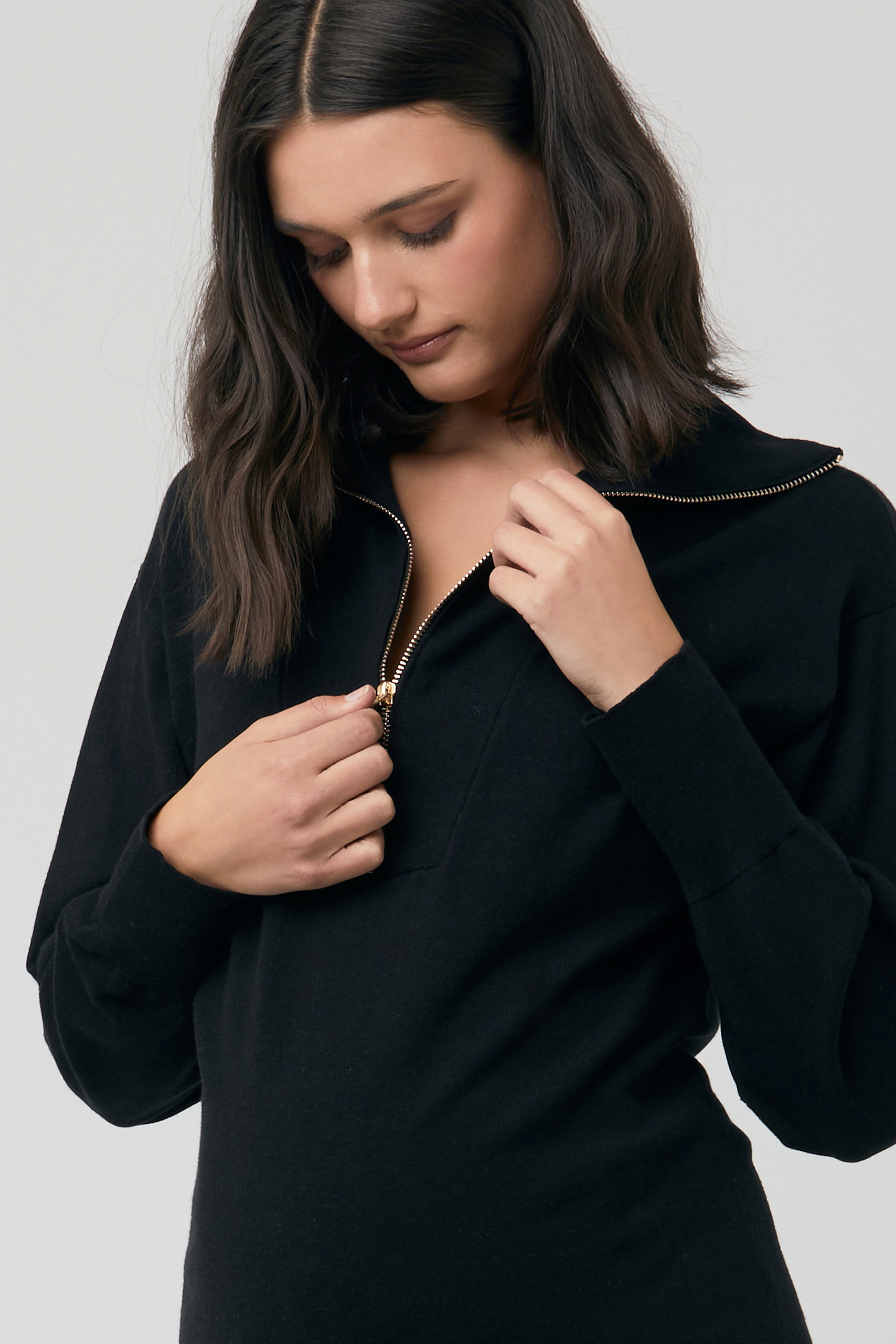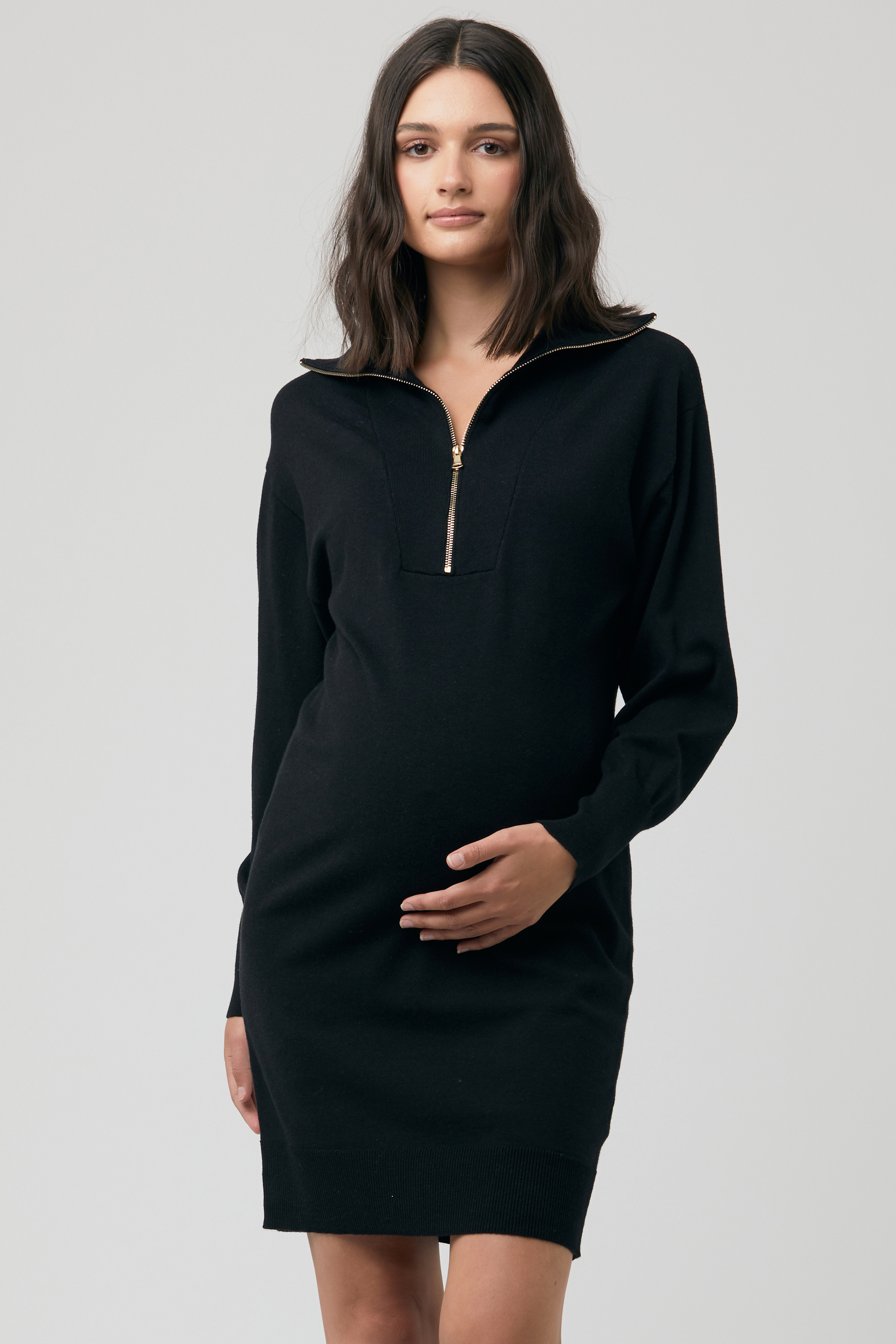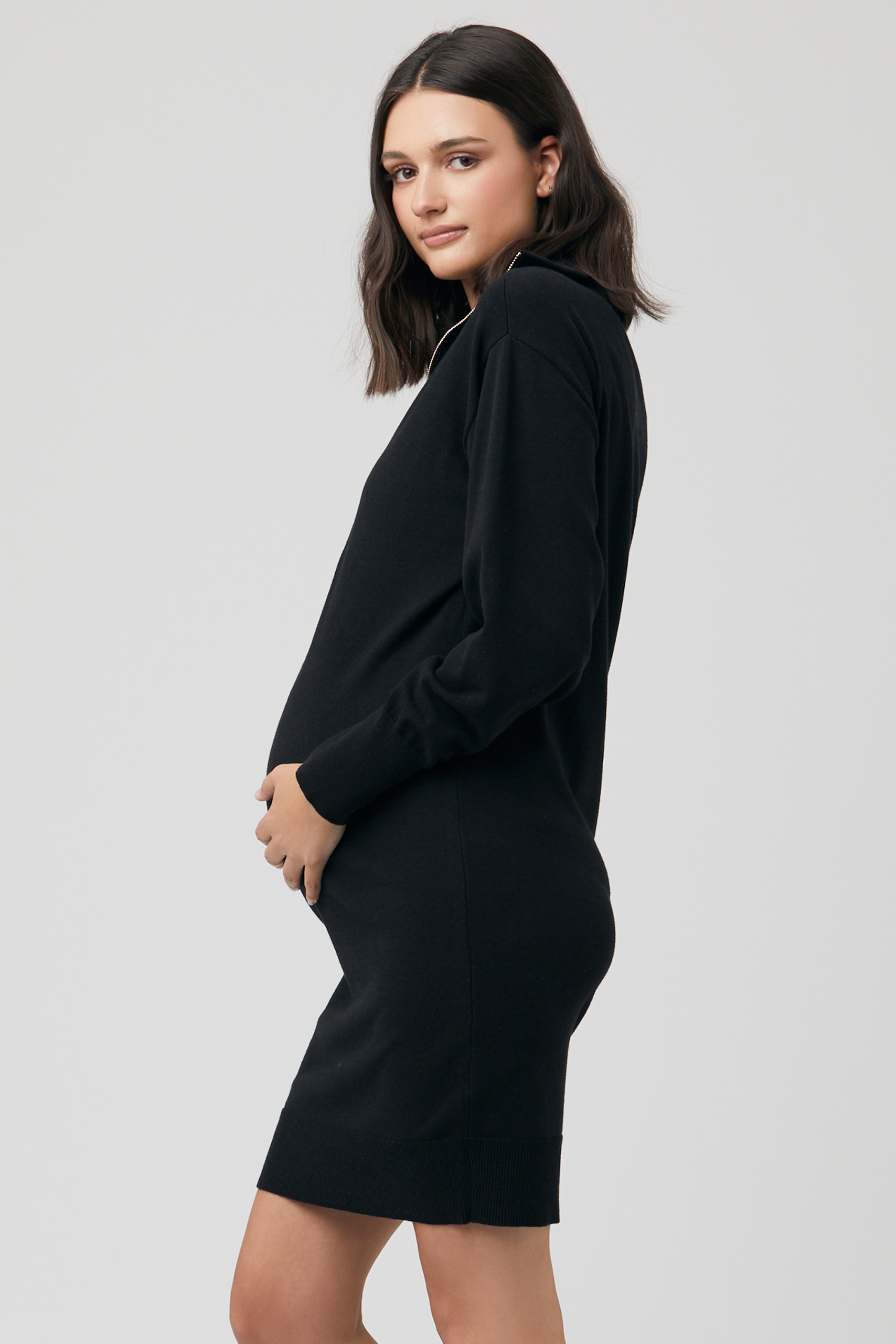 Short maternity and nursing dress in soft stretch jersey with long sleeves. The casual cut leaves enough room for your baby bump until birth. A special highlight is the golden zip at the chest, which gives you quick and easy access to nurse. You can also wear the dress later without the baby bump. Colour: black