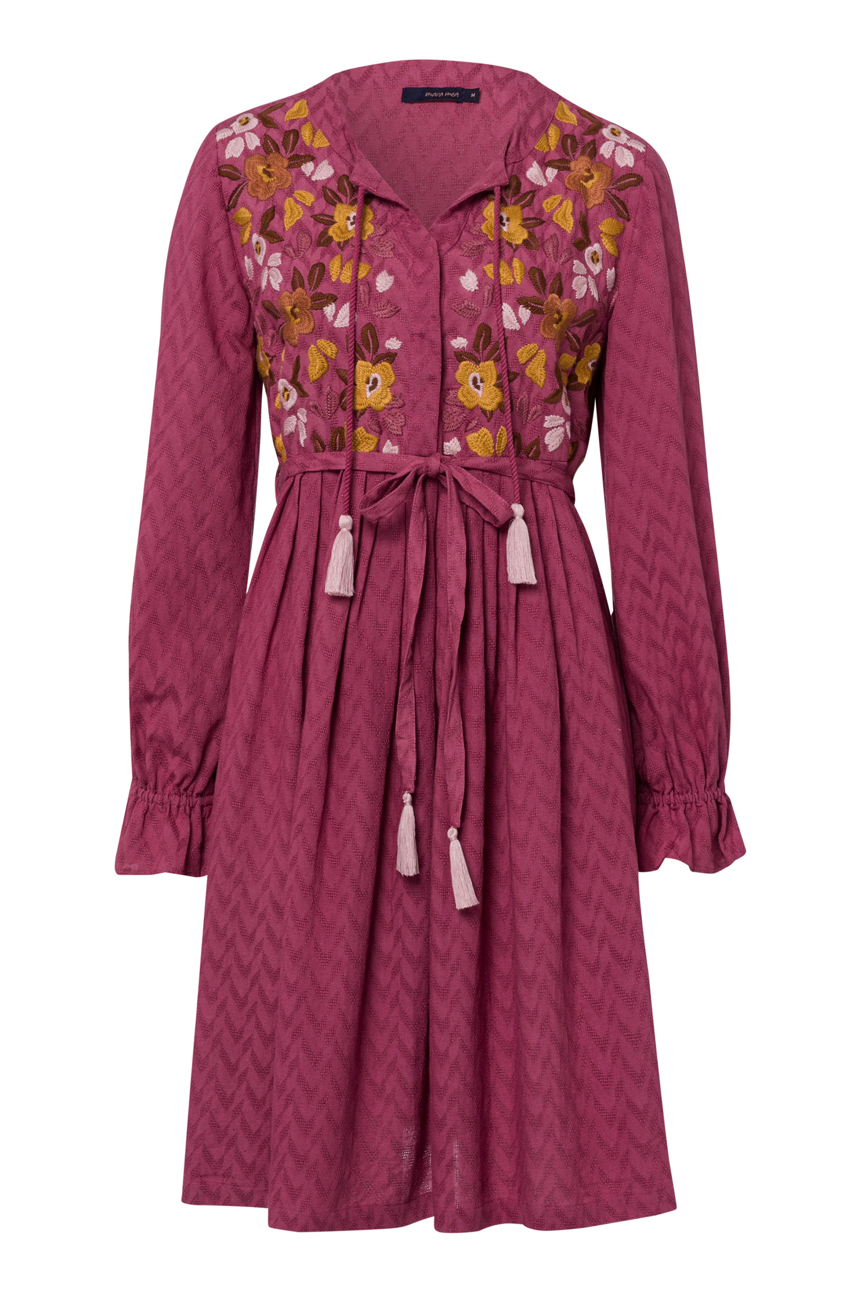 Maternity and nursing tunic dress cliff rose with flowers, embroidery and tassels. Wide trumpet sleeves give the dress a special touch. Thanks to the wide cut, your baby bump has plenty of room to grow. A hidden button placket allows you to breastfeed your baby discreetly later. Colour: pink