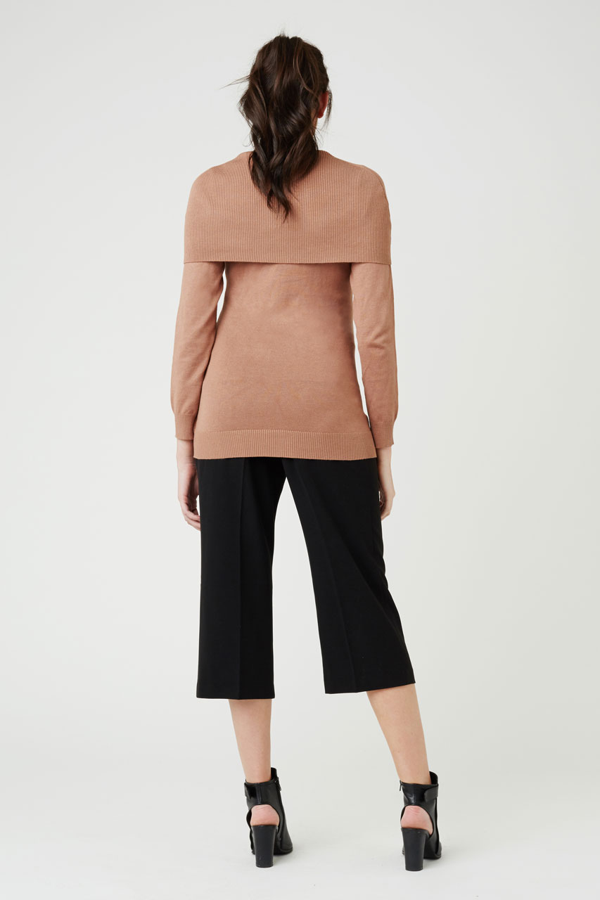 Longline maternity sweater with a shoulder collar and a hint of a roll collar in a fine rib pattern.