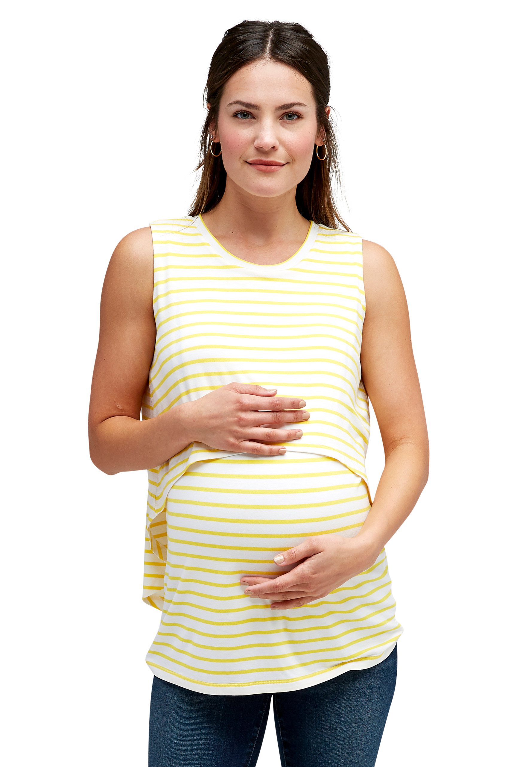 Umstands- und Stilltop aus weichem und elastischem Viskosemix in zweilagigem Design. In der Schwangerschaft findet dein Bauch ausreichend Platz darin dank extra Stretch-Anteil, über die obere Stoffschicht erhältst du später dann einen schnellen Stillzugang. Farbe: gelb/weiß