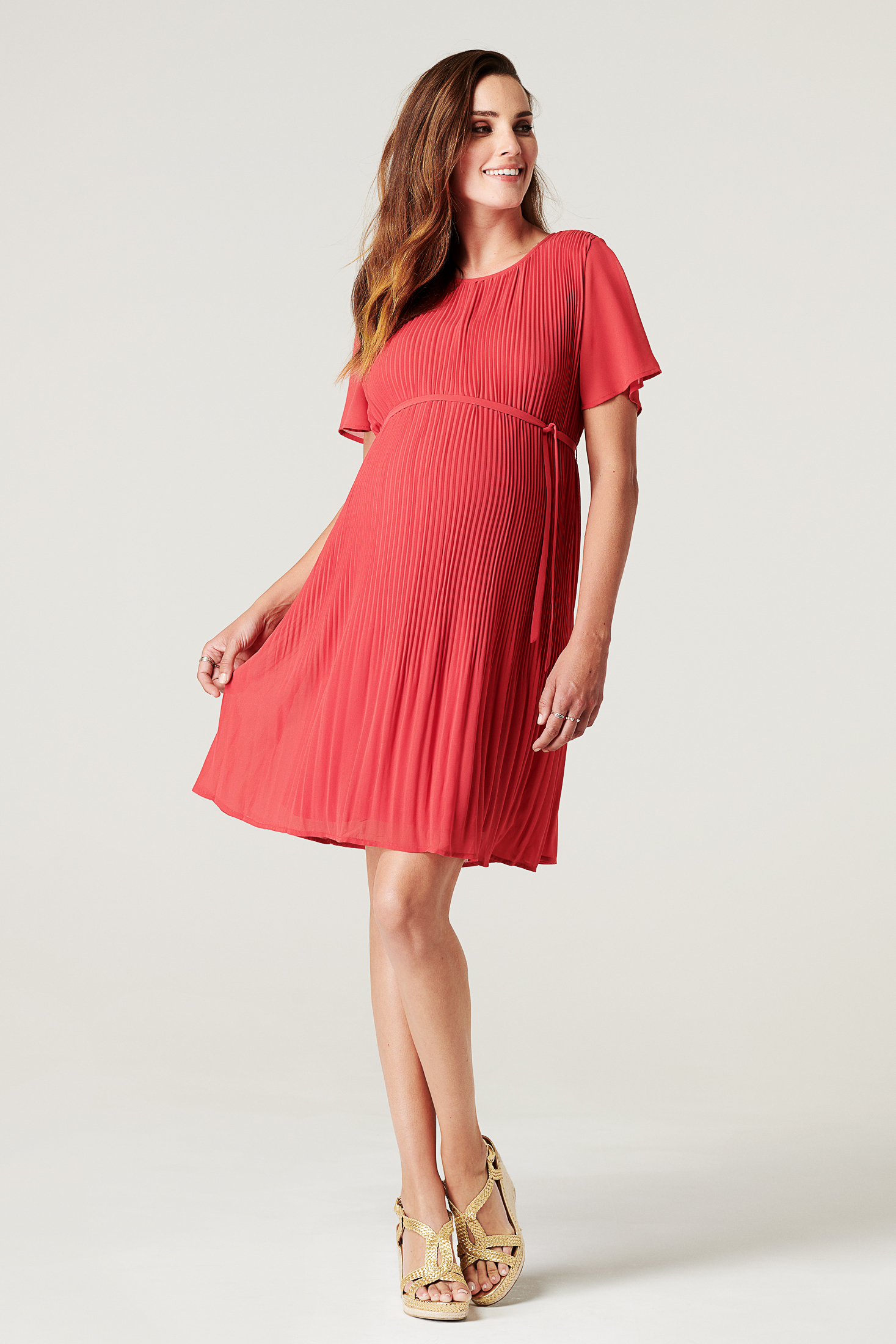 Short maternity dress in recycled material with short cap sleeves and pleats. The special fit ensures there will always be enough room for your baby bump. A tie under the bust creates a beautiful silhouette and accentuates your baby bump. Colour: brown