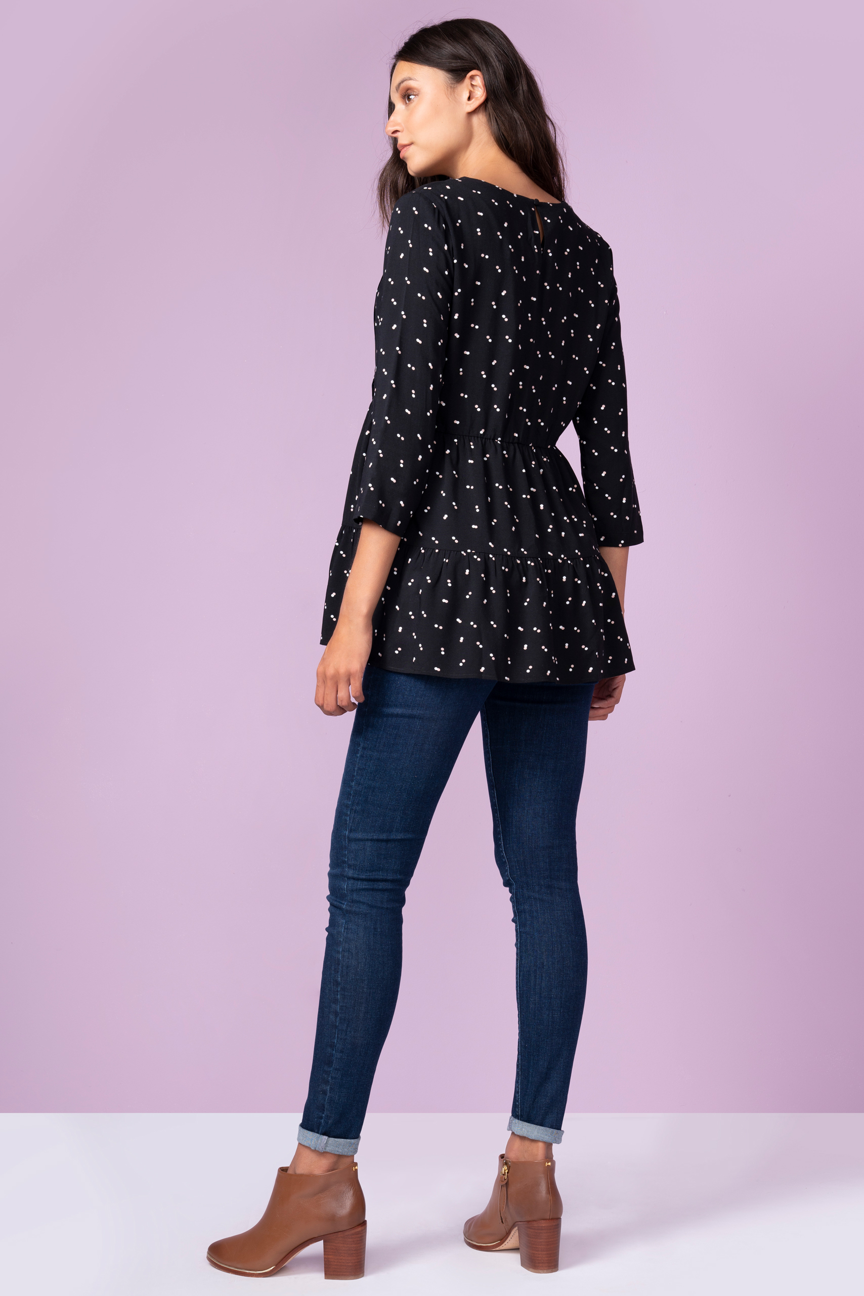 Soft maternity and nursing tunic with a round neck, short sleeves and frilled hem. The fit and the stretchy, soft material give your growing bump plenty of room to grow throughout your pregnancy. Once baby arrives, you'll have easy access for breastfeeding thanks to the concealed zip. Colour: black