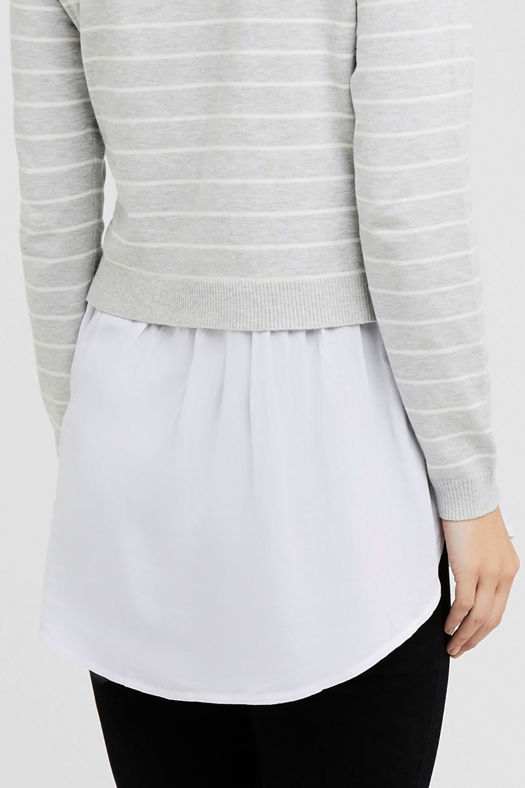 Layered maternity jumper with textile blouse part. The soft jersey top part has a round neck and short rib knit cuffs. When nursing later on, just push up the top to be able to nurse easily. The wide blouse part covers your bump wonderfully during all stages of your pregnancy. Colour: pink/white