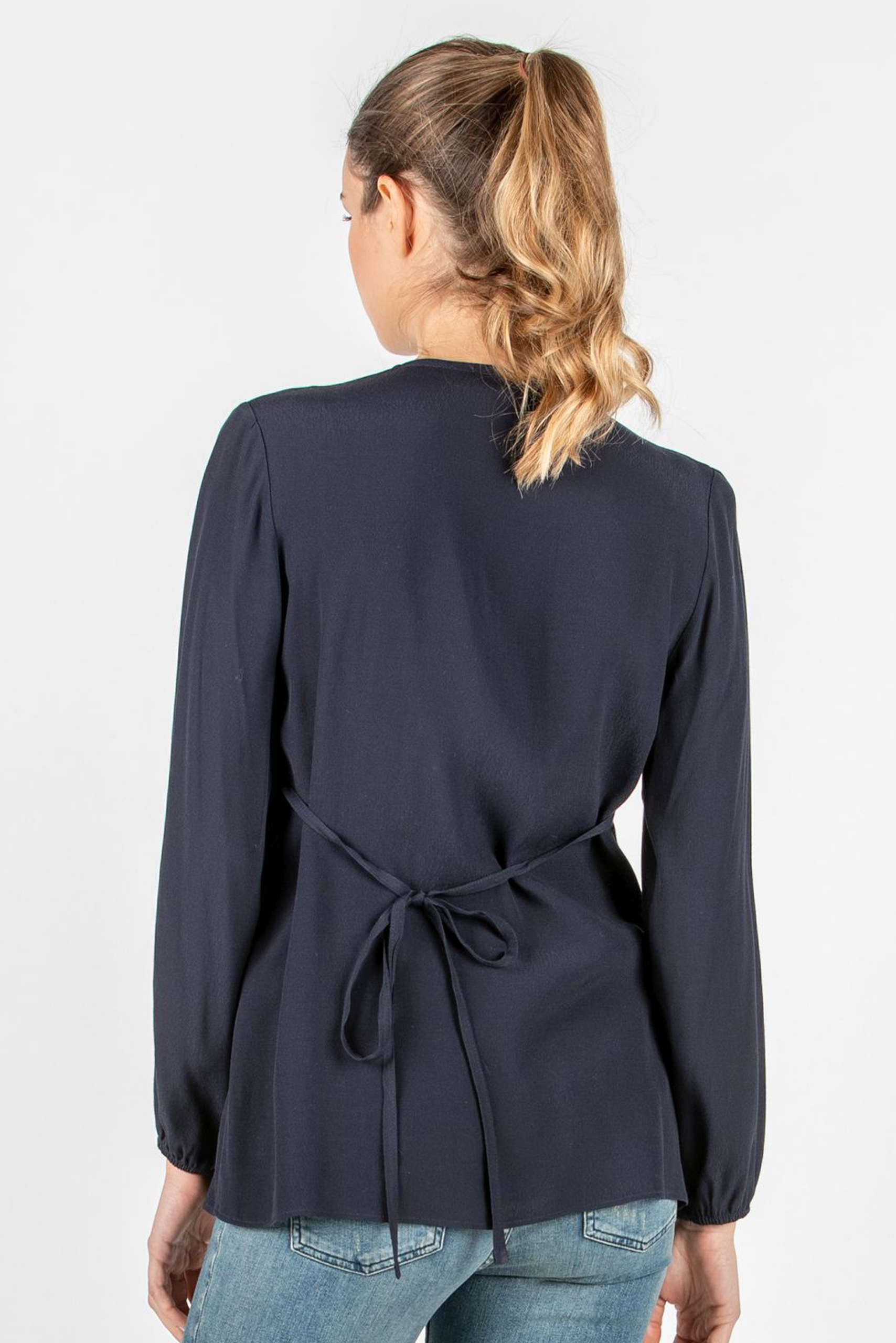 Maternity blouse with cross-over neckline and narrow tie belt that ties into a bow at the back. Gathers over the bump and the flexible binding ensure that the soft viscose blouse always fits perfectly, no matter what week of pregnancy you wear it. Colour: navy