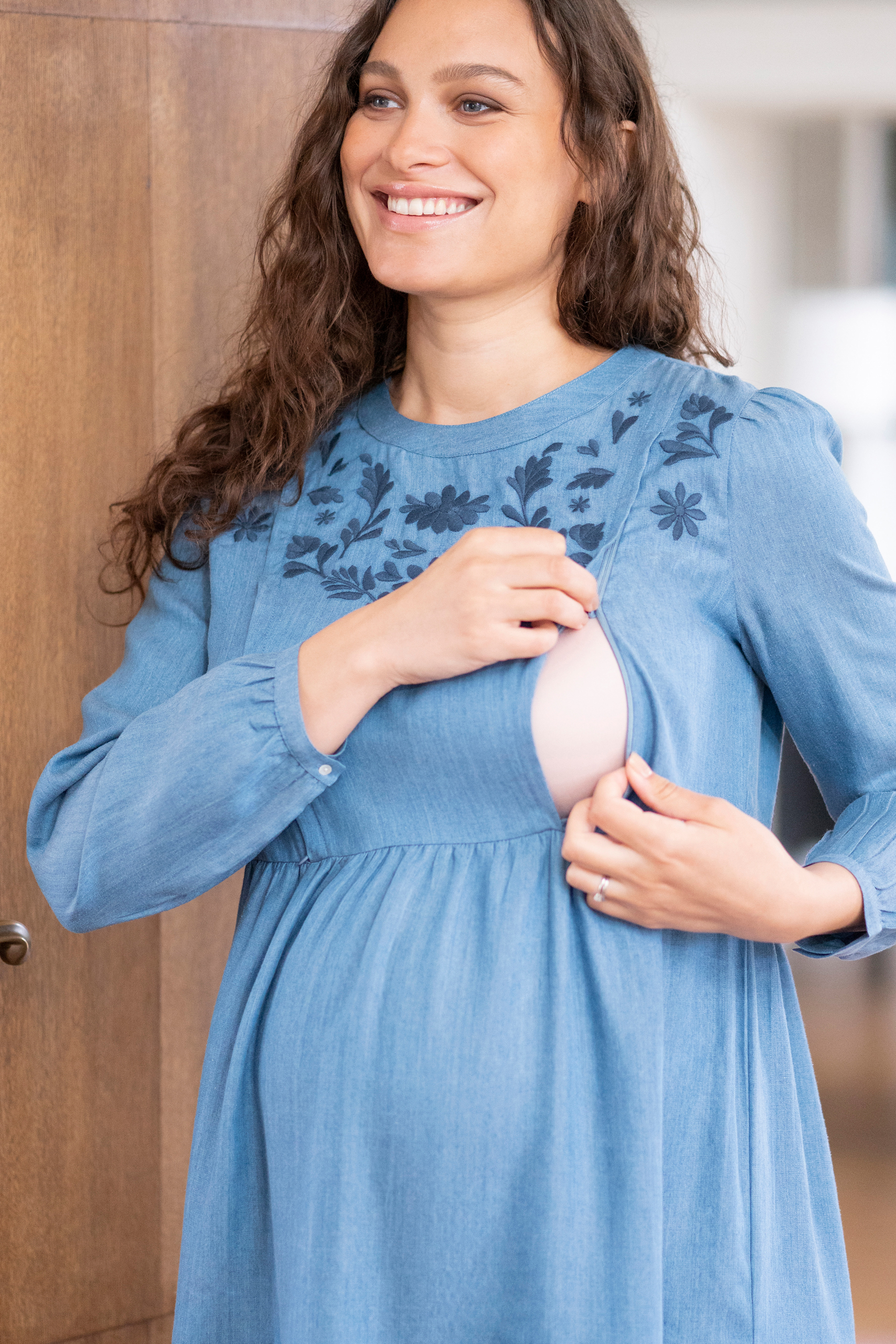 Maternity and nursing dress in super soft and sustainable Tencel viscose* with floral embroidery at the neckline. The flouncy skirt falls smoothly over your baby bump, leaving plenty of room for it to grow. Hidden zips in the top allow you to nurse your baby discreetly and easily later. Colour: denim