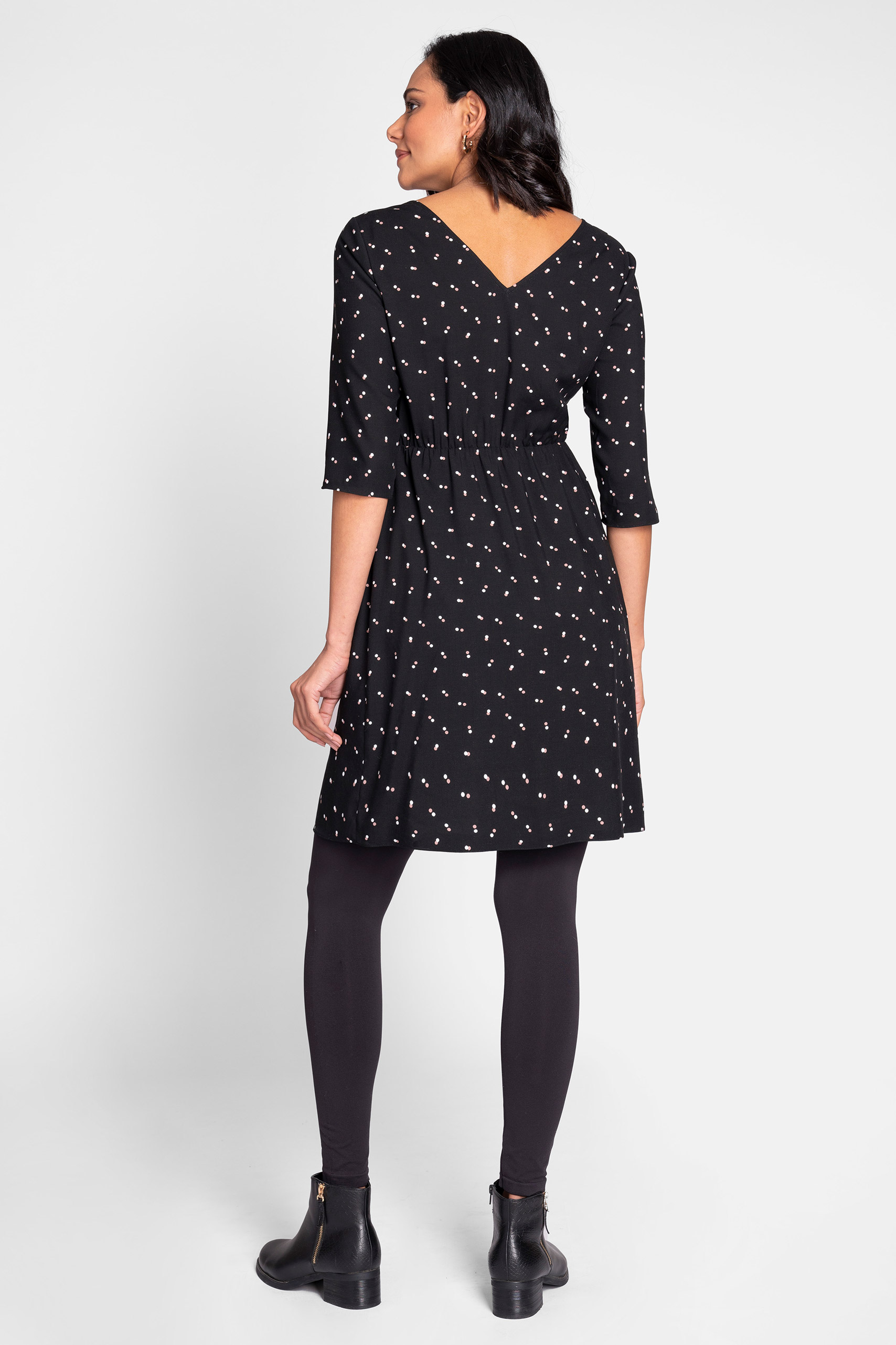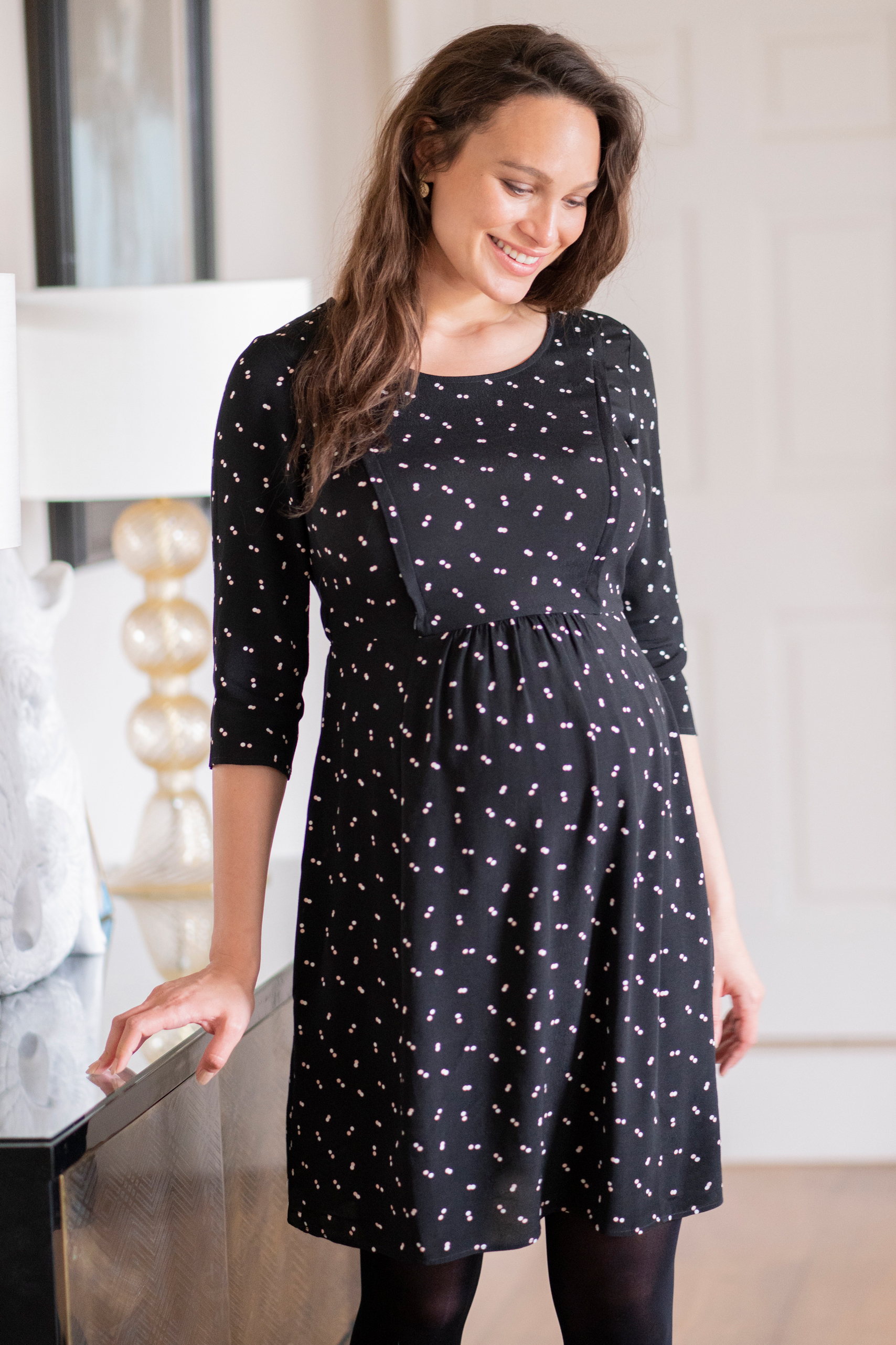 Maternity and nursing dress in soft viscose with round neckline, 3/4 sleeves and polka dot print. An elastic seam between the bust and baby bump creates a great silhouette and accentuates your baby bump, which has plenty of room to grow. Even without a baby bump, you can still wear the dress later. Concealed zips on the top allow easy and discreet nursing access later. Colour: black
