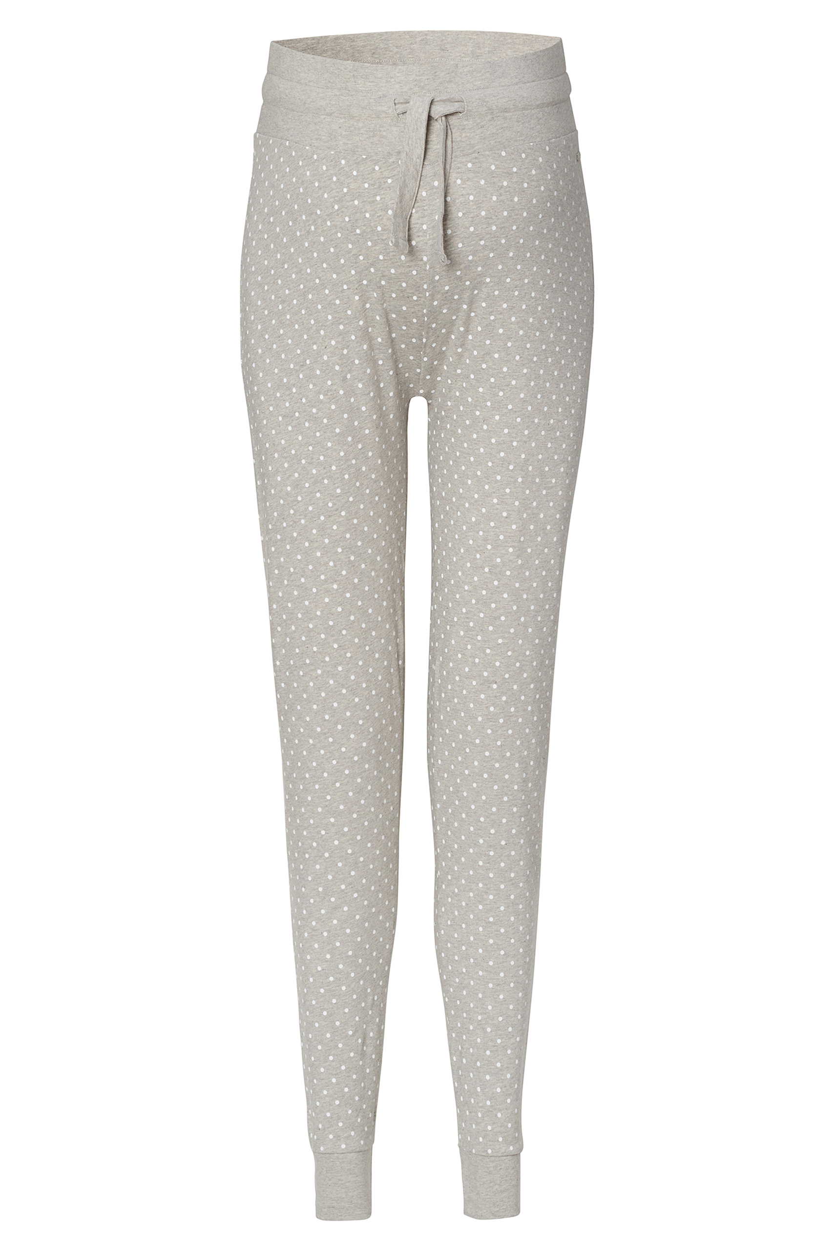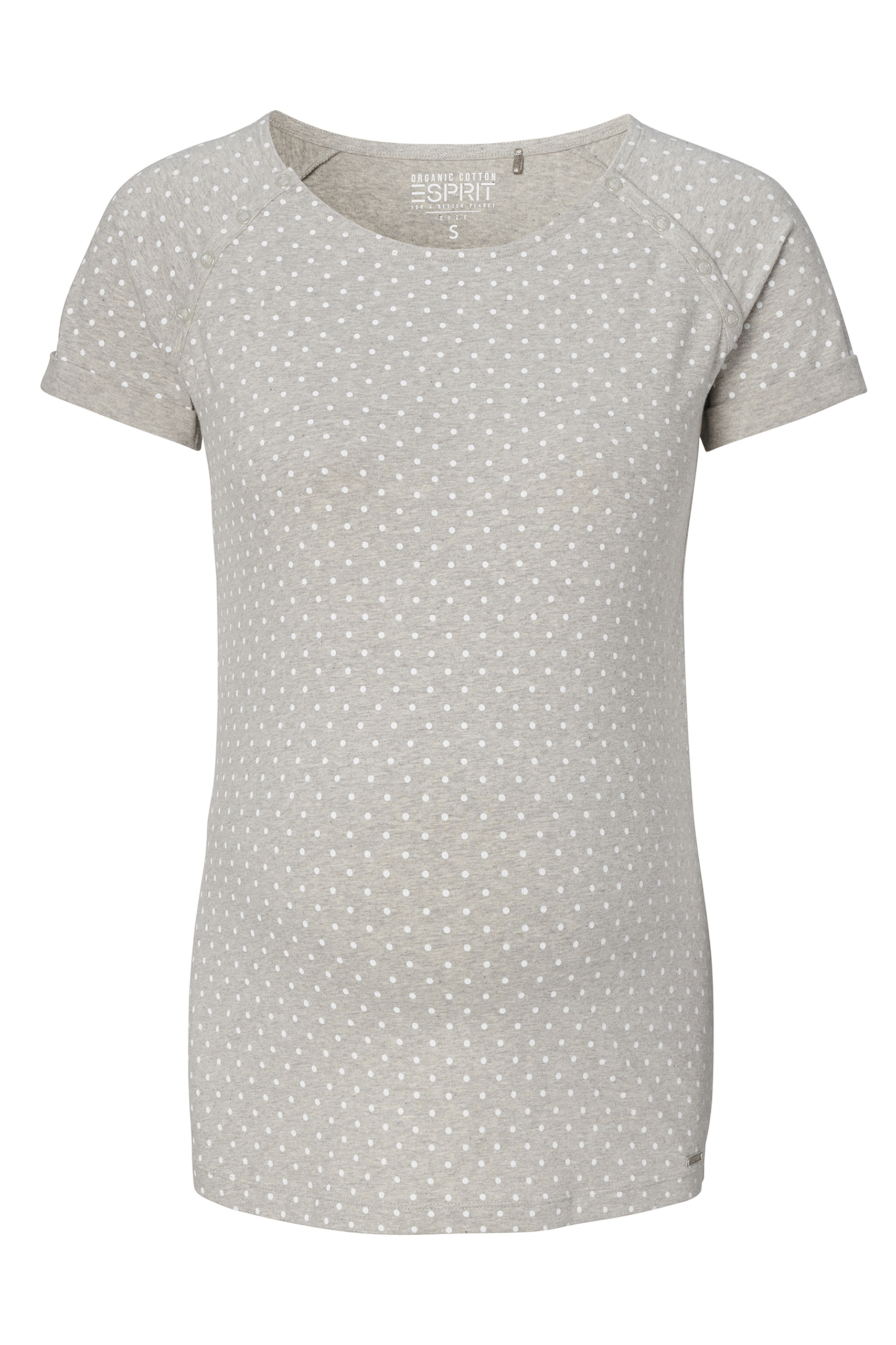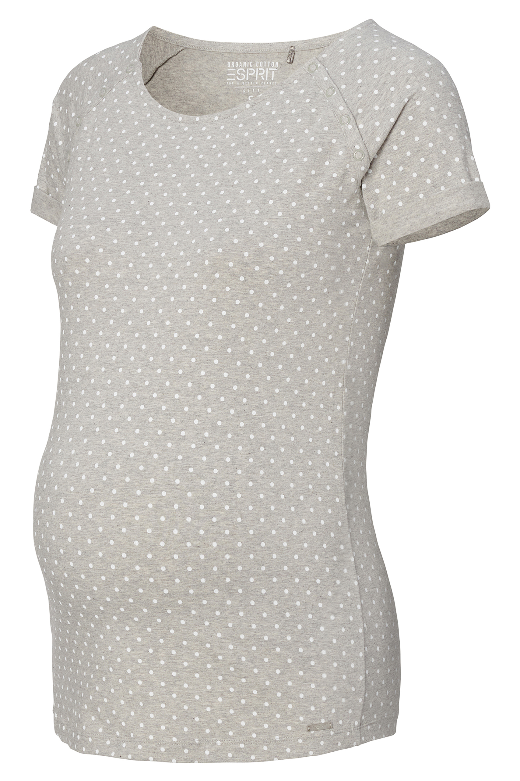 Maternity and nursing pyjamas made of GOTS certified organic cotton, consisting of a short-sleeved shirt and long trousers. The all-over polka dot print gives the pyjamas a playful touch. The breathable, soft material is super comfortable to wear. The wide waistband of the trousers with drawstring fits your baby bump perfectly. You can still wear the pyjamas after the birth. The buttons at the neckline make it easy to nurse your baby. Colour: grey