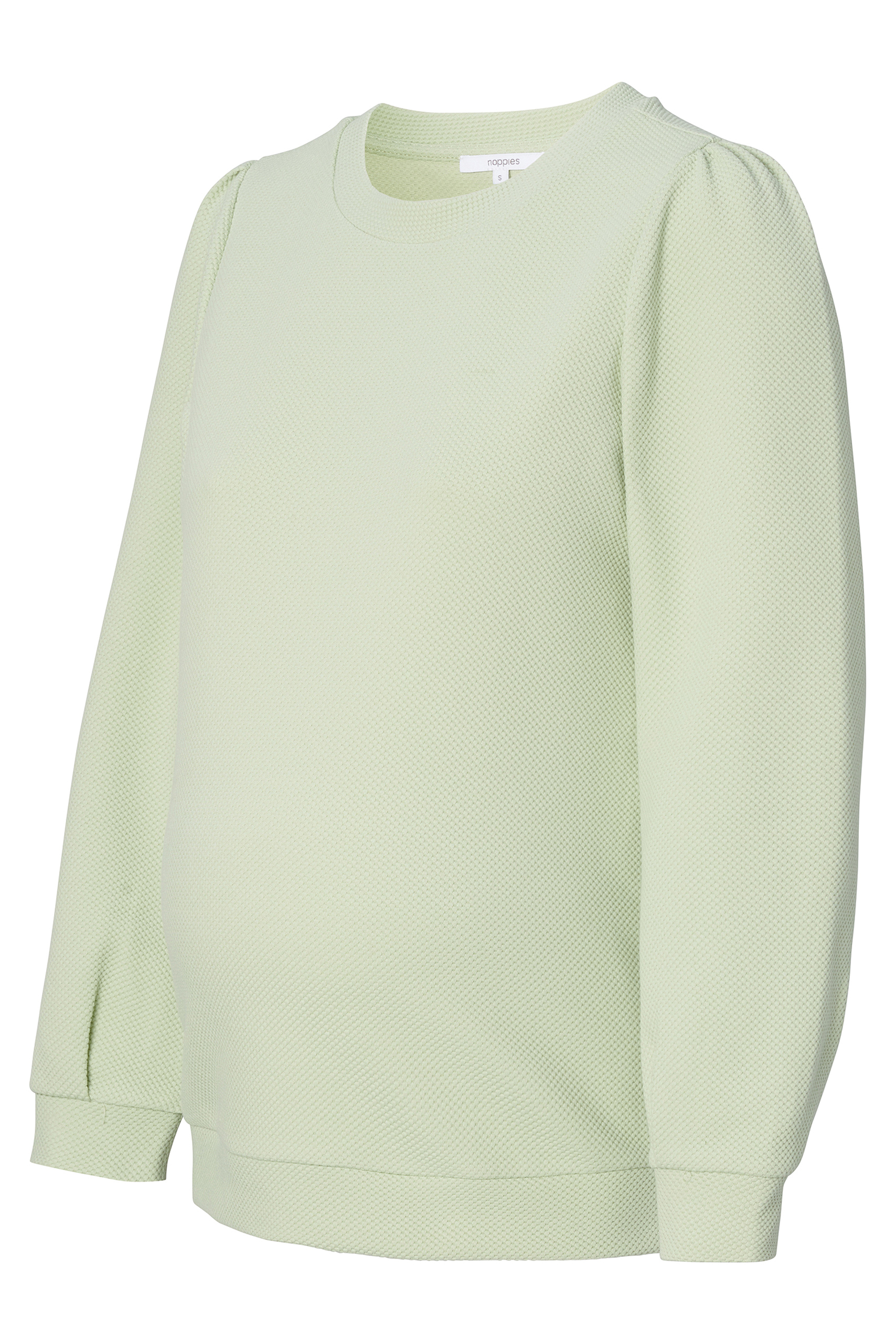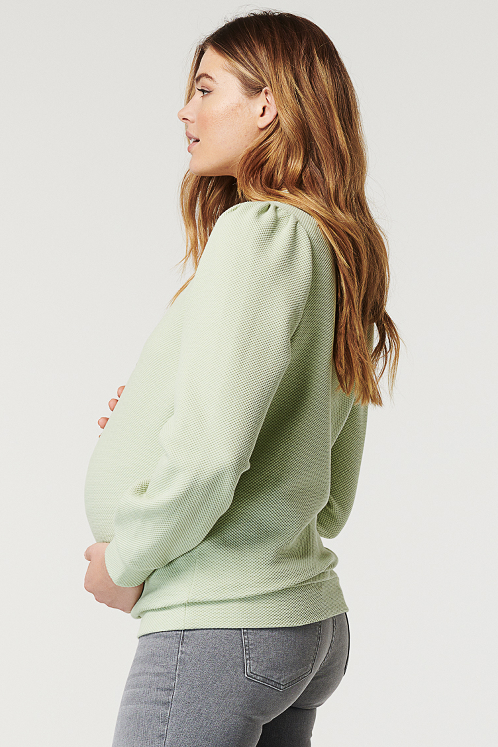 Maternity and nursing jumper made from structured, soft material with narrow puff sleeves. There's plenty of room for your baby bump, no matter which week of pregnancy you wear this high-quality jumper. Hidden zips in the side seams give you easy access to your chest after birth. So you can nurse your baby comfortably and discreetly at any time. Colour: light green
