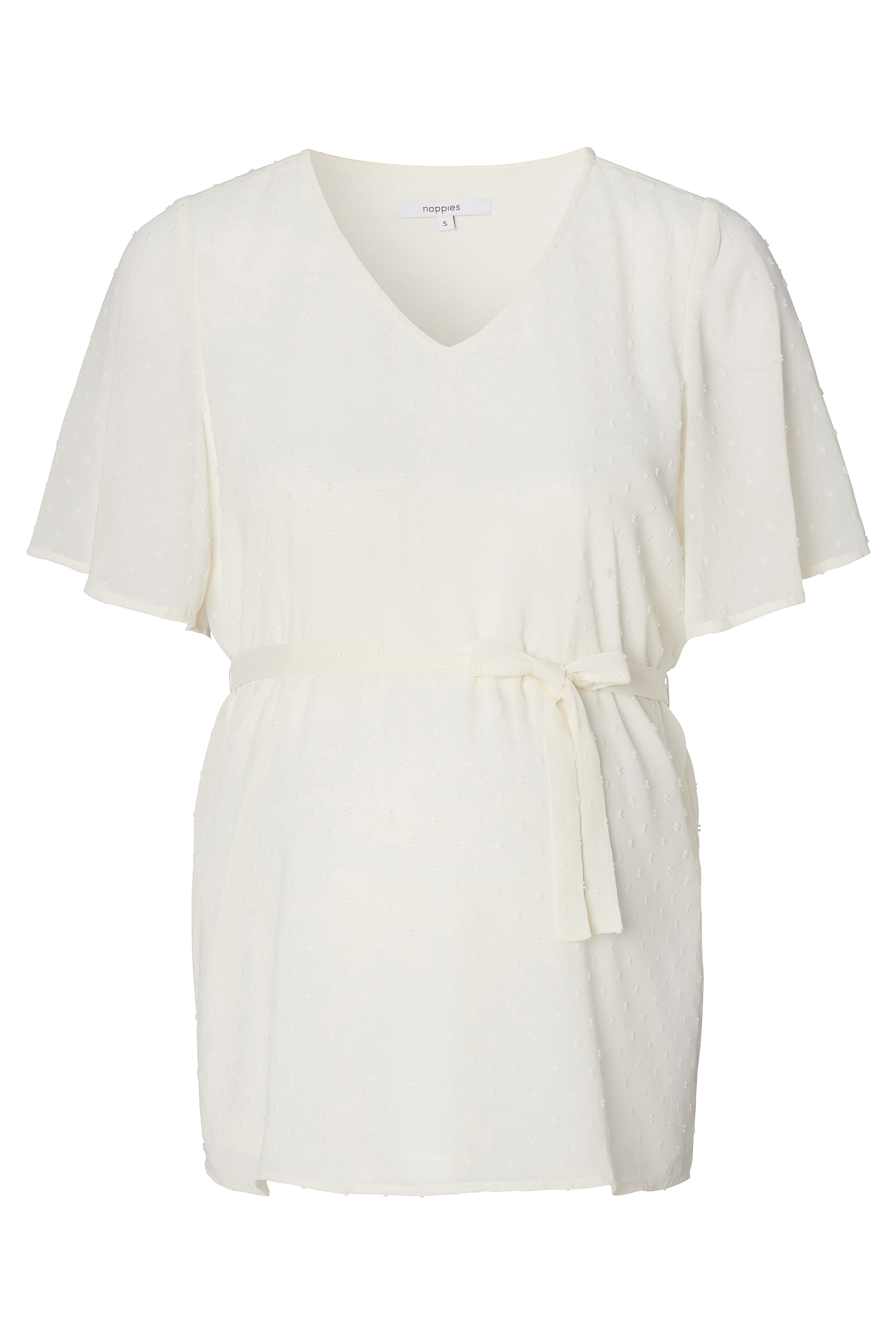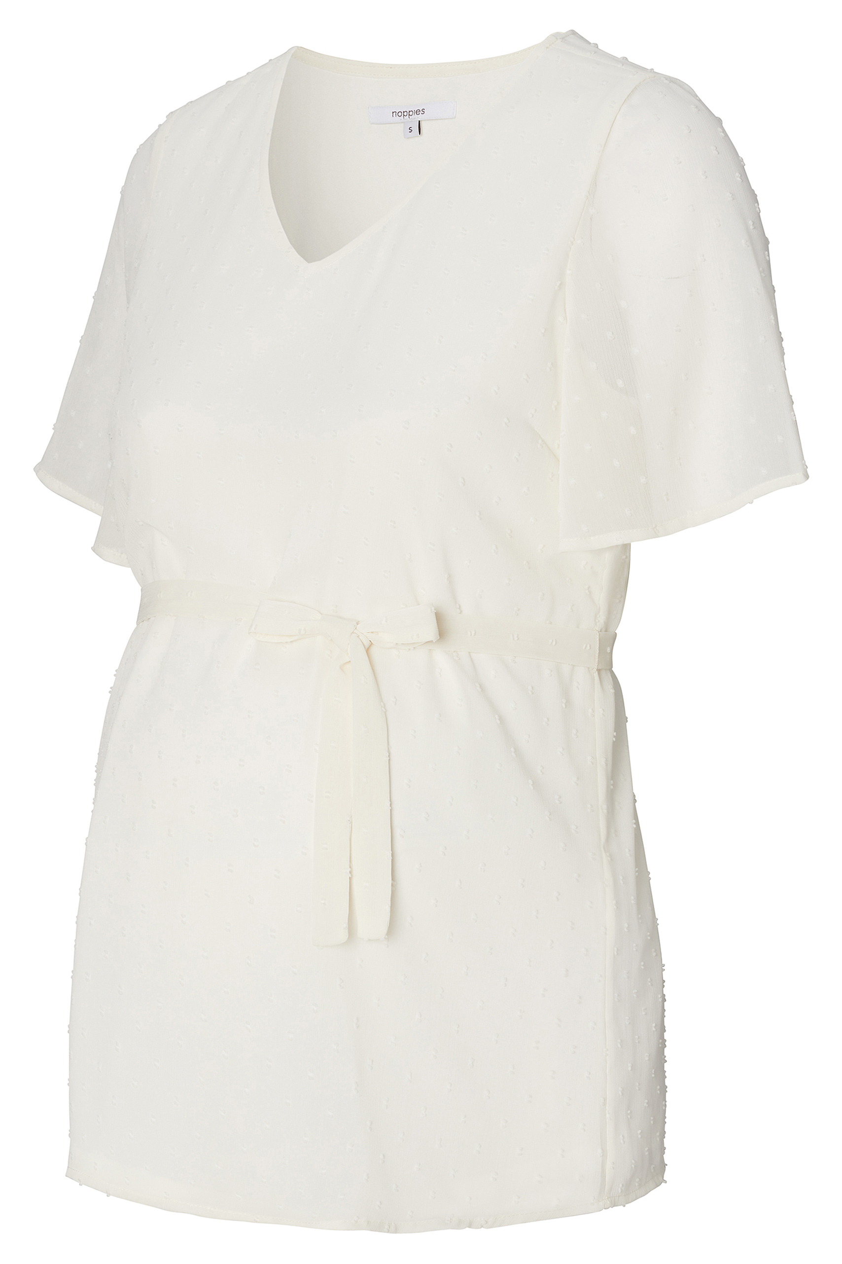 Double layer maternity blouse with V-neck and cap sleeves. The transparent outer fabric is decorated with delicate dots. You can accentuate your baby bump with the tie belt. Combine this feminine blouse with skinny maternity trousers for a festive look. Colour: ecru