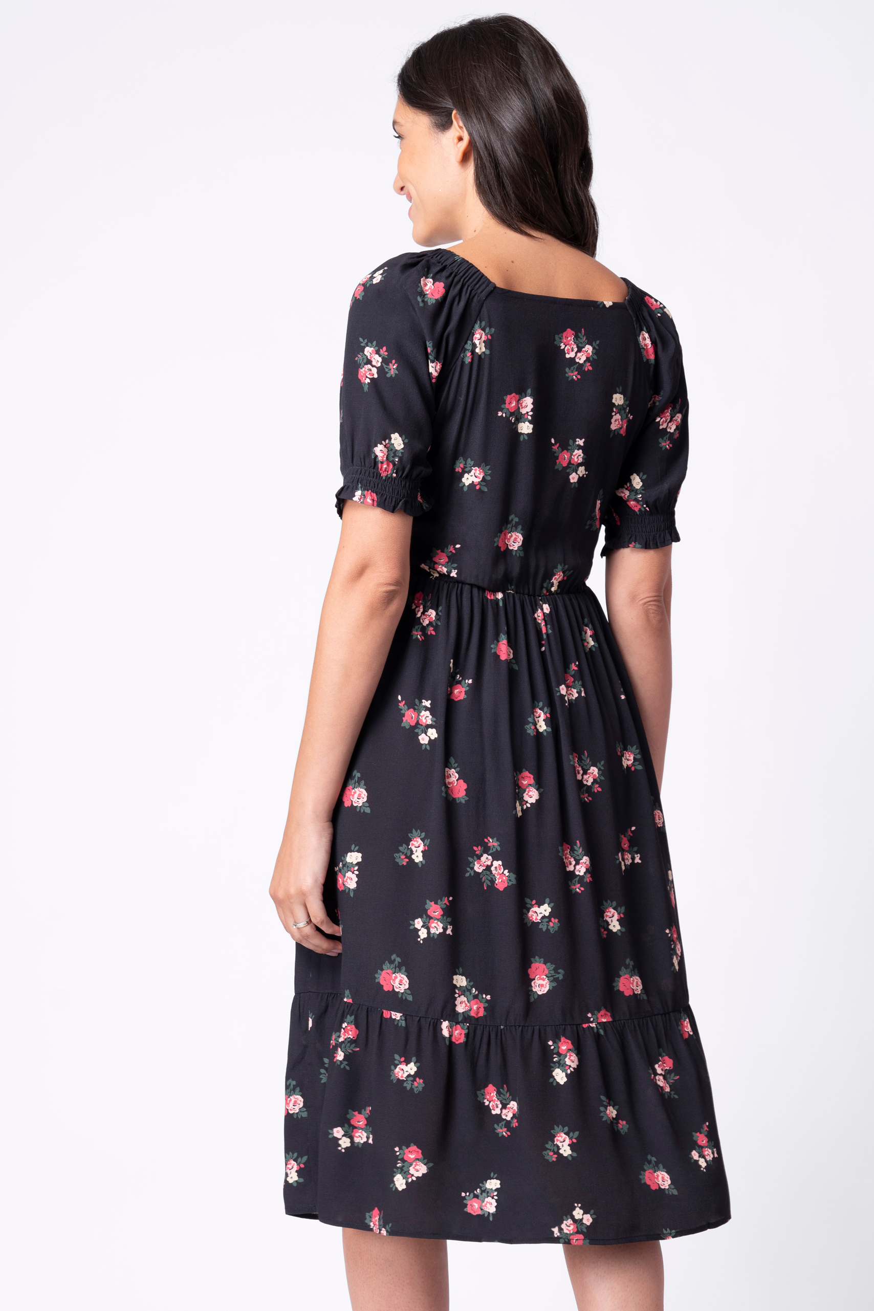 Midi Shirred Maternity and Nursing Dress with Frill Sleeve