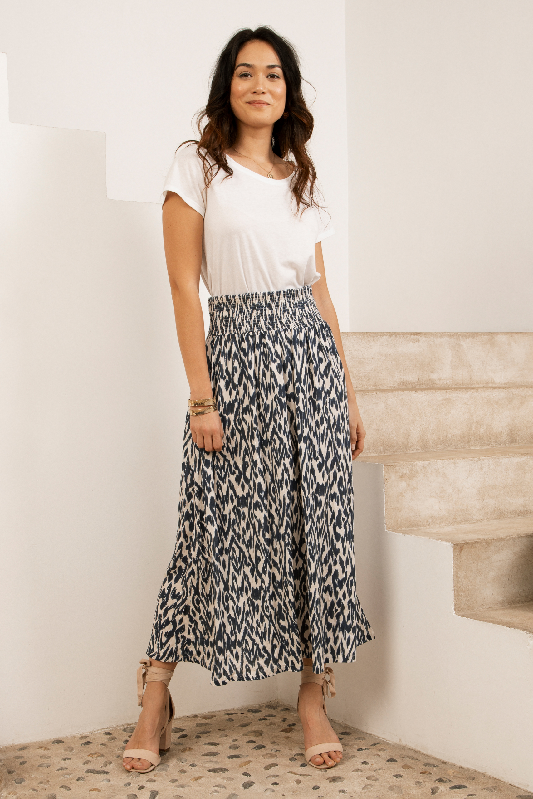 Long maternity skirt with soft smocked waistband and side leg slit. The stretchy waistband can be worn over and under your baby bump and adjusts perfectly to your growing bump. The skirt is designed so that you can wear it without a belly after your baby is born. Colour: Print