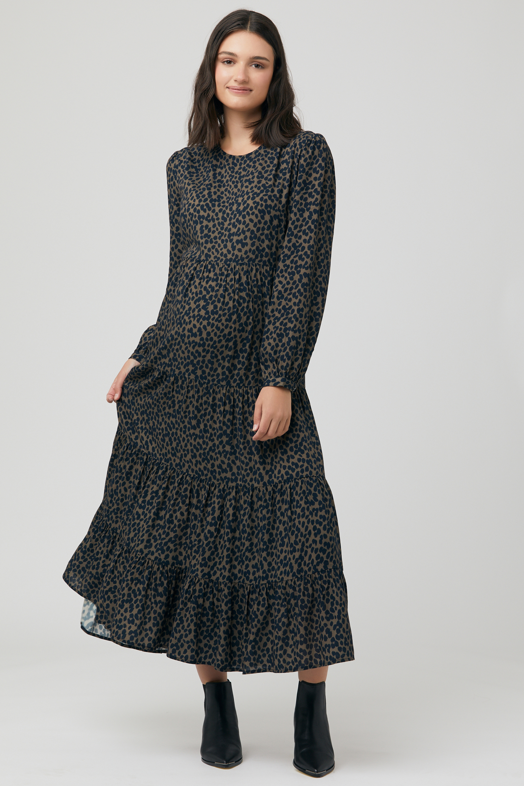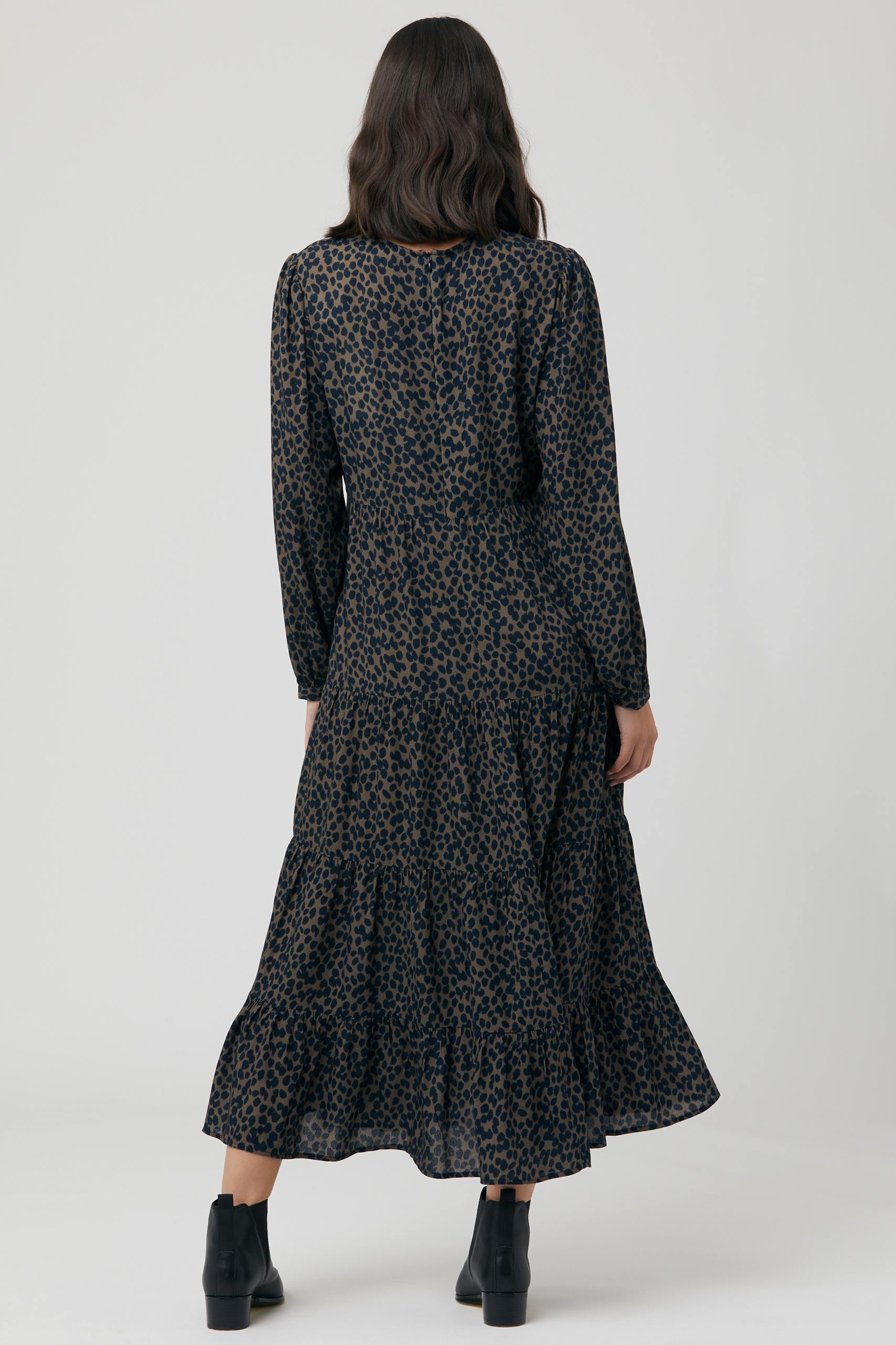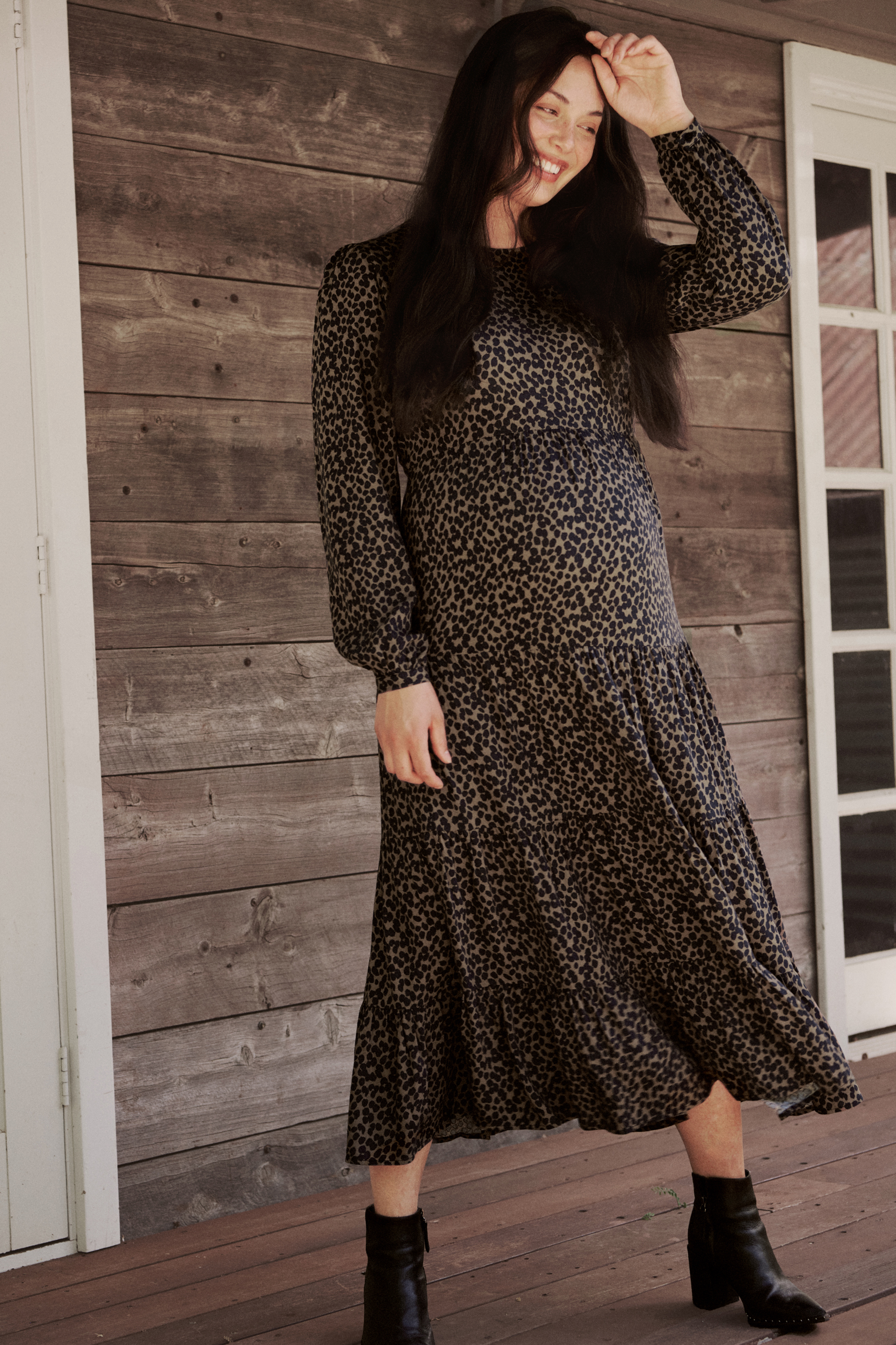 Stylish midi maternity dress made of pleasantly soft viscose and skirt part with flounces. Your baby bump has thanks to the swinging skirt in every phase of your pregnancy enough room to grow. The trendy cut and the beautiful pattern make the dress a real eye-catcher. Color: print