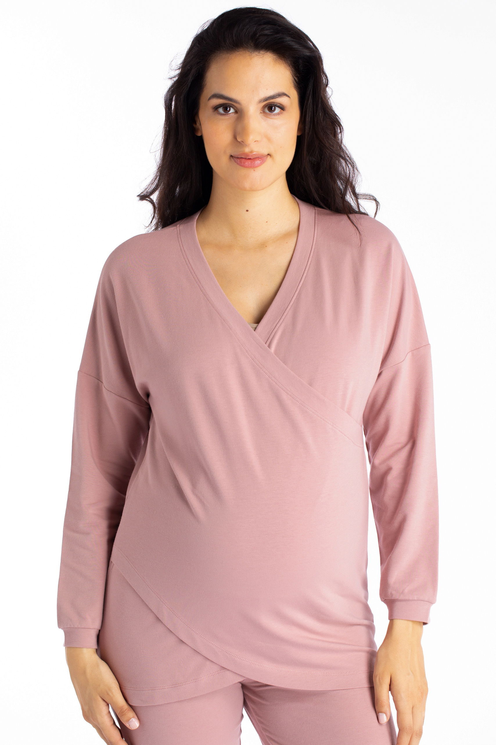 Lounge and pyjama maternity shirt in organic cotton and soft EcoVero™ viscose. During pregnancy, the cross-over design gives your bump plenty of room to grow. After the birth, you can breastfeed comfortably in this long-sleeved shirt. Simply pull down the two layers of fabric separately. Colour: pink