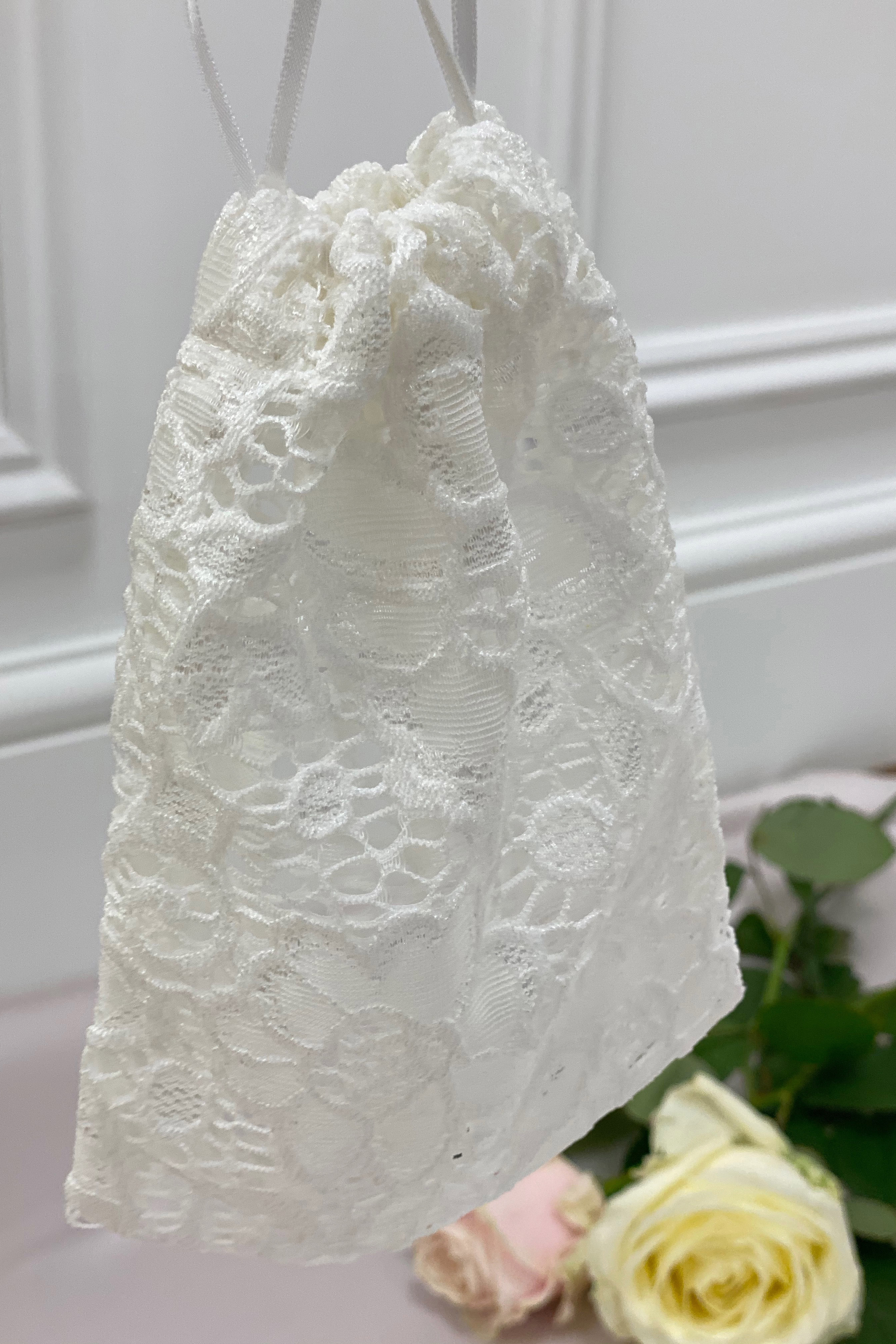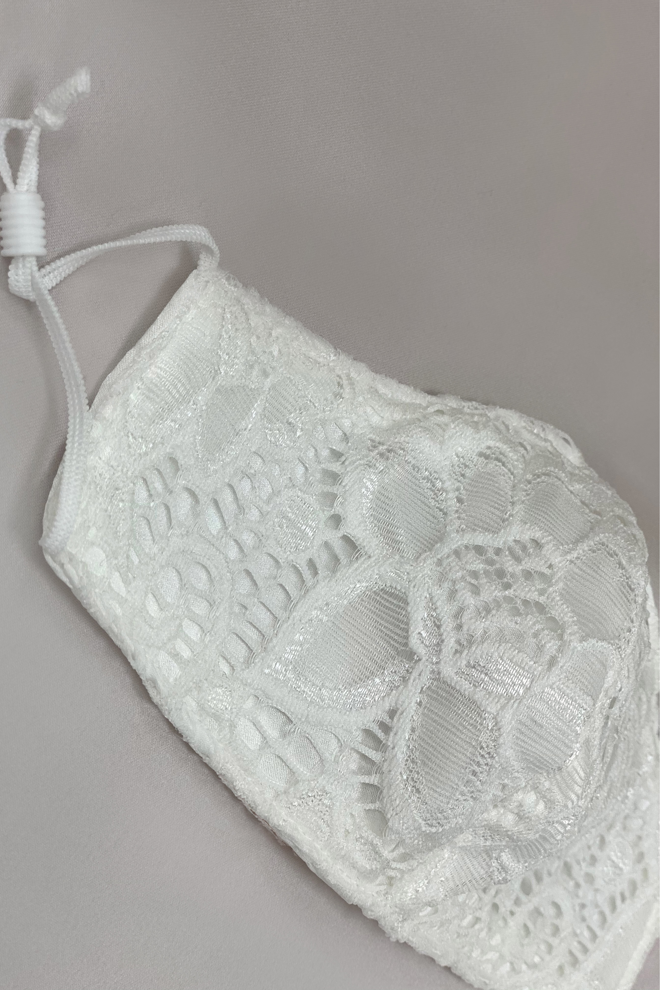 Wedding face mask made of folrale lace of artificial silk. The sustainably produced, handmade face mask consists of three layers of fabric and has a soft, adjustable elastic band for optimal fit and perfect wearing comfort. The mask comes with a matching wrist bag that holds the mask itself as well as other small items like lipstick and tissues. Dimensions of the mask: 19x12 cm. Wrist bag dimensions: 12x16 cm. Color: ivory/white