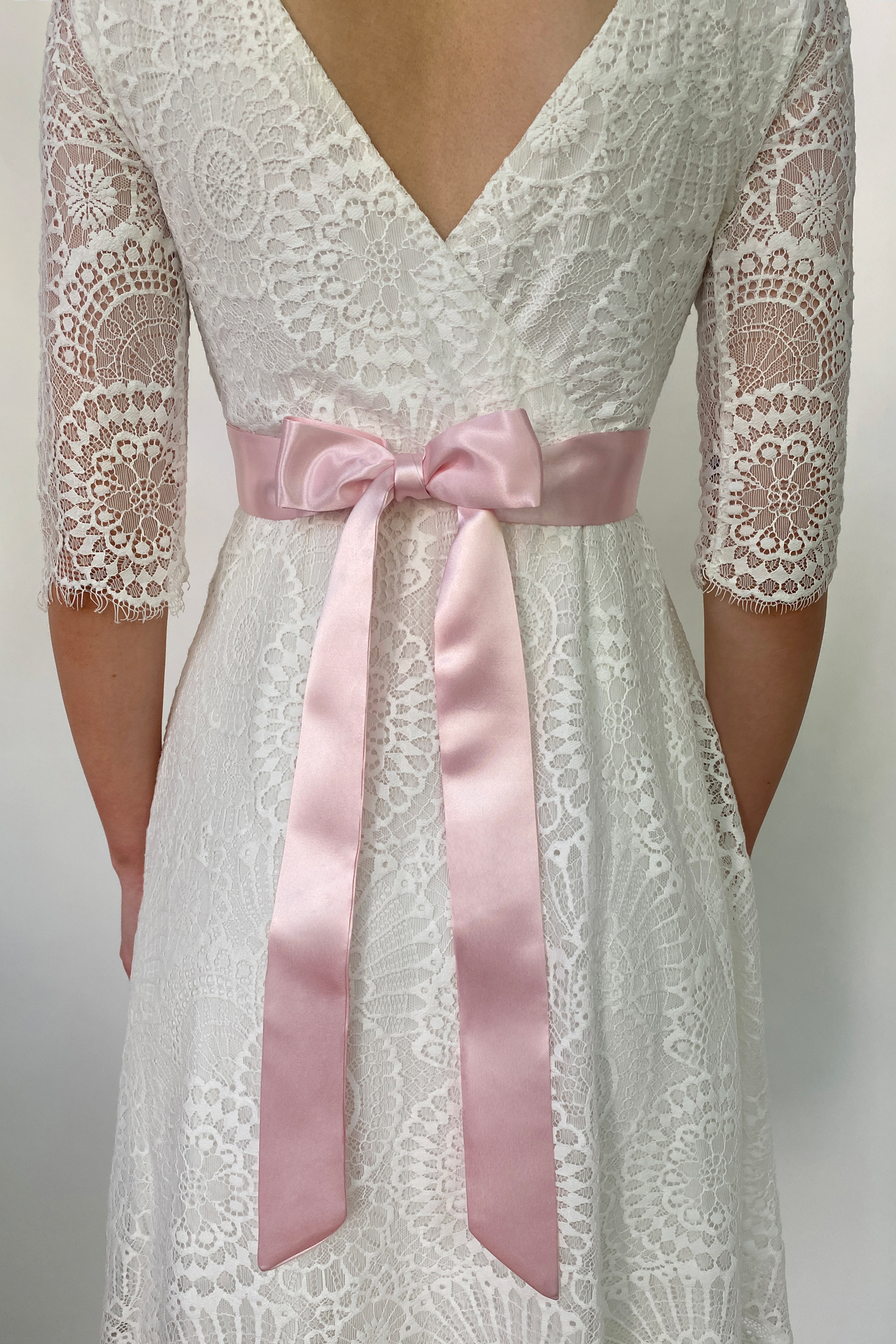 Our model wears the satin sash with our A-line Maternity Wedding Dress with Back Neckline