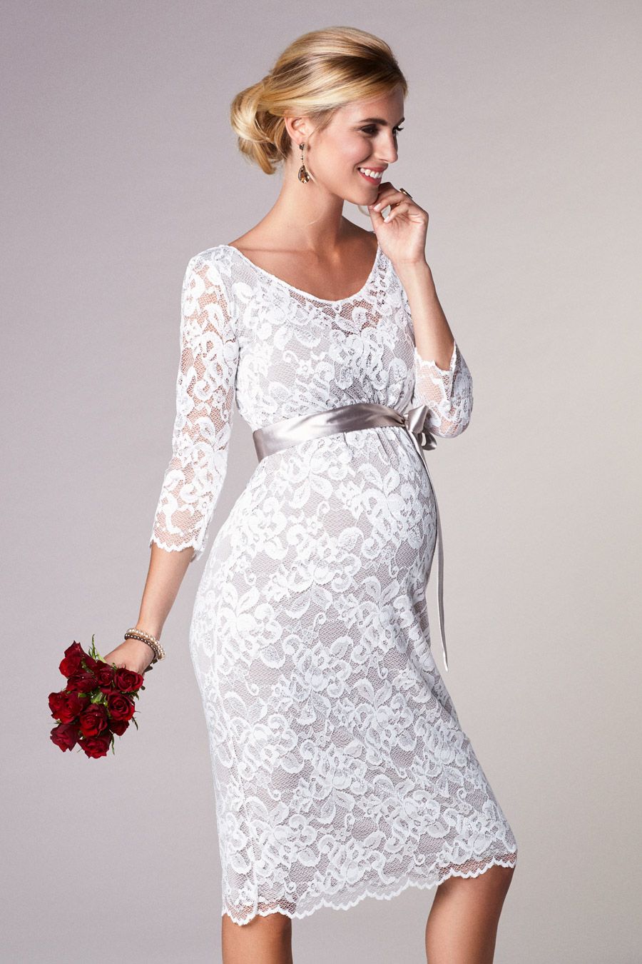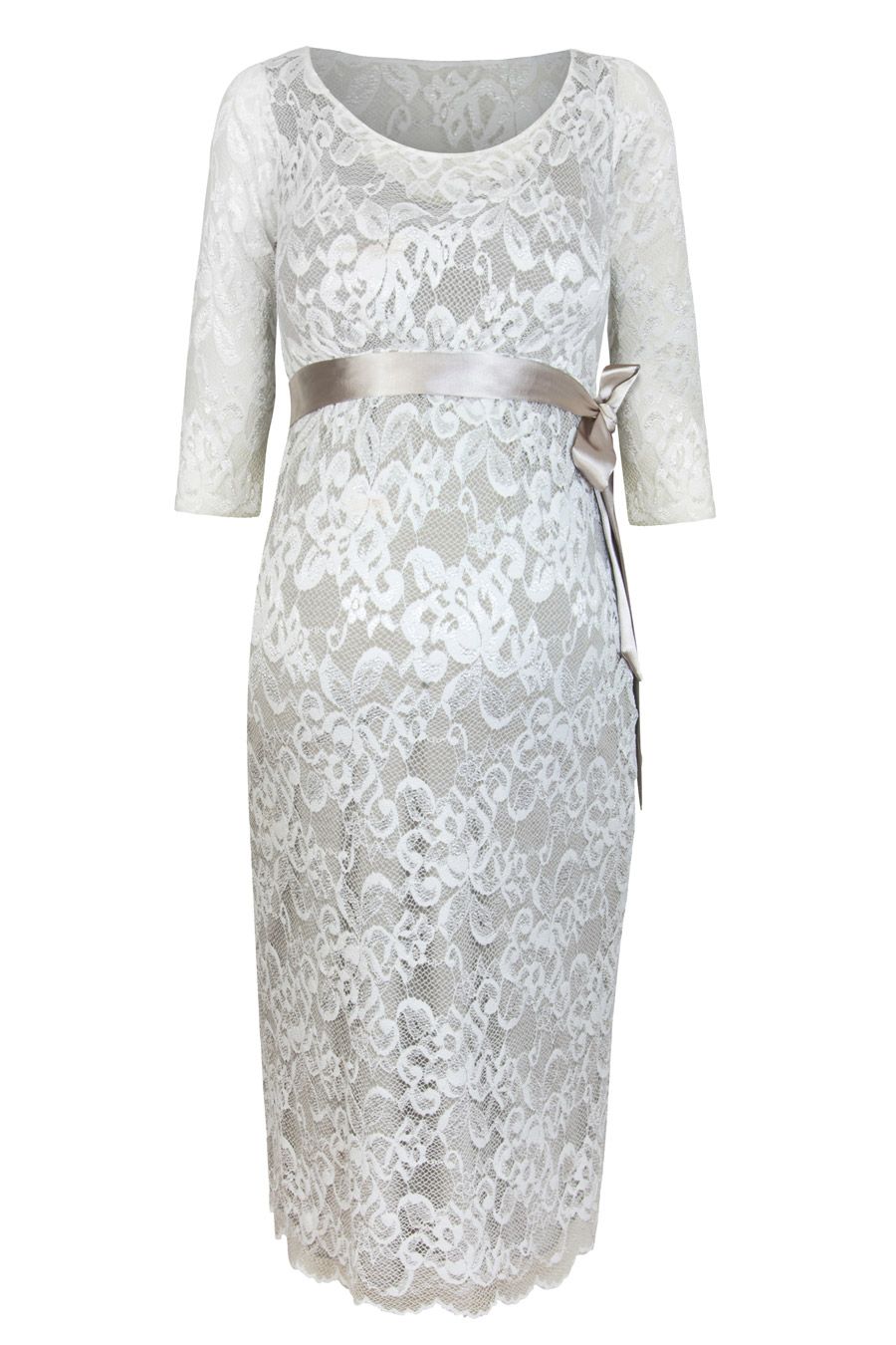 Knee-length maternity wedding dress in lace with a silver coloured petticoat. With a transparent scoop neck and 3/4 sleeves. The dress comes without a sash. Care instructions: Should not be washed in the machine, please dry clean. Colour: ivory