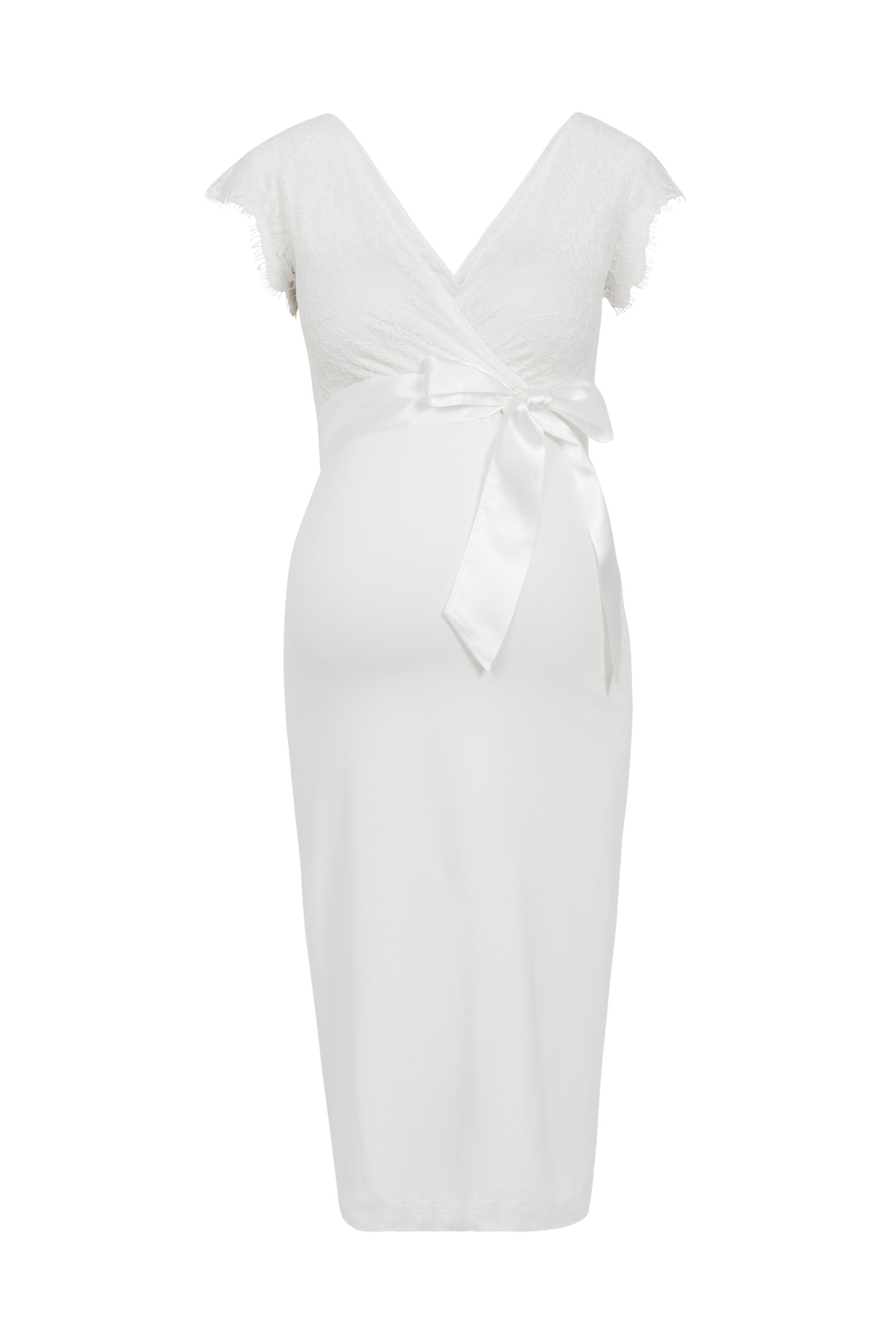 Form-fitting maternity wedding dress with short, sheer sleeves and lace trim on the bustier. The dress has a Cache Coeur neckline in the front and back and the empire line can be emphasised with the sash. Colour: ivory