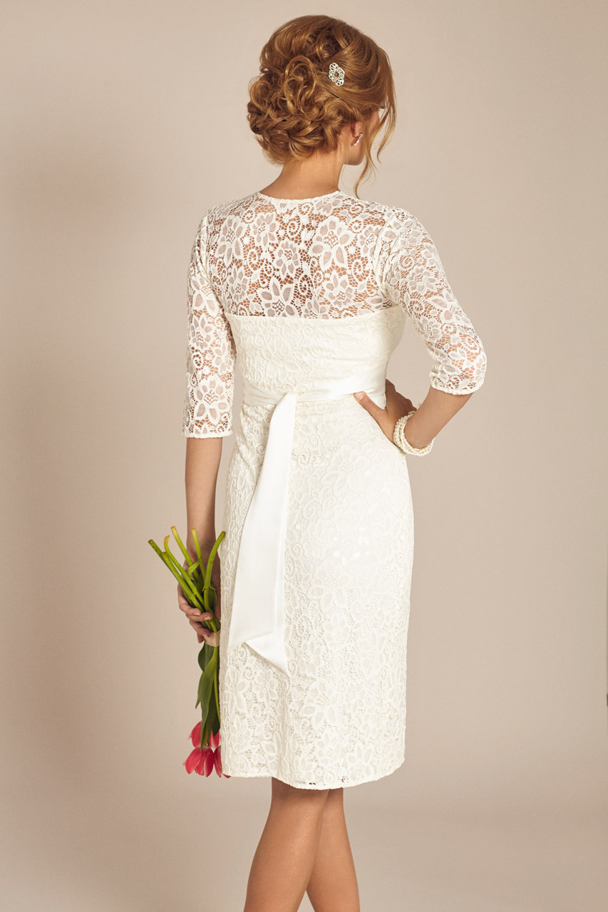 Figure-flattering maternity wedding dress with v-neck. The empire line can also be enhanced by the removable sash. The drsss comes without a sash. Colour: ivory