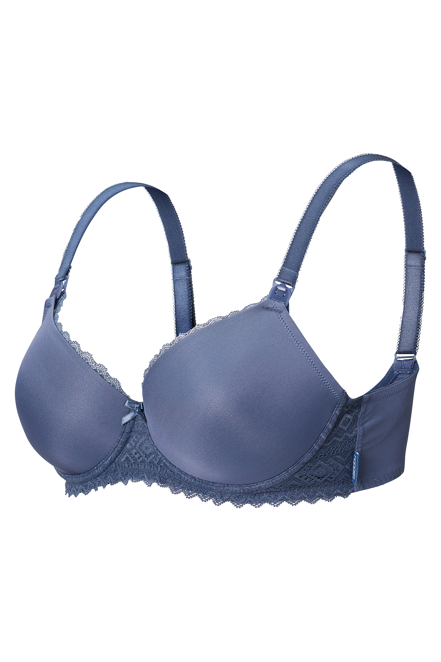 Nursing bra with soft cups and lace. They can be simply folded down with the aid of the nursing clips and thus offer optimum breastfeeding access. Harmonises perfectly with the dark blue maternity briefs with lace. Colour: blue